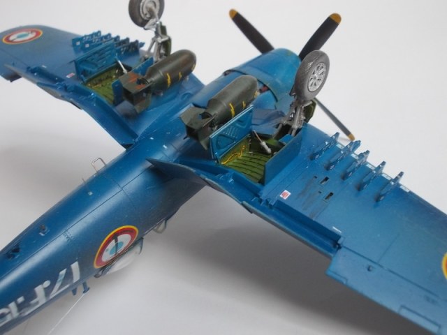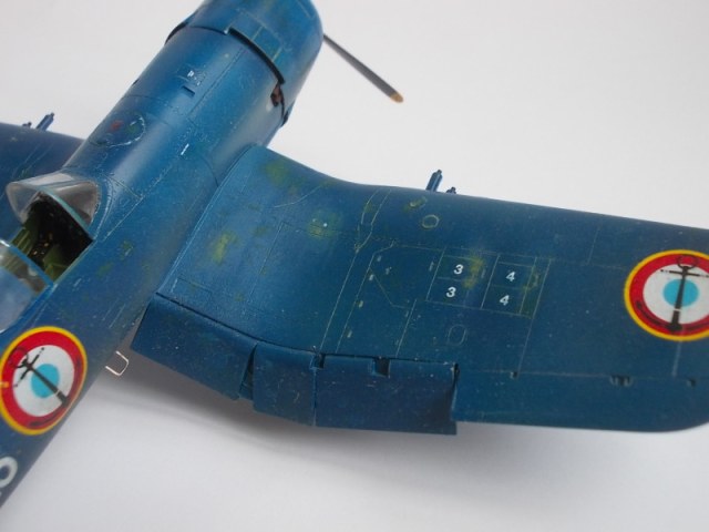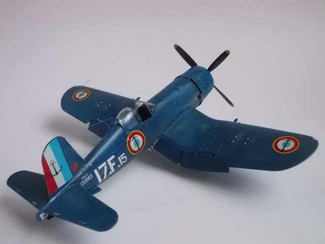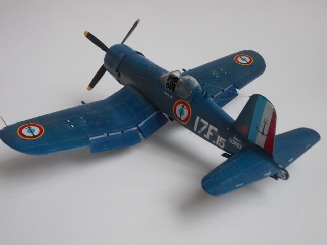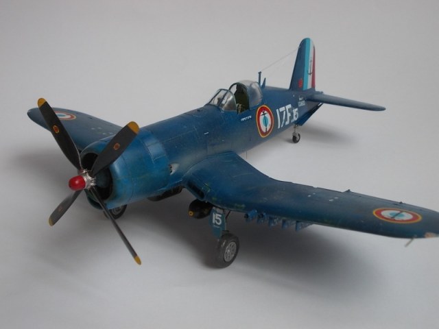 Здравствуйте,коллеги! Всем известны американские "Корсары,а вот F4U-7 строился по заказу Франции и собирался из заделов AU-1 и F4U-5NL,но внешне остался таким же симпатичным.Представлена модель самолёта из 17 Флотилии,во время войны в Алжире,в 1959г.Сама модель имеет родословную от Хасегавы,с известным качеством,поэтому сборка проблем не доставила,была доработана кабина,стойки и ниши шасси.А вот покраска пошла не так,как хотелось бы.Загрунтовал автогрунтом,сверху цинк-хромат и синяя нитра,всё легло хорошо.А вот однокомпонентный автолак что-то не хотел сохнуть.Поэтому и декали не хотели нормально привариваться.Самое неприятное было в том,что модель немного "липла" к пальчикам,,но следы затирались влажным тампоном. Но удалось всё это победить и было принято решение установить модель в акриловый бокс,но это в будущем.А пока представляю вам,что получилось.
