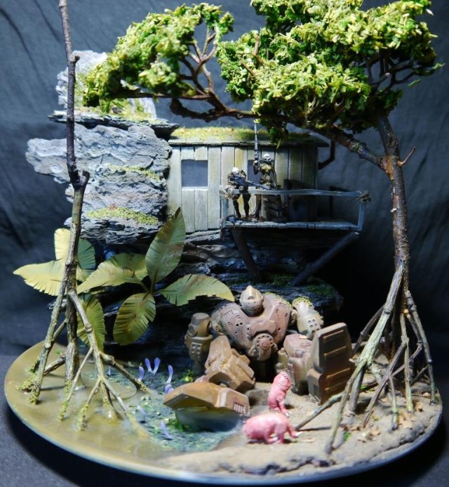 Очередная поделка на вольную тему. Случайно разбил тарелку и решил её не выкидывать, а чего-нибудь с ней сотворить. Вся работа в основном из подручных материалов - палочки, песочек, мох, сосновая кора. Робот - немного перелепленная китайская игрушка за 50 руб. Фигурки снайперов - миниатюры от производителя Corvus Belli, для настольного варгейма Infinity. Злобные зубастые свинособаки от Hasslefree miniatures.