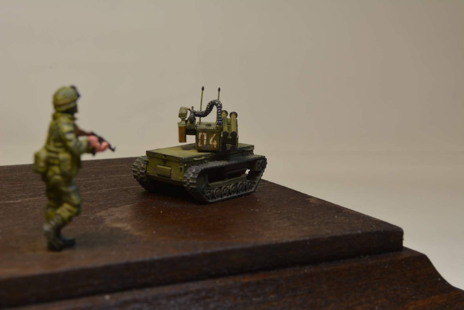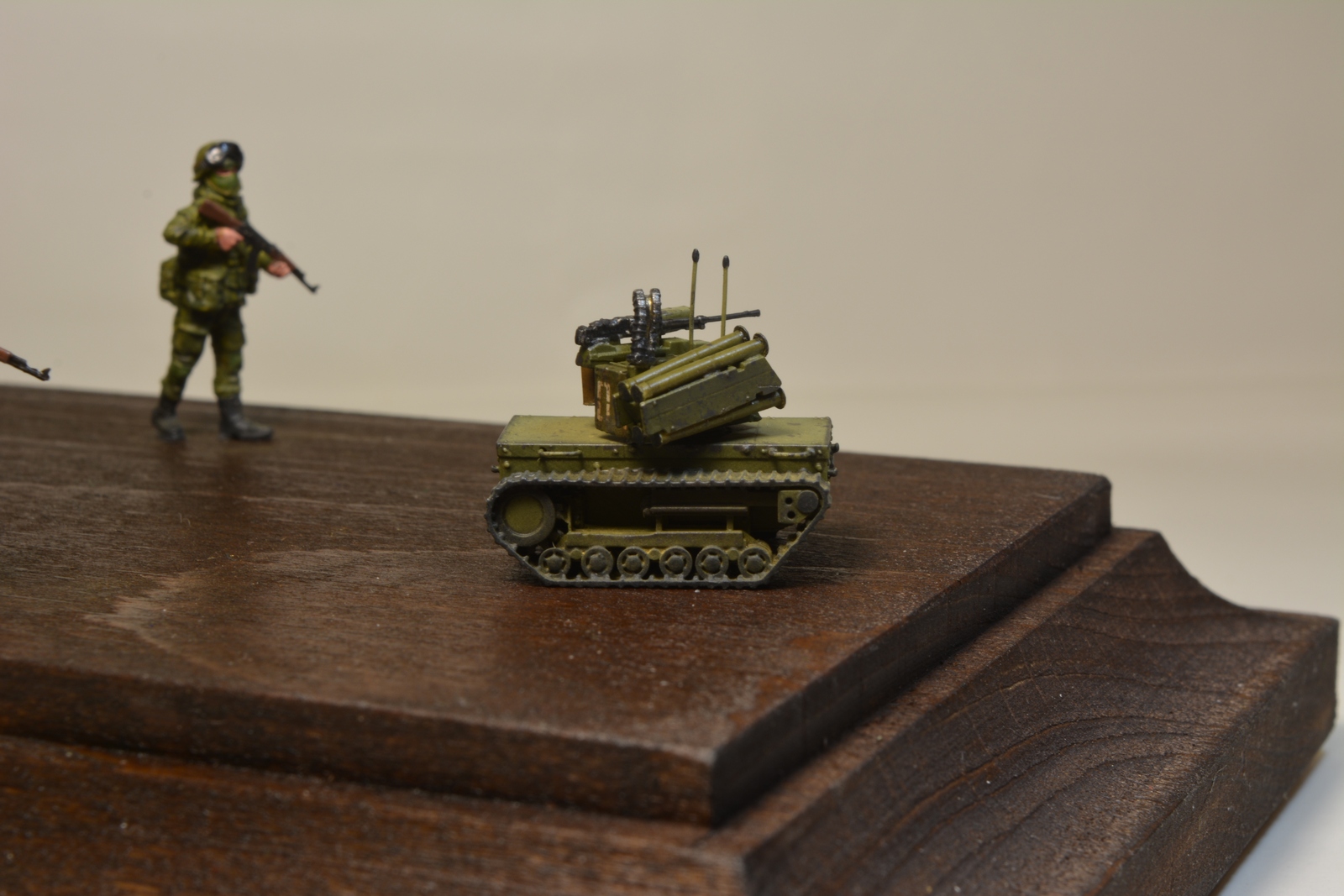 Вашему вниманию представляется отделение Морской пехоты ВМФ усиленное боевым роботом "Платформа-М" в масштабе 1/72. Модель производства Alex Miniatures В комплекте шел собственно сам робот и пять солдат. Сборка не сложная но часть деталей пришлось подгонять, РПГ установленные на роботе не хотели смотреть в одну сторону, а патронный рукав пришлось гнуть в кипятке для придания нужной формы. Гусеницы отлиты целиком с подвеской. Присутствовал облой, пришлось шкурить. Антенны и поручни изготовил из проволоки. Окраска акрил Тамир и мр. Хобби. Если верить интернету то робот находится на вооружении Балтийского и Тихоокеанского флотов, поэтому было решено нанести знак принадлежности к ВМФ и тактический номер. Так же решил нанести сколы и потеки.