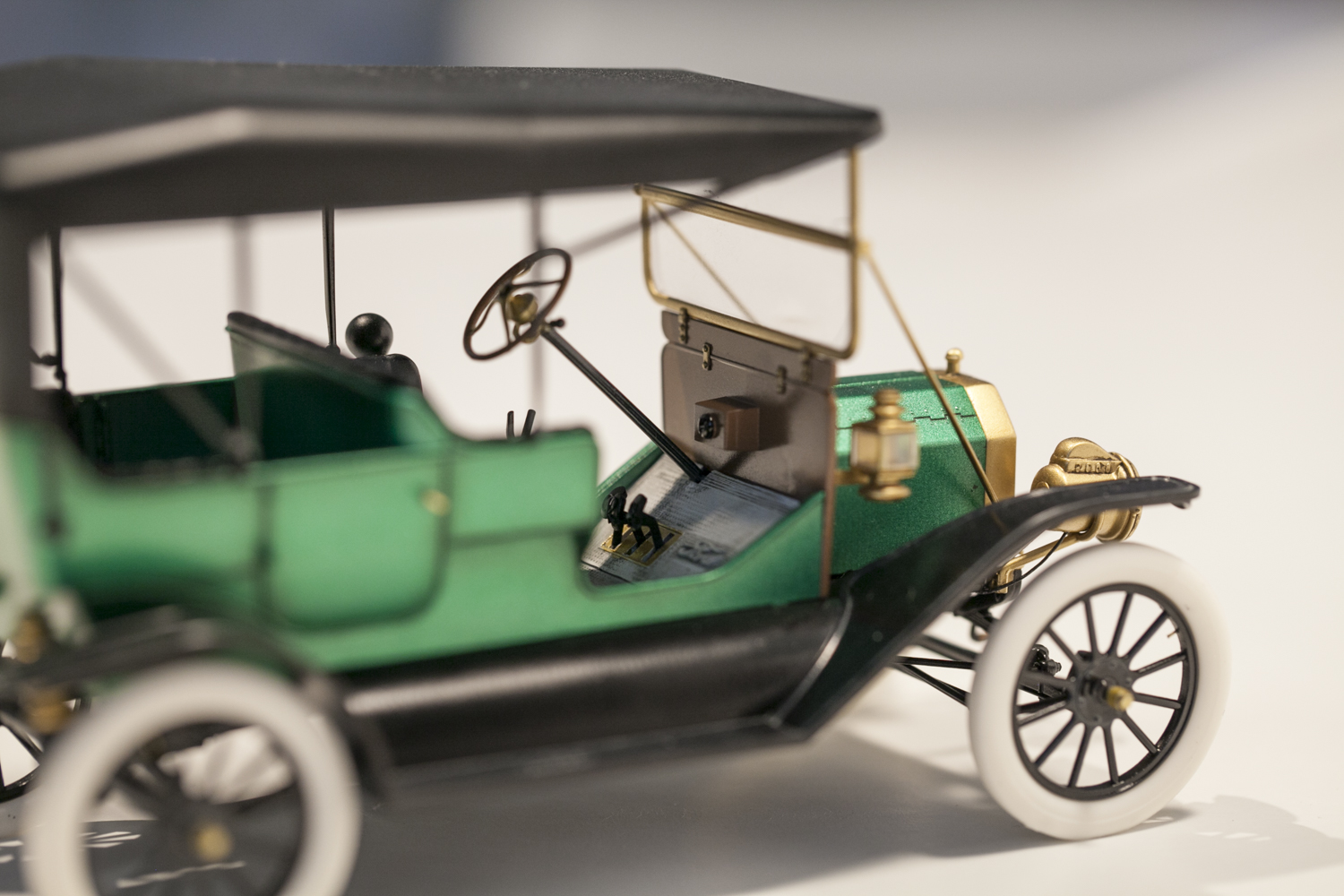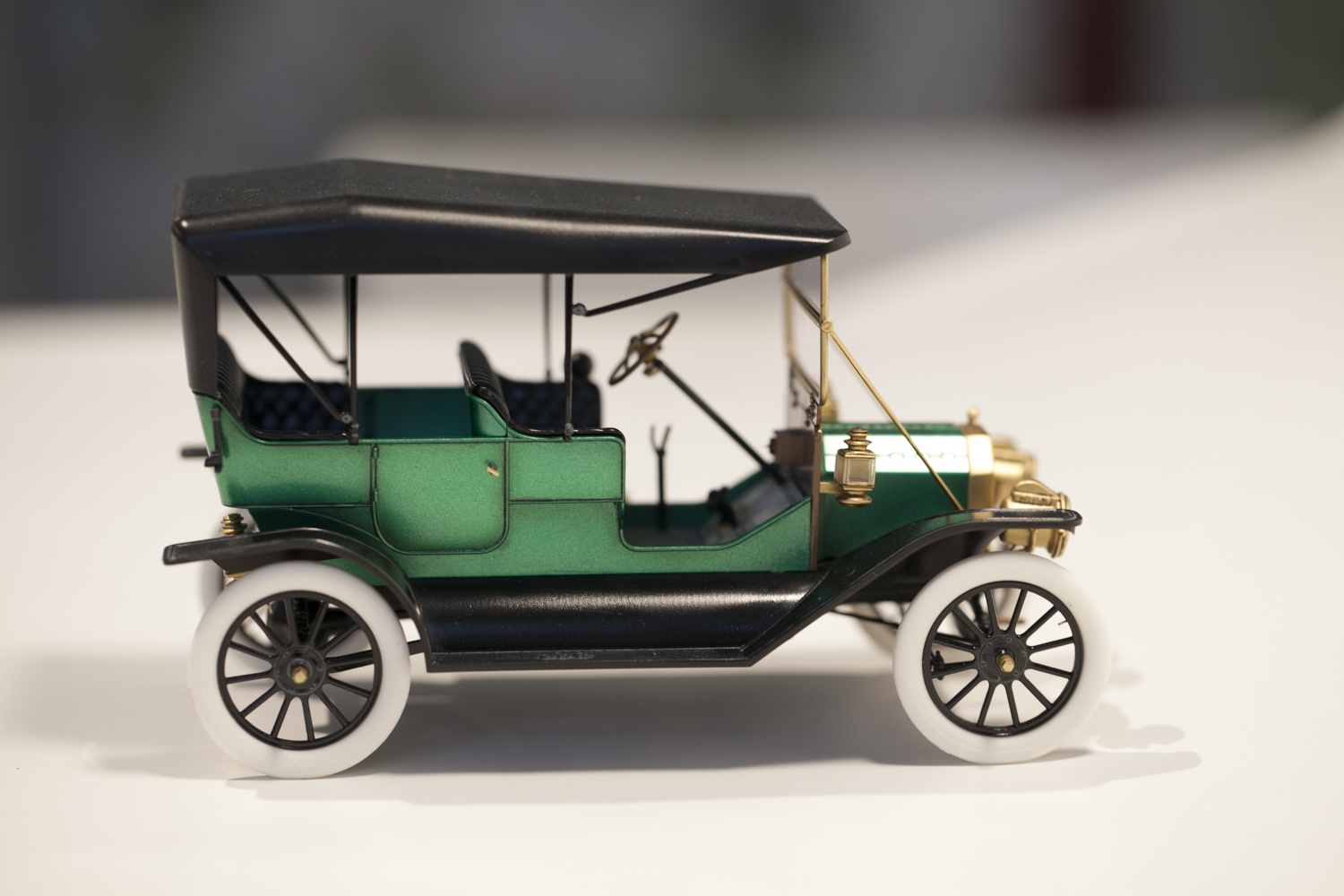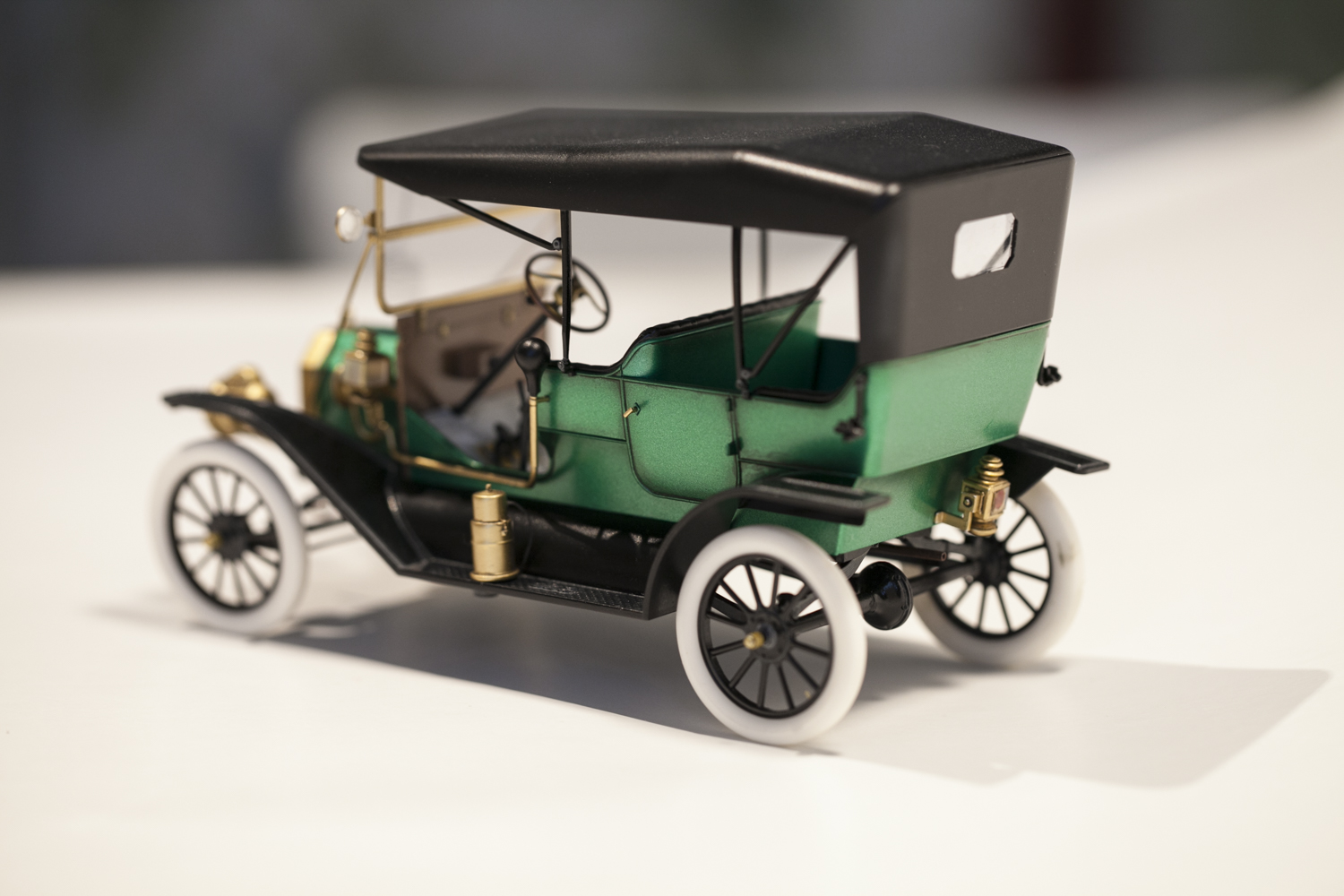 Представляю вам модель Ford T от ICM в масштабе 1/24. На этой модели я попробовал окраску спиртовым акрилом (зеленый металлик) от тамии который разбавлял lacquer thinner от тамии же. Краску и разбавитель смешивал 50 на 50, результат меня очень порадовал. Краска ложится очень ровно, ни намека на шагрень, сохнет очень быстро. После высыхания прошелся тамиевской полиролью по кузову.