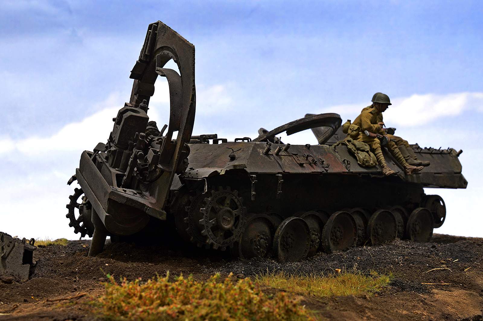 Продолжаю тему Курской дуги. Небольшая композиция, сделанная по хронофото. Вся композиция в целом это частичная импровизация, т.к. до конца не понятно, что на самом деле было с башней. Её на фотографии из хроники не видно совсем. Так что башня полностью моя фантазия. Можно было бы обойтись без неё, но так, как по мне, интереснее.