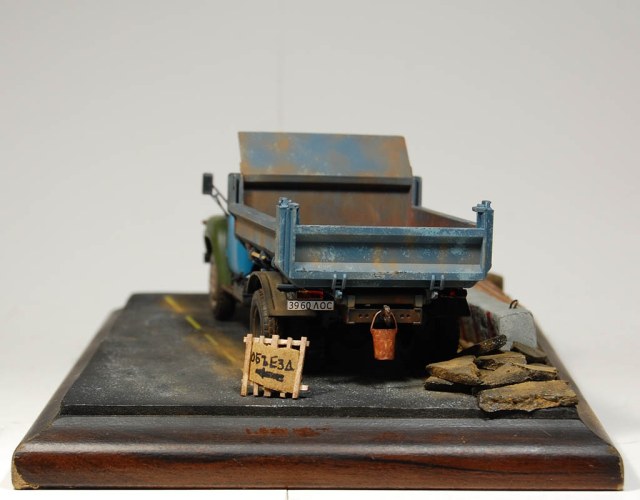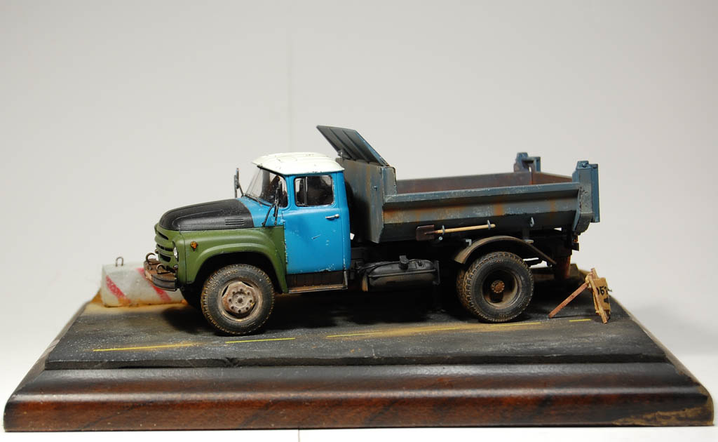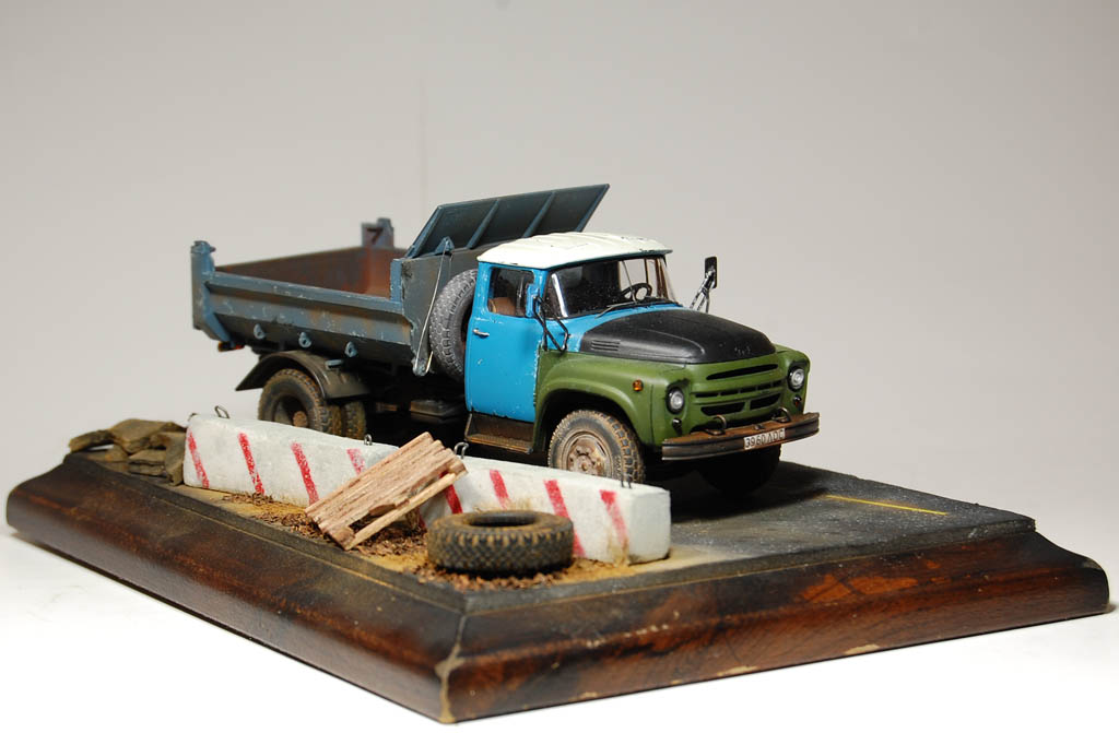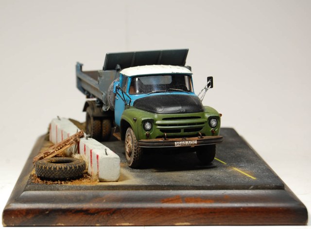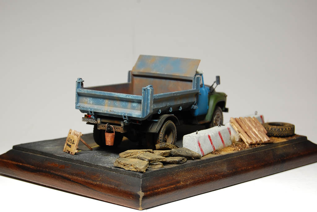 Здравия всем!Вот собрал самосвал,сделал подставку,долго тупил,что на неё поместить и вышло как то так!)Красилось Тамией,пылилось пигментами ЗиП,использовался сухой чай).