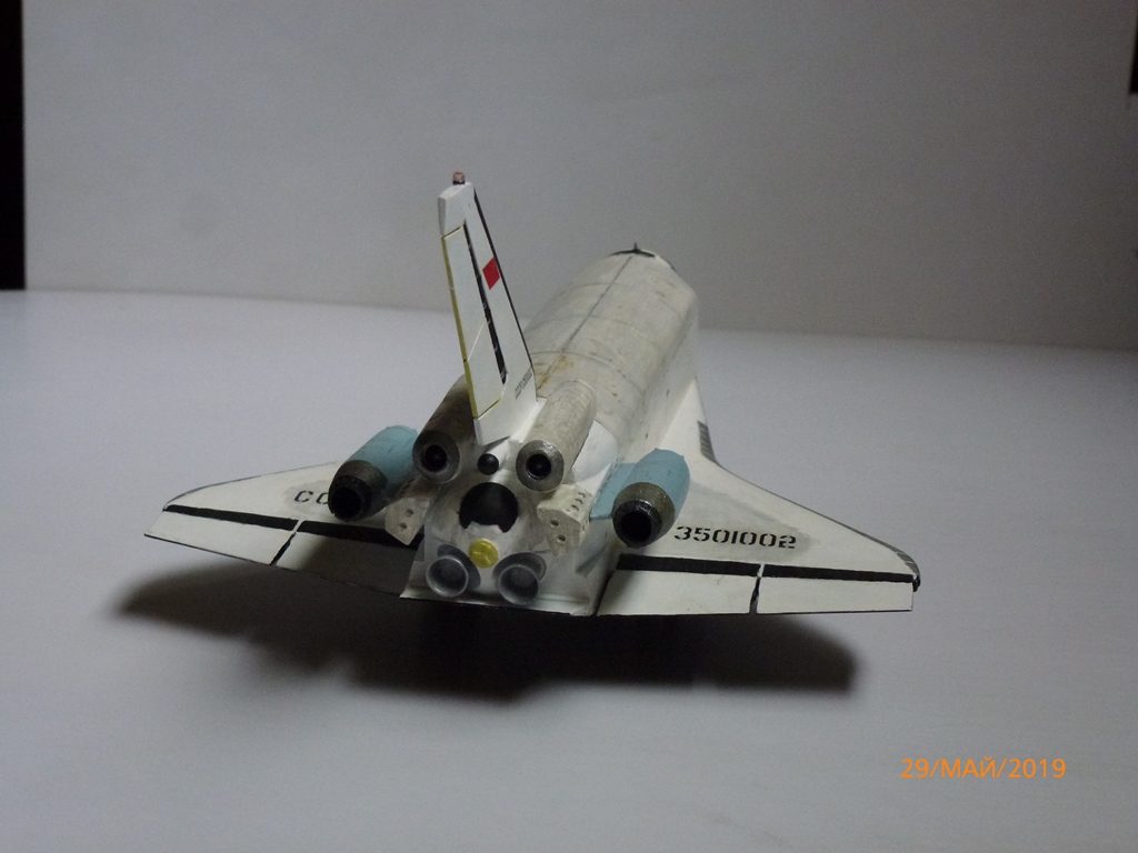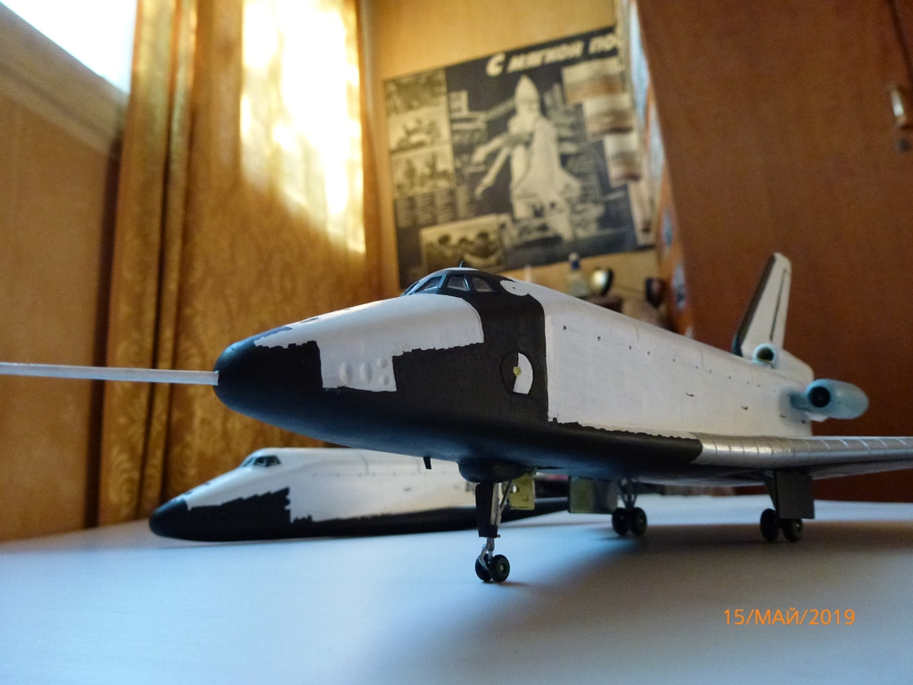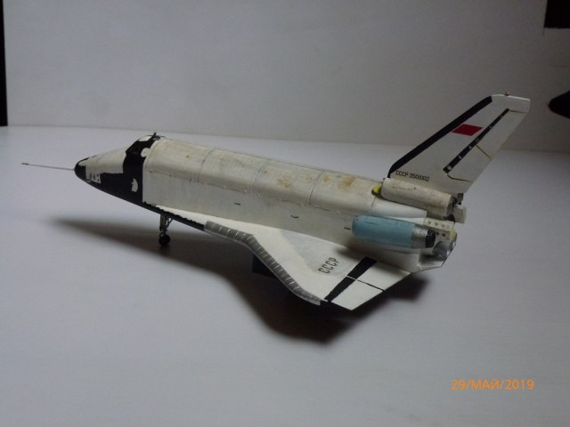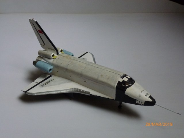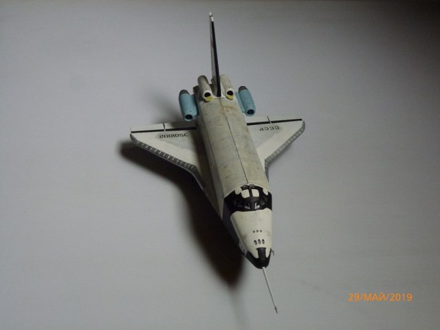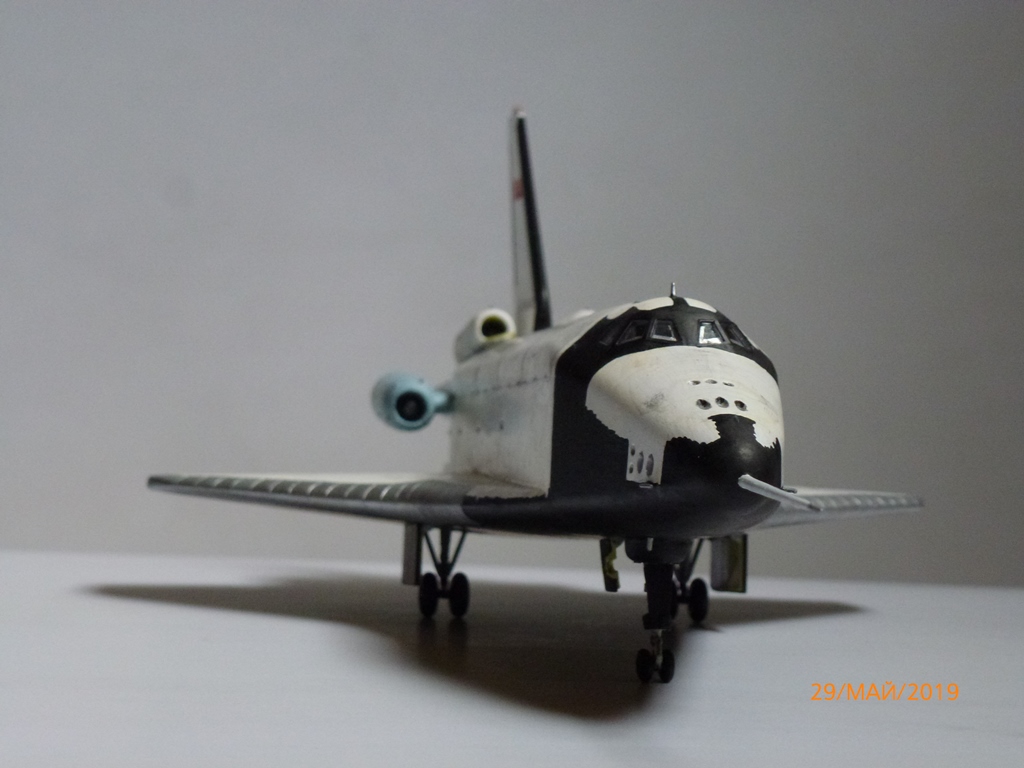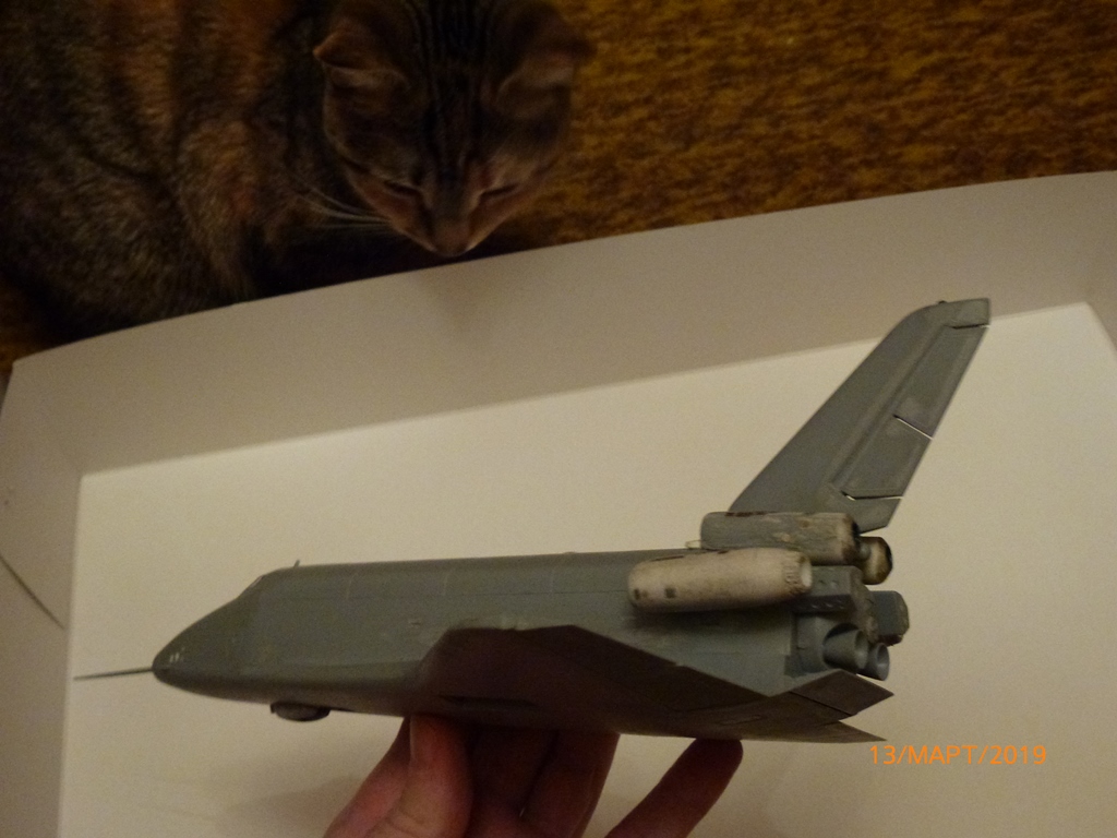 Ну и коротко о работе - в основе модель Бурана АРК. Сделал кабину, но её там не видно. Треугольный люк в центре хвоста опилил до круглого. Исправил профиль крыла, прошкурив насквозь пластик в районе излома. Изнутри - шпаклёвка. Прорезал щели между элевонами. Детализировал ниши шасси и сделал новую переднюю стойку. Обтекатель стойки и двигатели самодельные, вырезал из ПВХ. Доработал шитки ниш шасси. Укорочены балансировочный щиток (до симметрии) и сопла ЖРД в хвосте - это была имитация типа "ведро". Насверлил недостающие имитации сопел рулевых ЖРД. Красил кисточкой для имитации плиток, там поверхность в реале была грубоватая. Окраской как всегда несколько подпортил, но опыт набирается потихоньку. Тут пробовать было не на чем - все другие модели обычных гладких самолётов крашу аэрографом. Ничего, кроме фотографий на БТС нету - это добавило сложности в работе. Проекции с сайта Буран.ру на поверку оказались просто рисунком. Трудно было определять размеры и форму новых деталей. Спасибо большое Алексею за декали! Хотелось бы сопла боковых двигателей сделать поточнее, но не хватило ювелирности. Может из смолы появятся - поставлю.