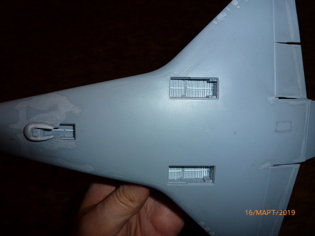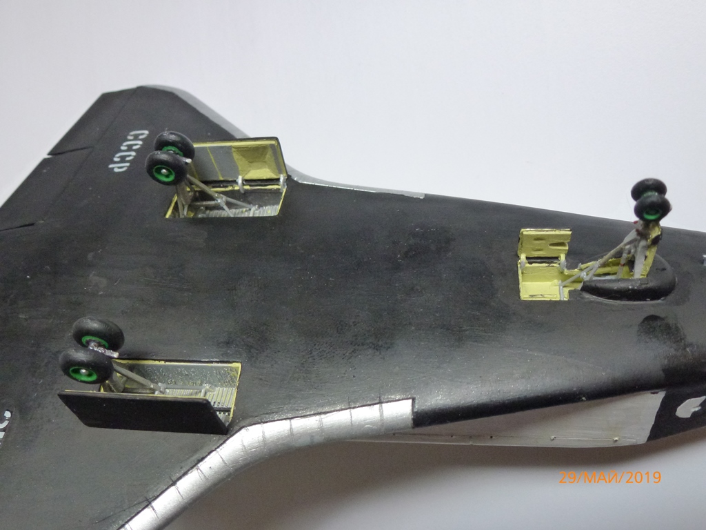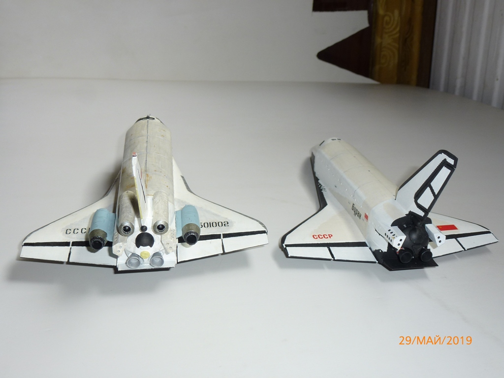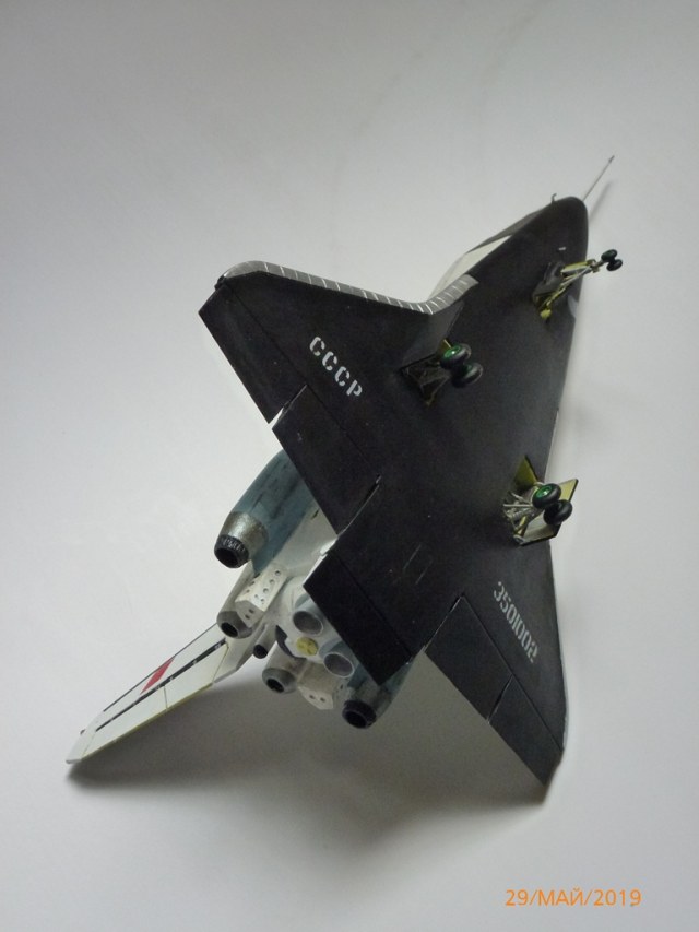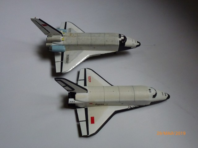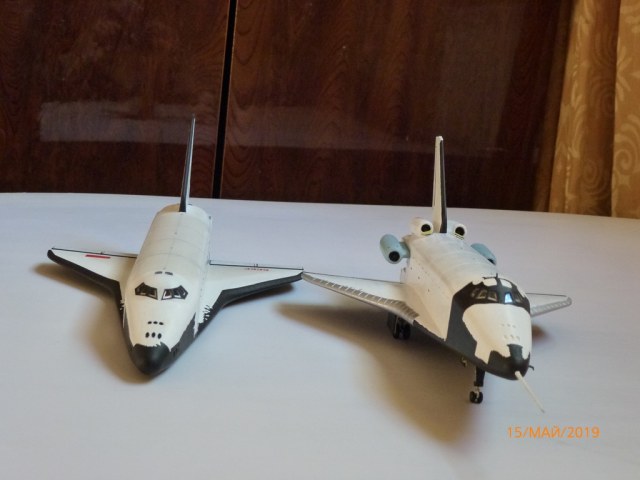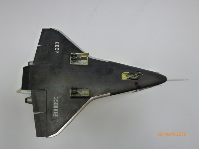 Ну и коротко о работе - в основе модель Бурана АРК. Сделал кабину, но её там не видно. Треугольный люк в центре хвоста опилил до круглого. Исправил профиль крыла, прошкурив насквозь пластик в районе излома. Изнутри - шпаклёвка. Прорезал щели между элевонами. Детализировал ниши шасси и сделал новую переднюю стойку. Обтекатель стойки и двигатели самодельные, вырезал из ПВХ. Доработал шитки ниш шасси. Укорочены балансировочный щиток (до симметрии) и сопла ЖРД в хвосте - это была имитация типа "ведро". Насверлил недостающие имитации сопел рулевых ЖРД. Красил кисточкой для имитации плиток, там поверхность в реале была грубоватая. Окраской как всегда несколько подпортил, но опыт набирается потихоньку. Тут пробовать было не на чем - все другие модели обычных гладких самолётов крашу аэрографом. Ничего, кроме фотографий на БТС нету - это добавило сложности в работе. Проекции с сайта Буран.ру на поверку оказались просто рисунком. Трудно было определять размеры и форму новых деталей. Спасибо большое Алексею за декали! Хотелось бы сопла боковых двигателей сделать поточнее, но не хватило ювелирности. Может из смолы появятся - поставлю.