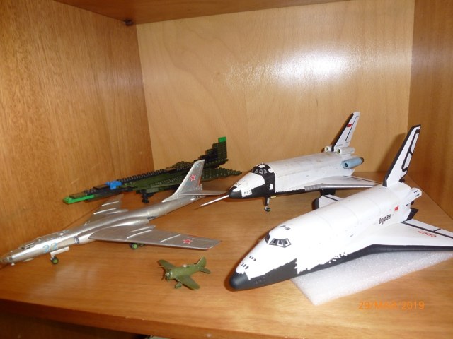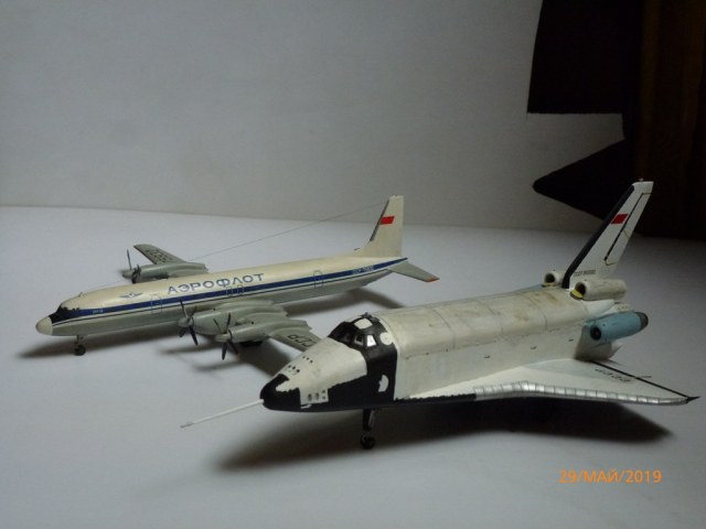Ну вот и доделал наконец самолёт-аналог Бурана БТС-002, он же ОК-ГЛИ. Самый большой экспериментальный самолёт в масштабе 1/144. Устал я от него - два месяца ушло. В конце - вместе с Ил-18 и Ту-16 в одном масштабе. От земли до фюзеляжа у Ил-18 - ровно человеческий рост. Как такую громадину в космос запулили - трудно осознать... А ещё ради забавы поставил рядом И-16.