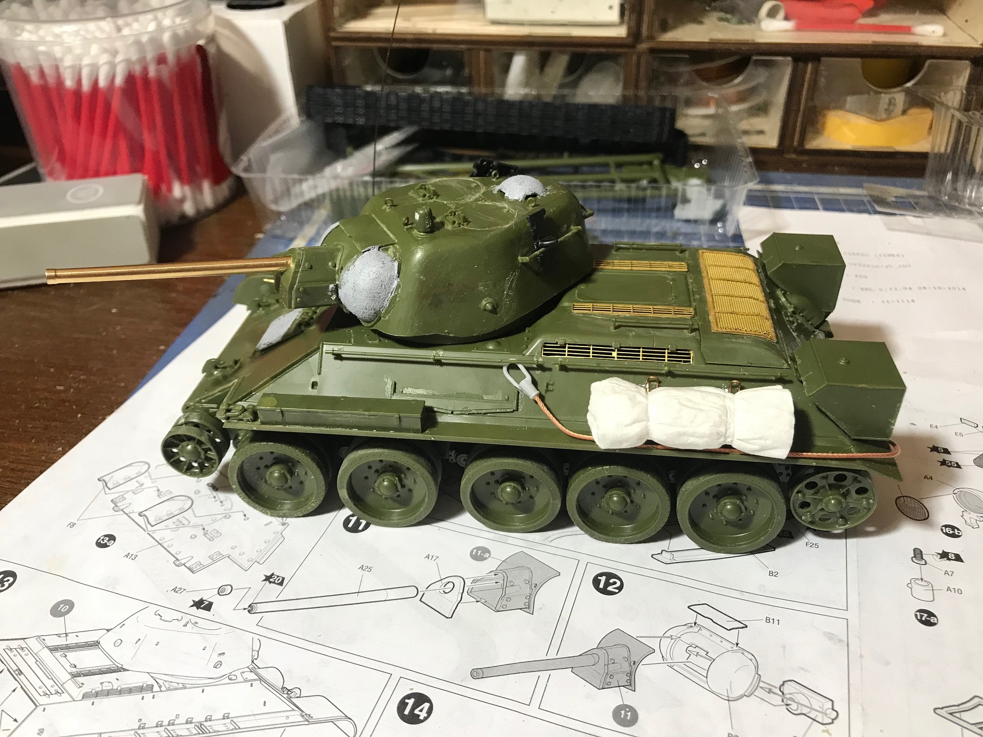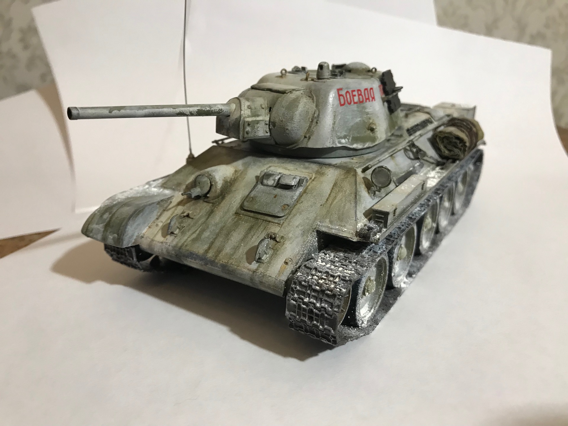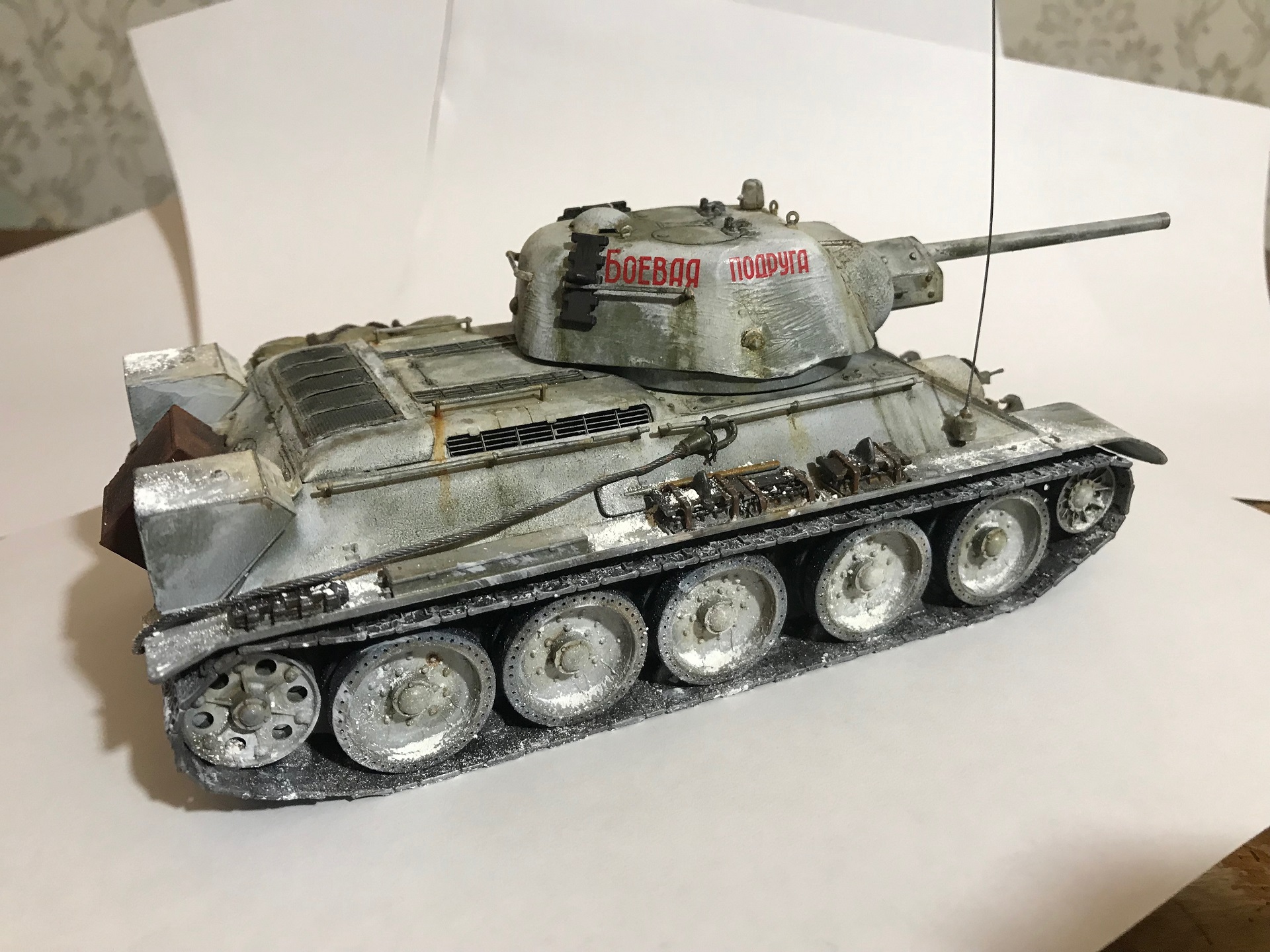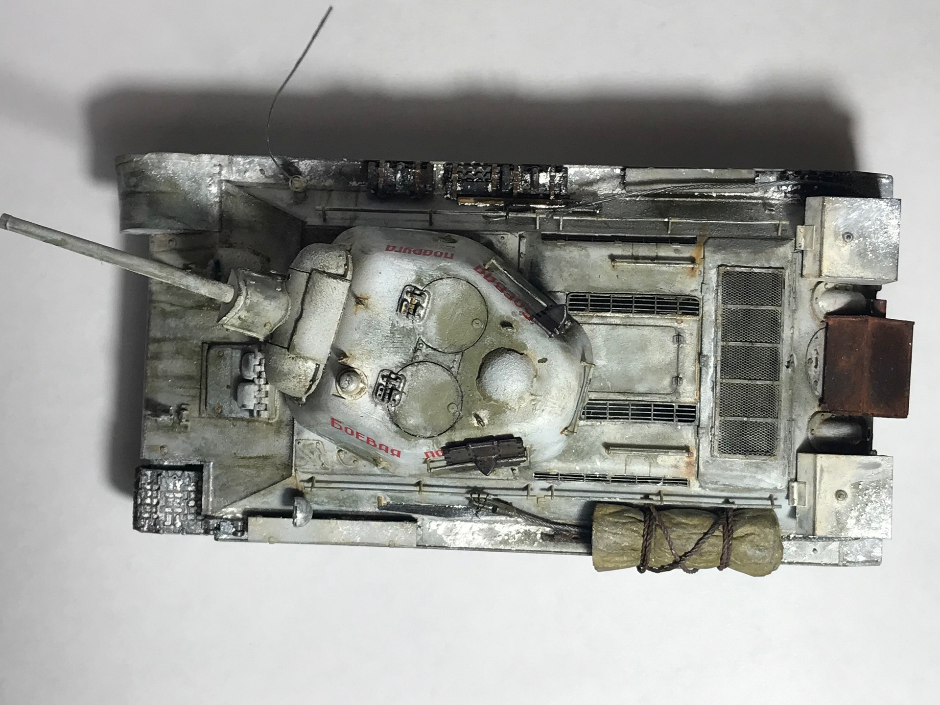 Из допов - предзаказ армата, тросы автермаркет (не помню кто), скатка салфетка и ПВА, фоторавление только сетки от миниарм, антена струна, базовый цвет - 4БО от арма, высветлял тамиа buff, белый цвет водорастворимая ammo mig, эффекты АК, не много масла, пигменты zip и АК на печке.