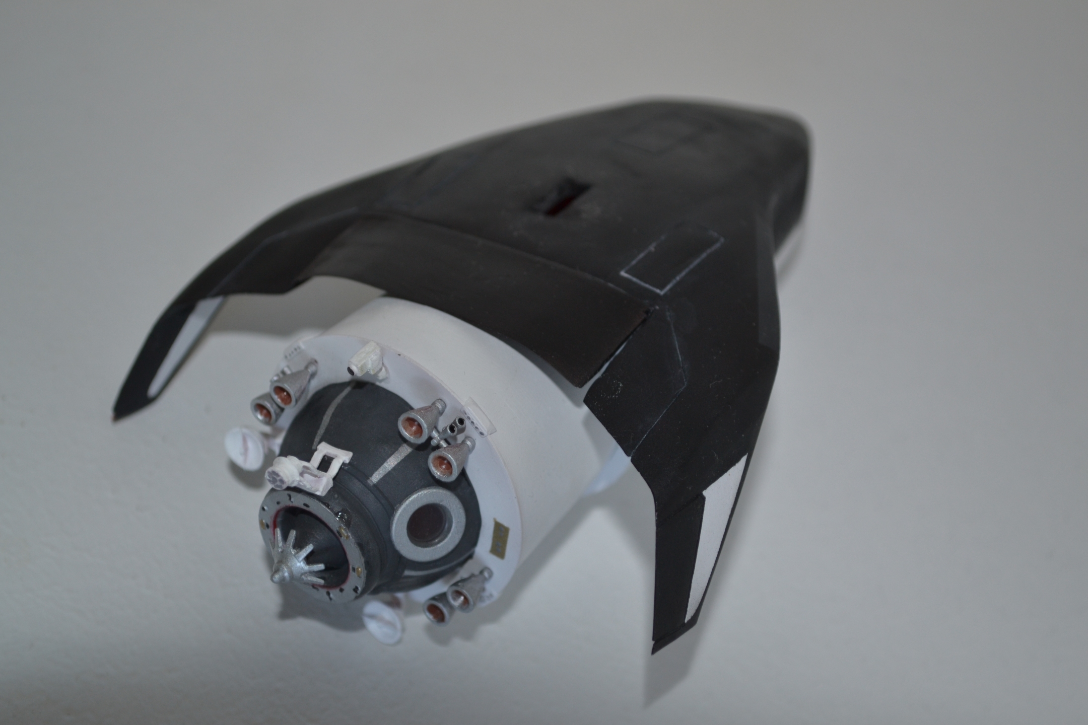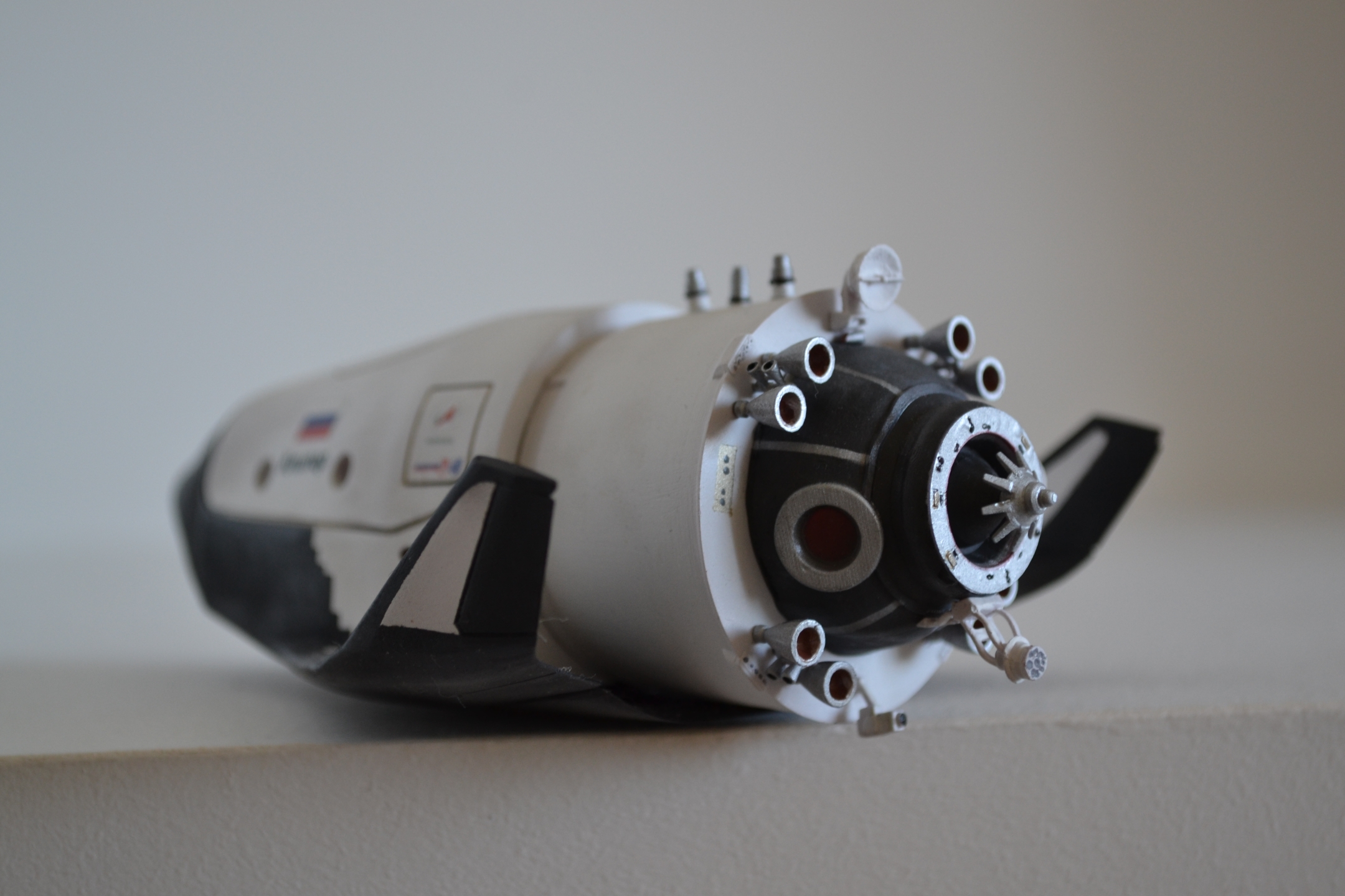 Классная работа, очень понравился аппарат. Я бы сопла двигателей сточил. Толстоваты стенки. Спираль будешь делать?