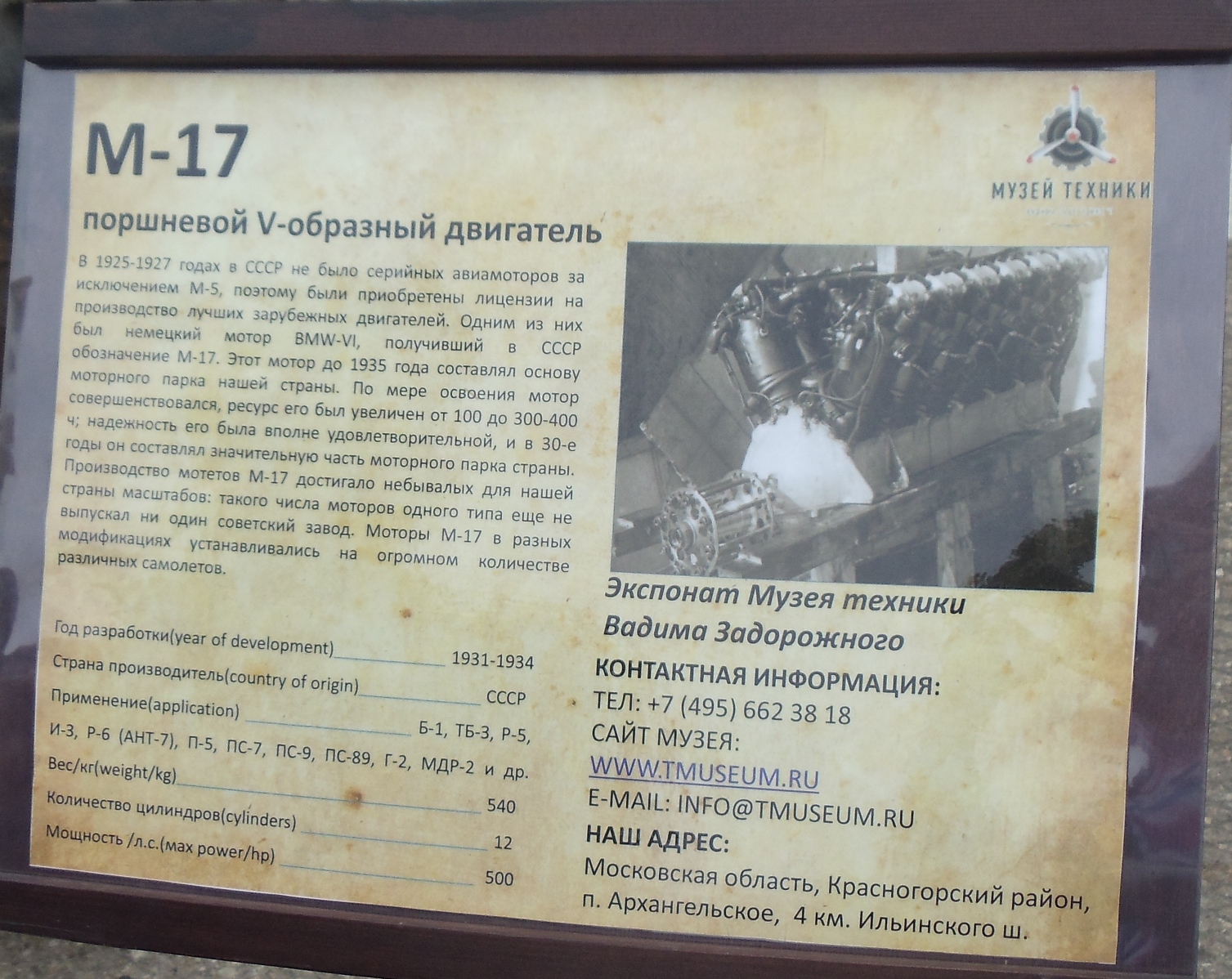 Объект сегодняшнего обзора - М-17 - легенда советского авиапрома, давший путевку в жизнь многим самолетам (как известно из представленной таблички) и танкам (как из этой таблички неизвестно).