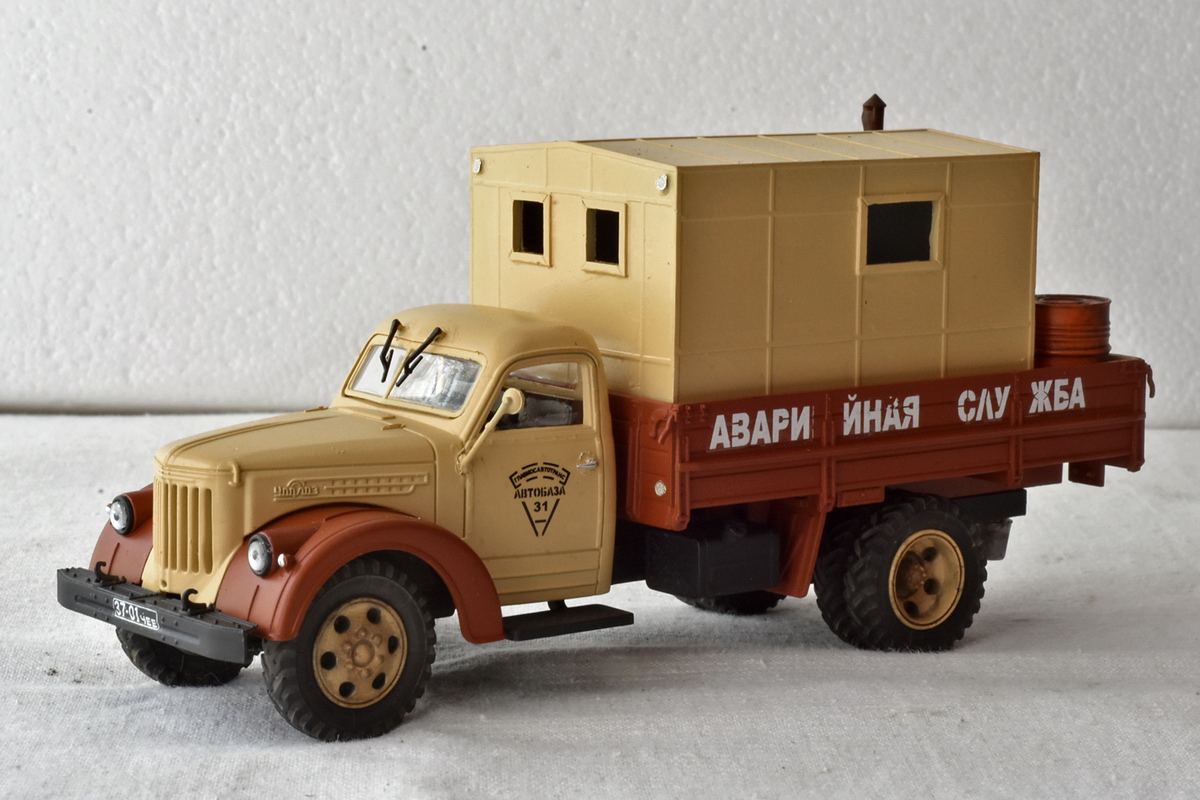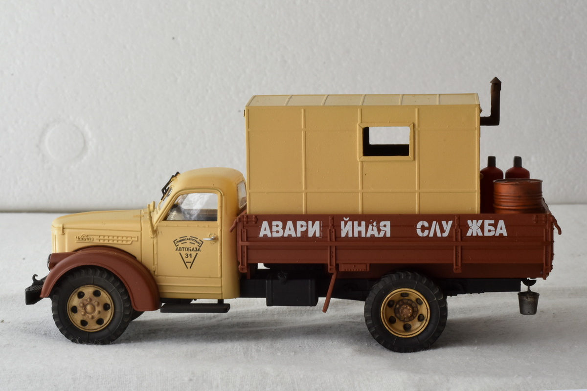 Красил красками Акан и Амо Миг, декали Николаев, будка АВД дополнения. Бочки смола, газобаллоны пластик АВД, красил Аканом же и смывками Амо МиГ. Покрышки брал от АВД ЗиС-151, катафоты-травление Петроград. Пигменты-Мастер пигмент.