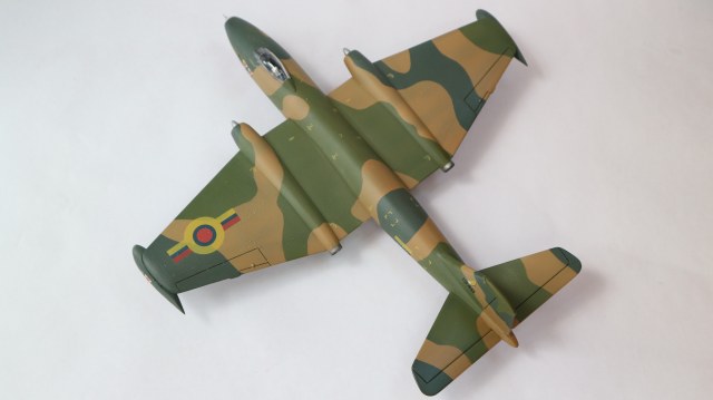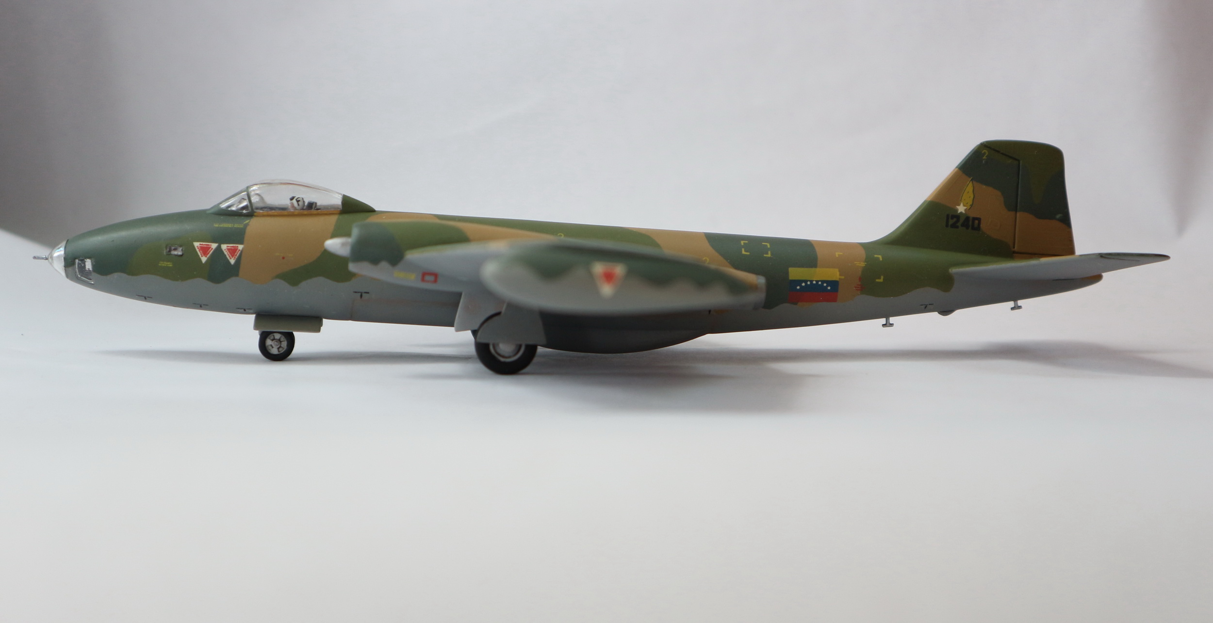 Набор лежал ещё с детских времён, тогда его собрать не решался из-за больших поверхностей (кистью ровно не покрасишь). Ну а сейчас для набивания навыков самое оно. К сожалению декали не сохранились, но один добрый человек подарил несколько комплектов "Канги" на разные модели. Так как английская "Канберра" стала для меня банальной то решил сделать её принадлежайшей ВВС Венесуэлы, тем более камуфляж классный.