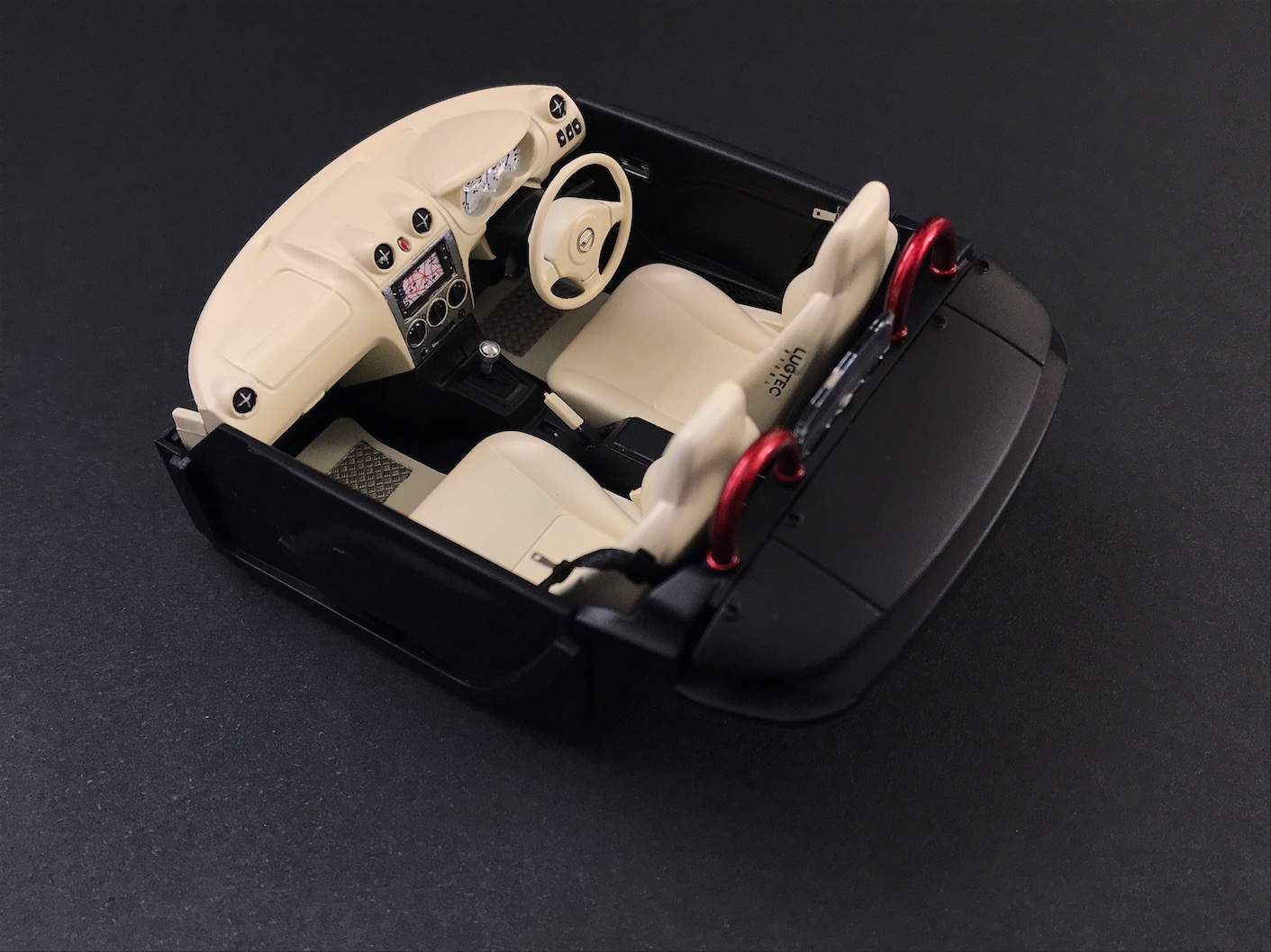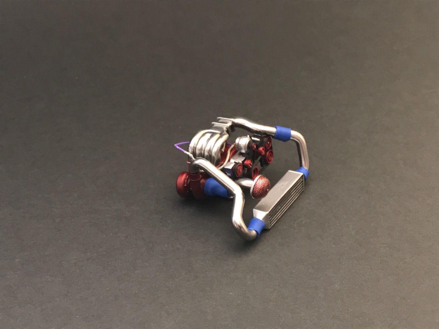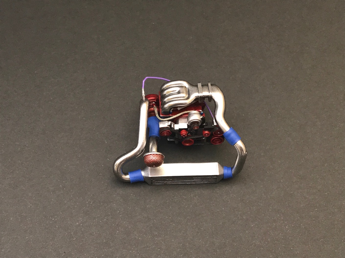 Поскольку модель собиралась для конкурса, я решил, что это неплохой повод сделать что-то нестандартное. В результате, получилась вот такая божья коровка, для которой, заодно сделал и подставку. При сборке модели было два непростых момента. Первый, это покраска, поскольку такая расцветка потребовала десять! слоёв краски, и это помимо грунта и лака. Второй момент - установка двигателя, который для этой модели не предусмотрен. В итоге, выпилил капот и часть днища и установил двигатель от Тамиевской Mazda RX-7. Причём, не стоковый, а с дополнениями в виде турбины, интеркулера и прочих сопутствующих вещей. Пайпы изготовлены с нуля из литников.