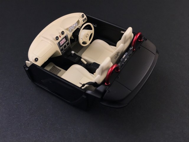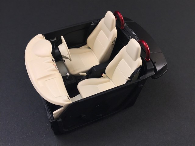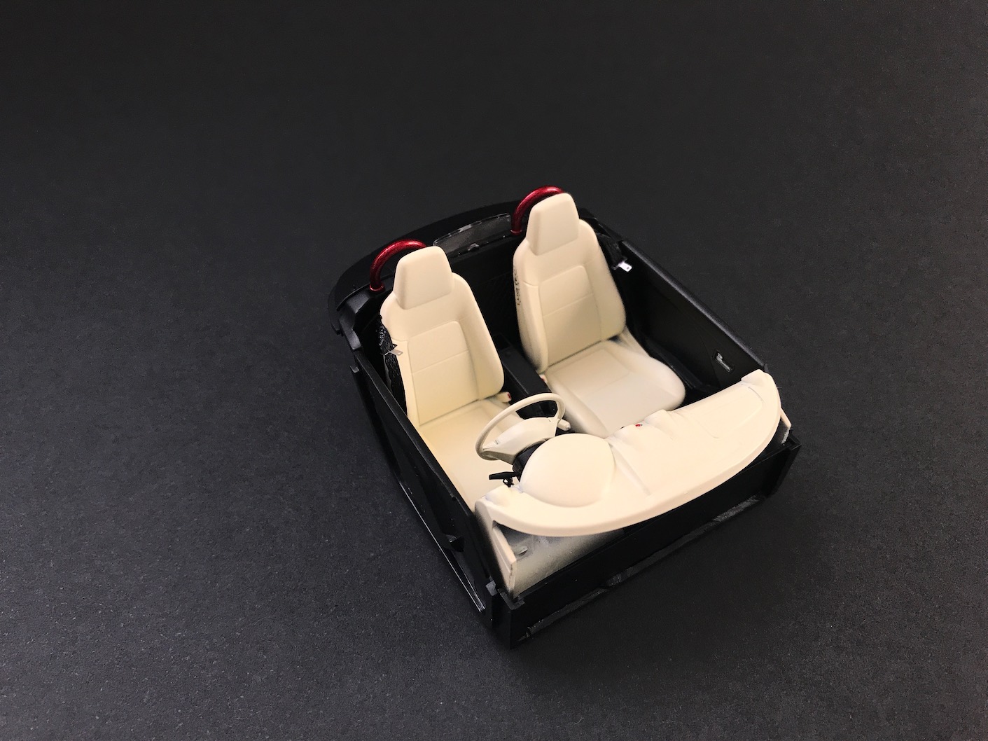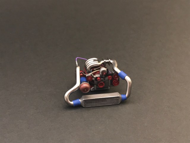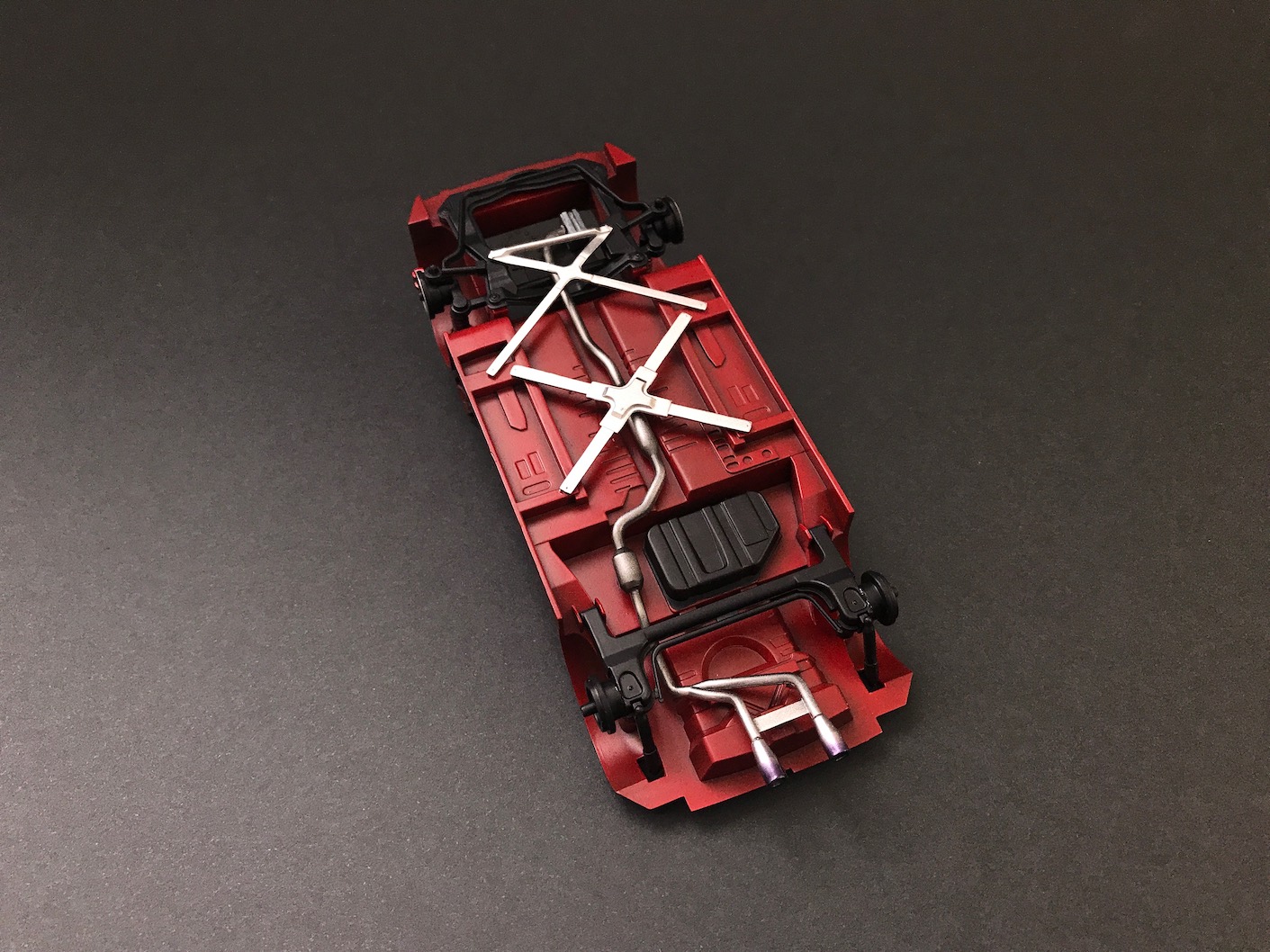 Поскольку модель собиралась для конкурса, я решил, что это неплохой повод сделать что-то нестандартное. В результате, получилась вот такая божья коровка, для которой, заодно сделал и подставку. При сборке модели было два непростых момента. Первый, это покраска, поскольку такая расцветка потребовала десять! слоёв краски, и это помимо грунта и лака. Второй момент - установка двигателя, который для этой модели не предусмотрен. В итоге, выпилил капот и часть днища и установил двигатель от Тамиевской Mazda RX-7. Причём, не стоковый, а с дополнениями в виде турбины, интеркулера и прочих сопутствующих вещей. Пайпы изготовлены с нуля из литников.