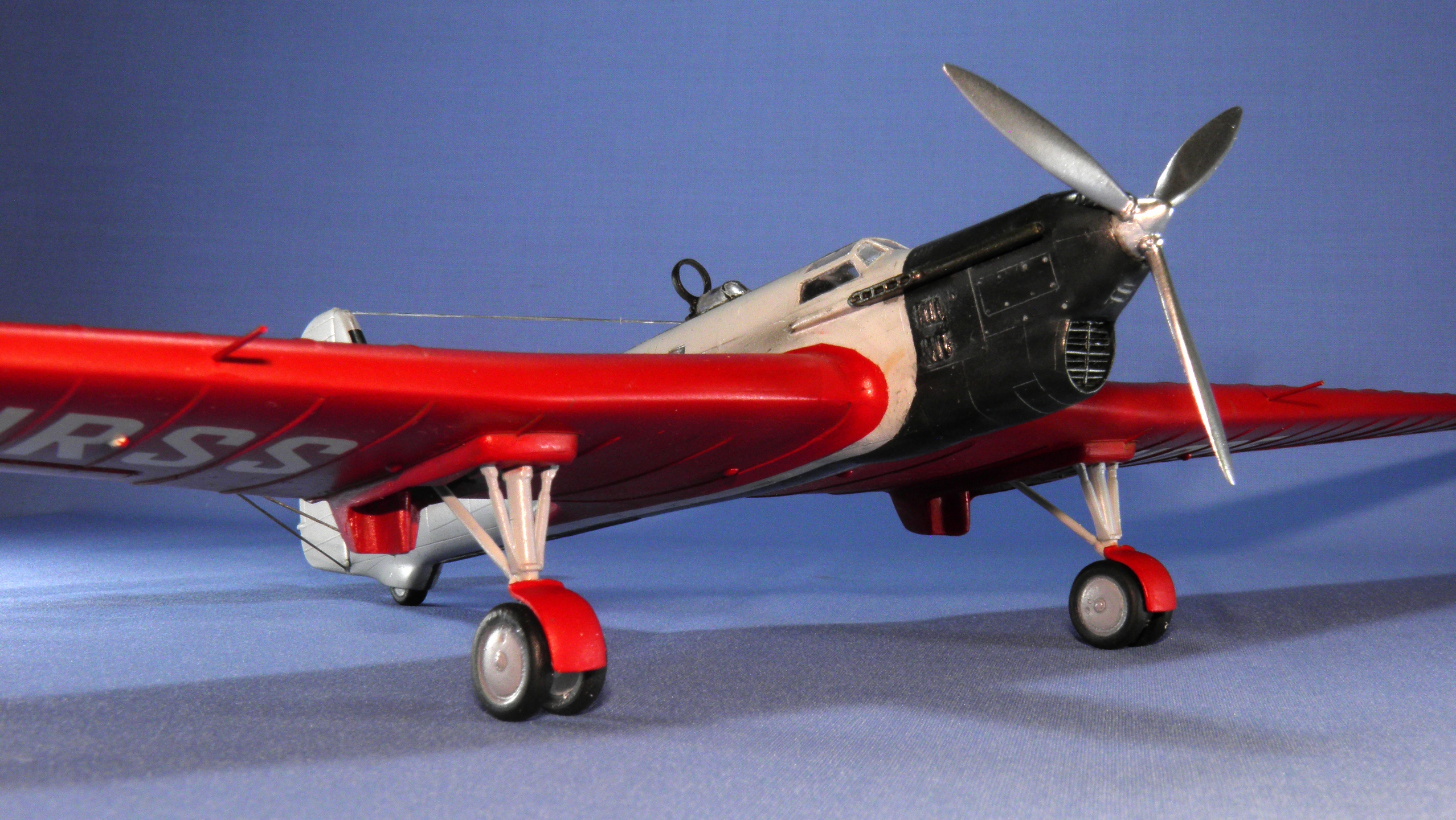 И вечная ошибка всех кто делает этот АНТ. Стойки шасси были выкрашены как и крылья в красный цвет! Вроде столько фото есть. Откуда этот серый на стойках?