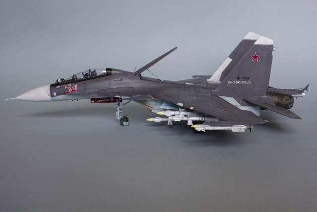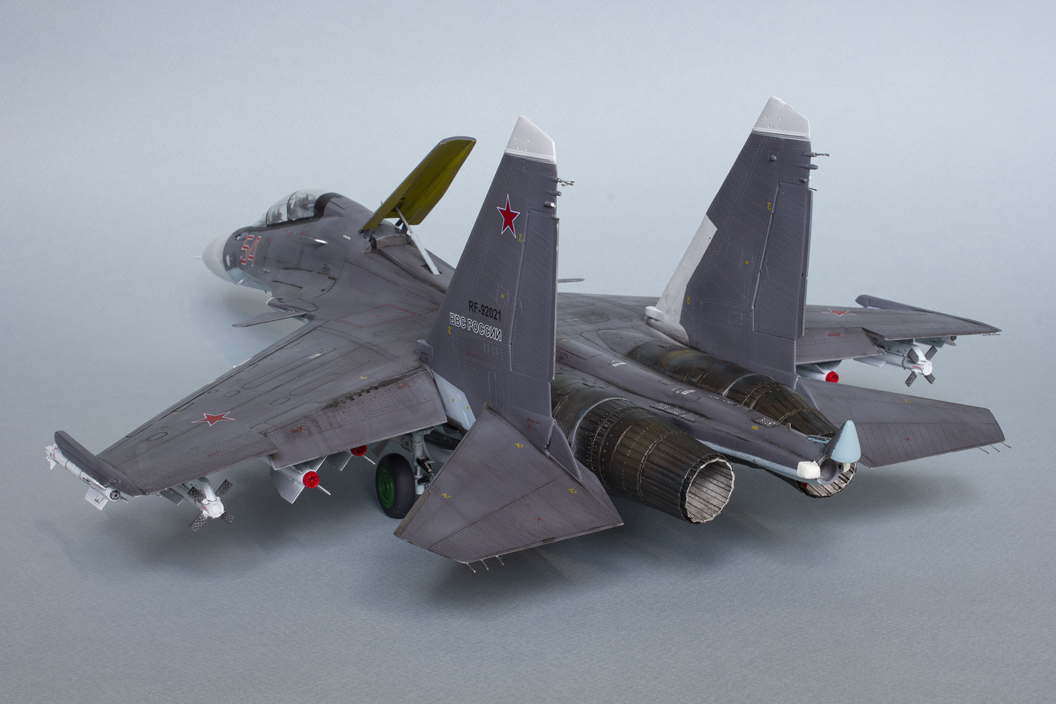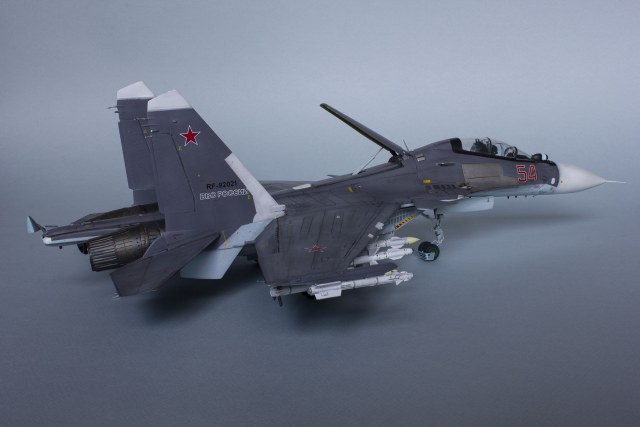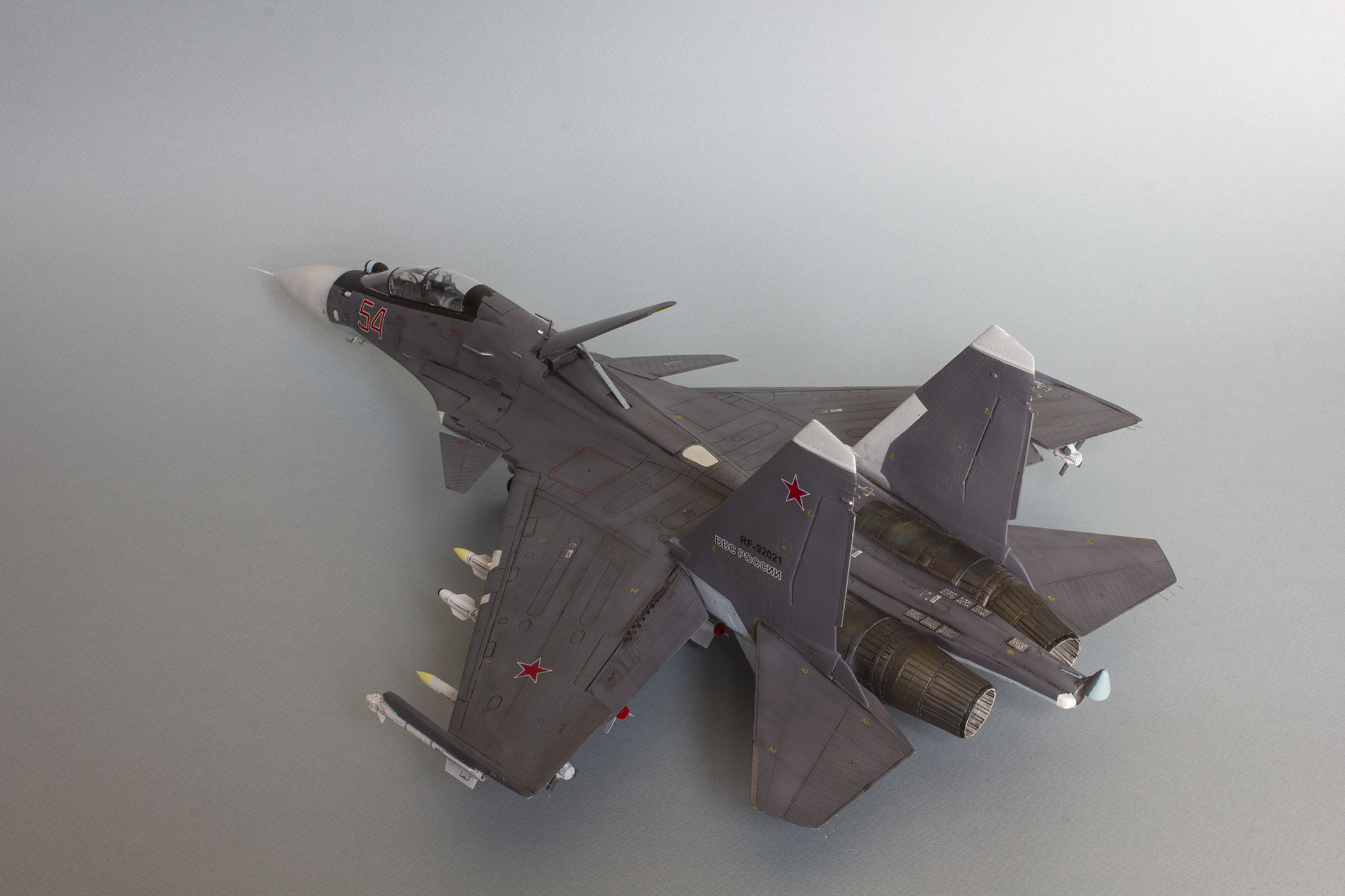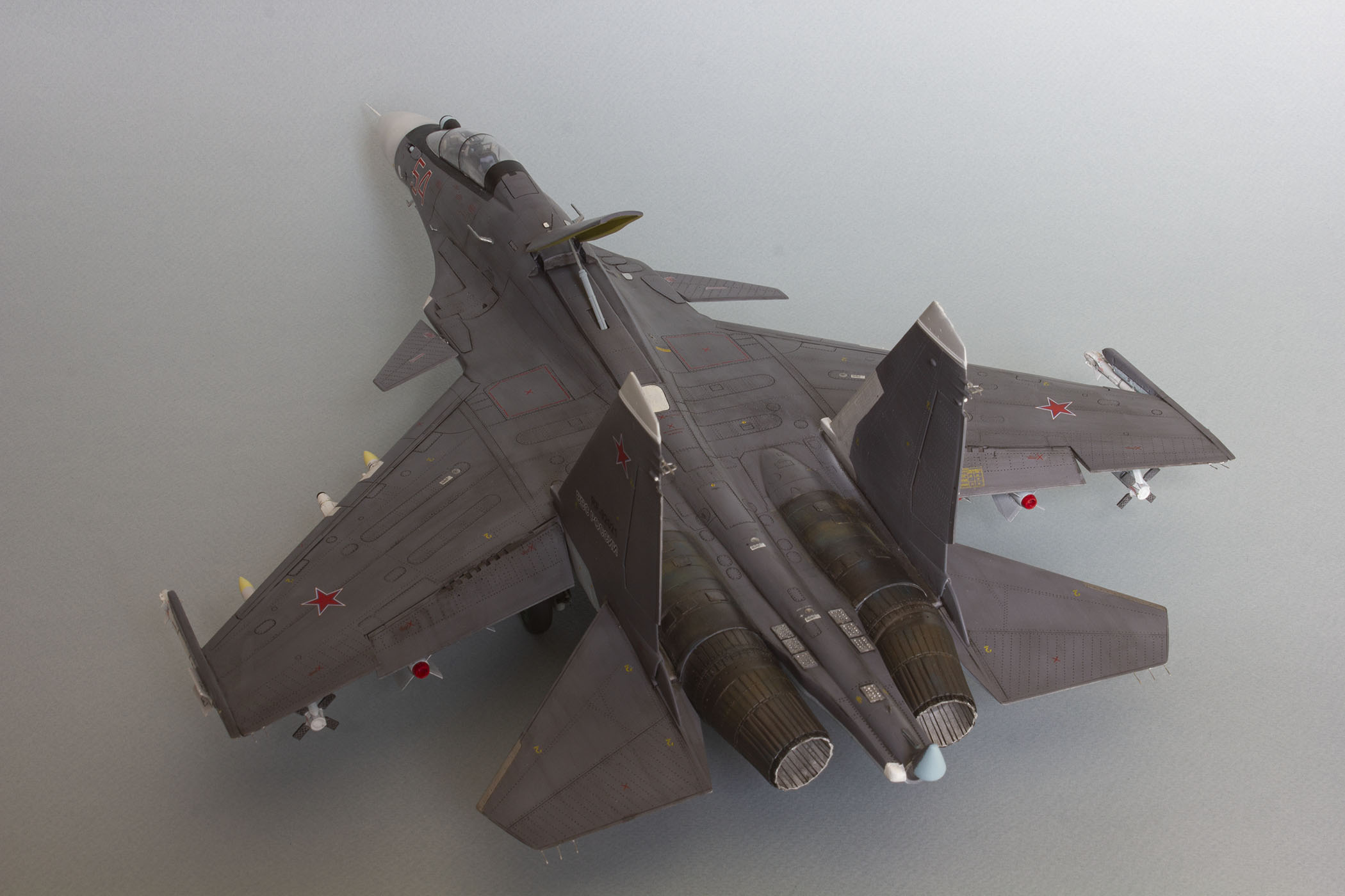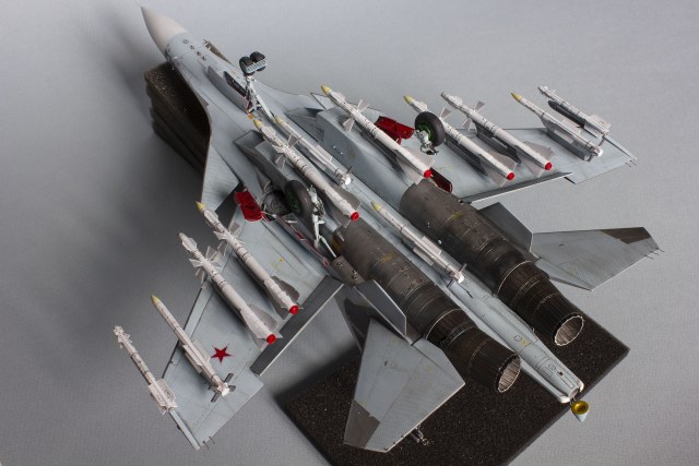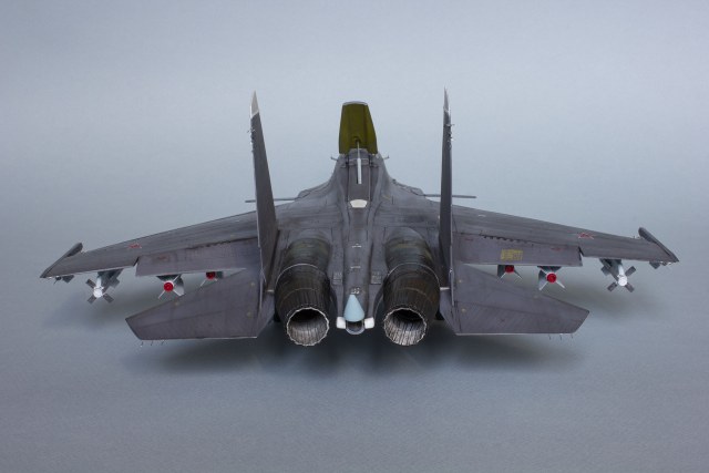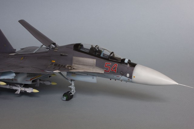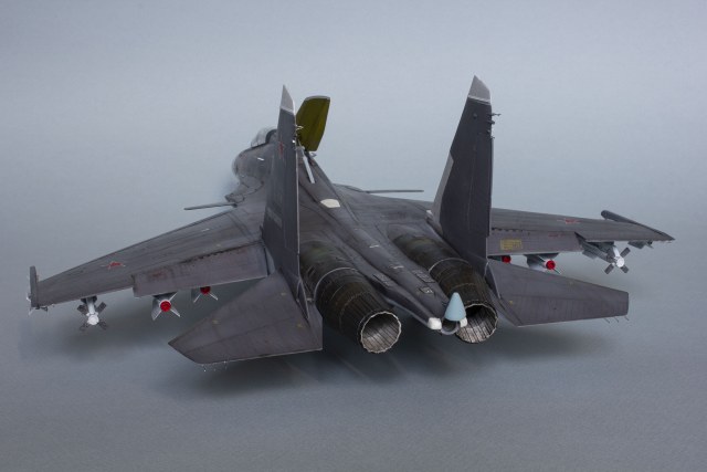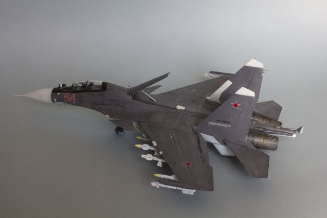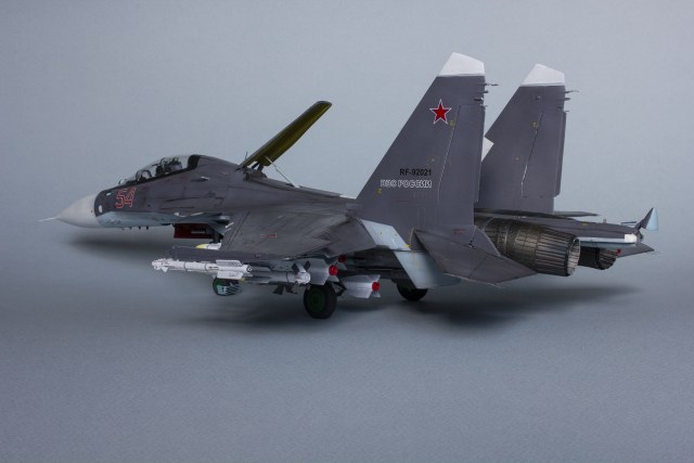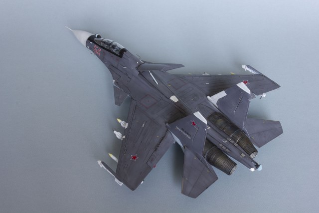 Убрал лишнюю расшивку и клёпку, характерную для академовских сушек и нанёс новую. Клёпку на килях наносил полностью новую, поскольку старая кардинально не соответствовала модификации см. На килях нарастил рули направления, доработал антенны. Перепилил воздушный тормоз и нишу под него. Из пластика изготовил пго и площадку под него. Проработал отсек парашюта. Укоротил корпус двигателей и собрал на основе сопел Aires для СУ-27 сопла версии СМ с отклоняемым вектором тяги. Добавил различные патрубки. Проработал ниши в корпусах воздухозаборников. Удалил в нишах шасси так называемый "банан" и поставил "солнышко". Исправил посадочное место под пилон в хвостовой части самолёта. Переделал блоки тепловых ловушек.