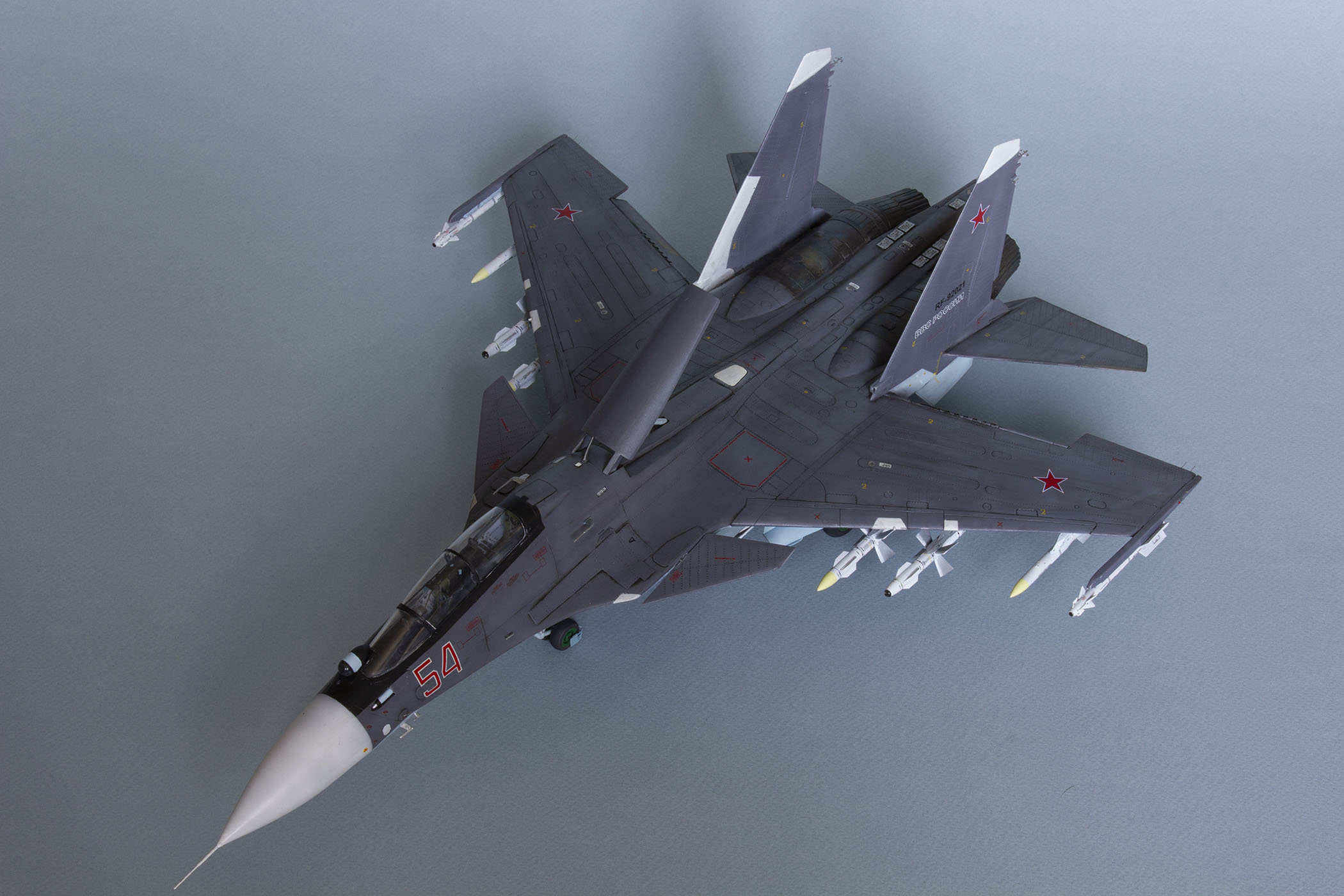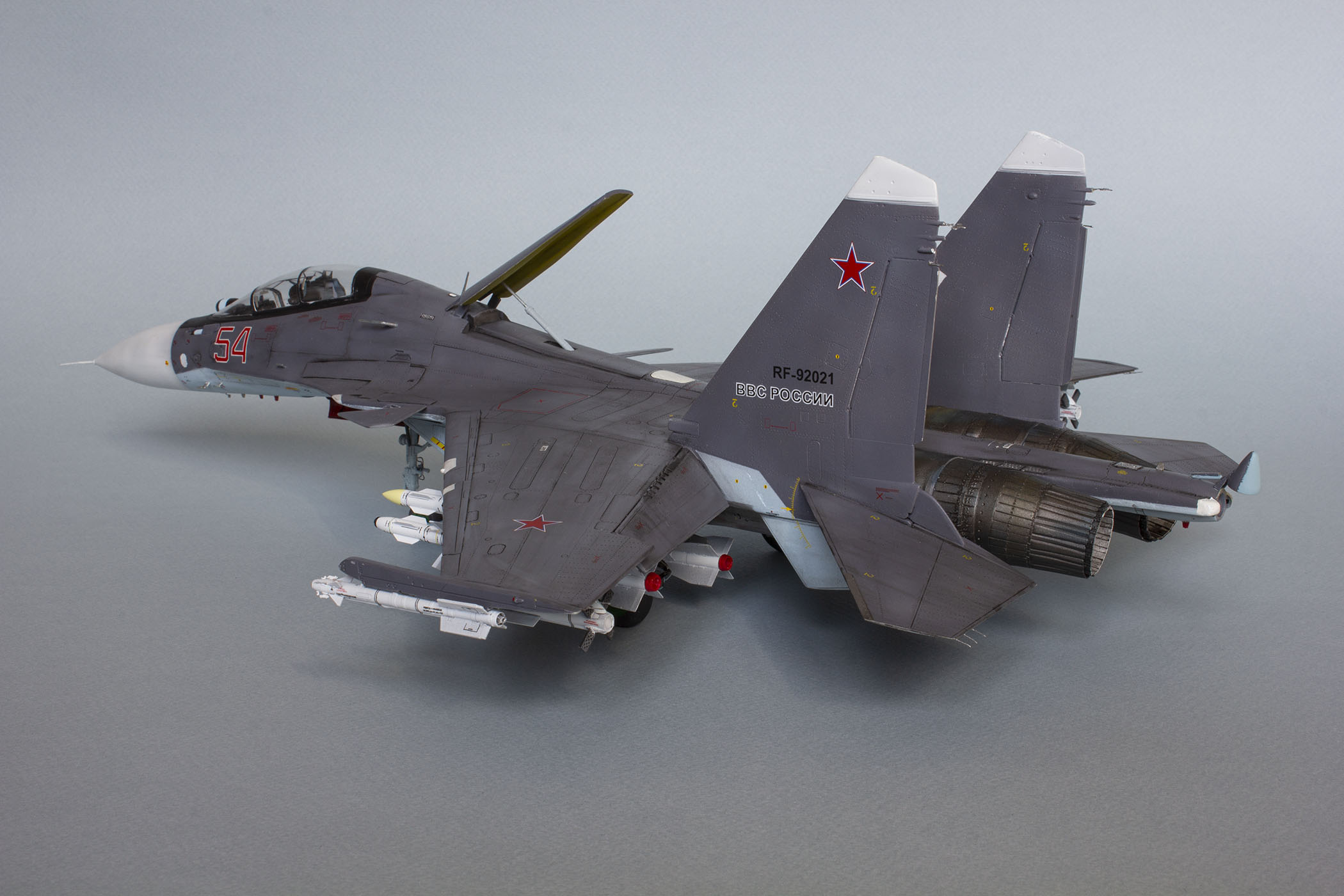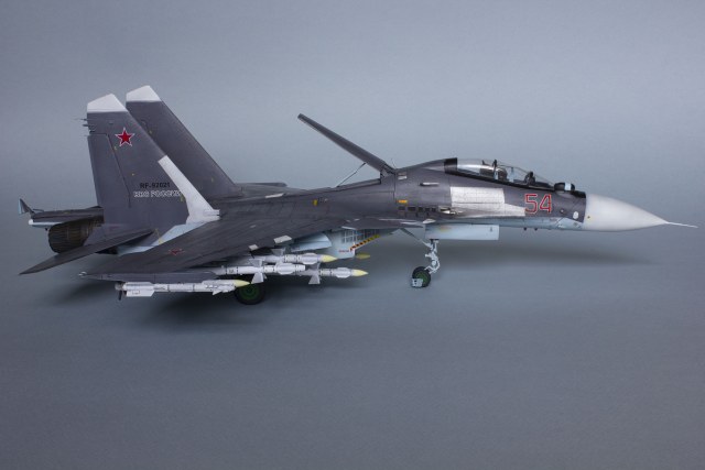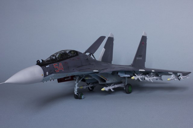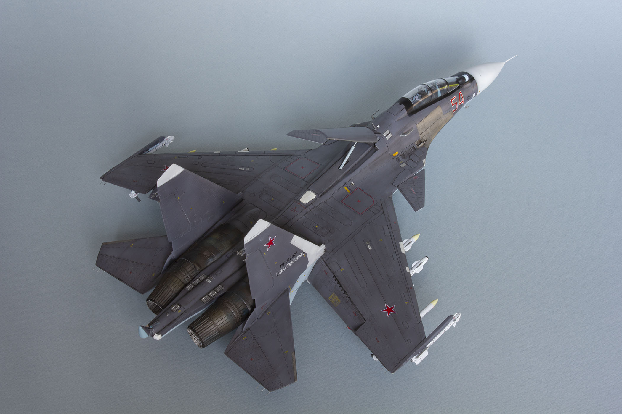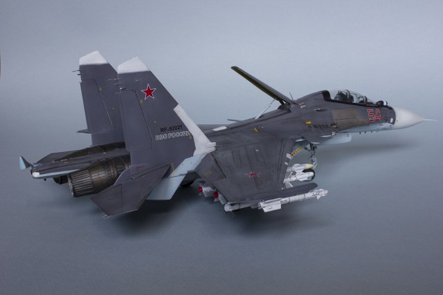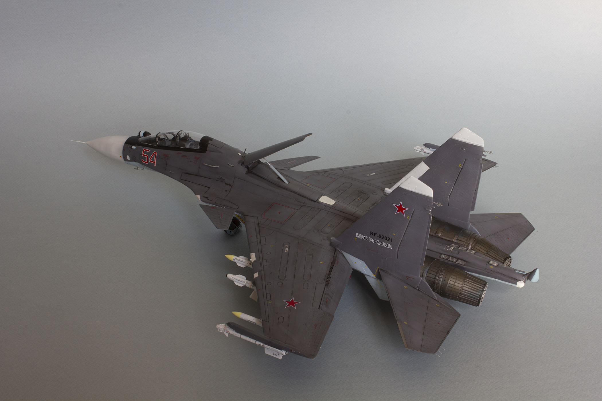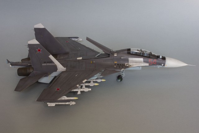 Убрал лишнюю расшивку и клёпку, характерную для академовских сушек и нанёс новую. Клёпку на килях наносил полностью новую, поскольку старая кардинально не соответствовала модификации см. На килях нарастил рули направления, доработал антенны. Перепилил воздушный тормоз и нишу под него. Из пластика изготовил пго и площадку под него. Проработал отсек парашюта. Укоротил корпус двигателей и собрал на основе сопел Aires для СУ-27 сопла версии СМ с отклоняемым вектором тяги. Добавил различные патрубки. Проработал ниши в корпусах воздухозаборников. Удалил в нишах шасси так называемый "банан" и поставил "солнышко". Исправил посадочное место под пилон в хвостовой части самолёта. Переделал блоки тепловых ловушек.