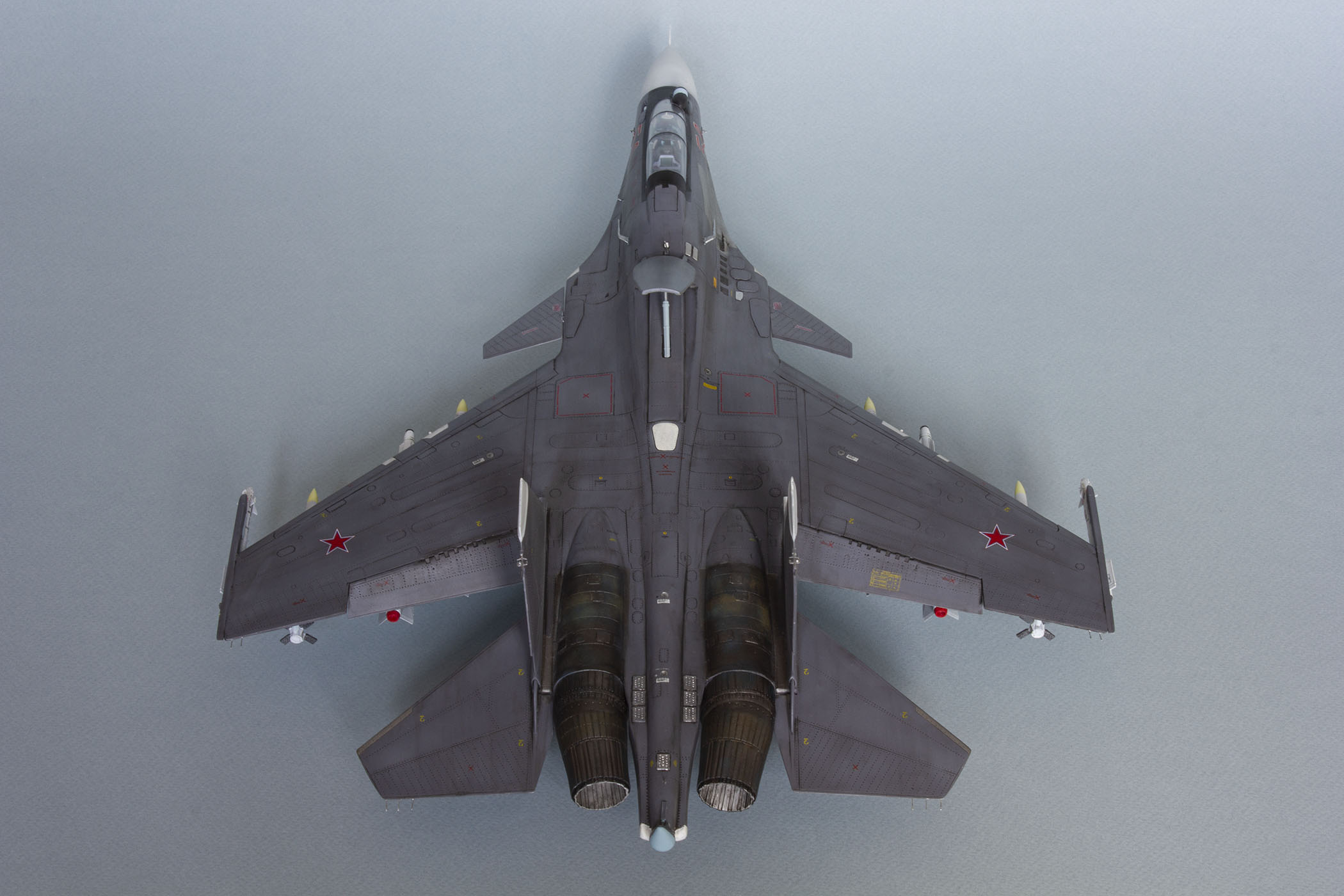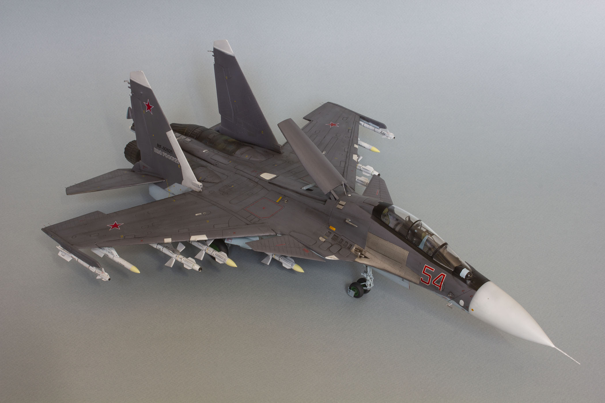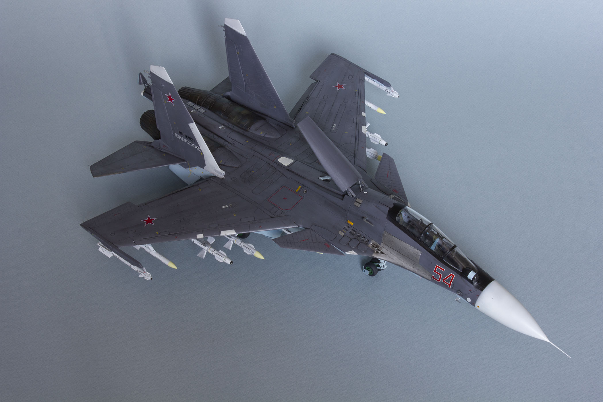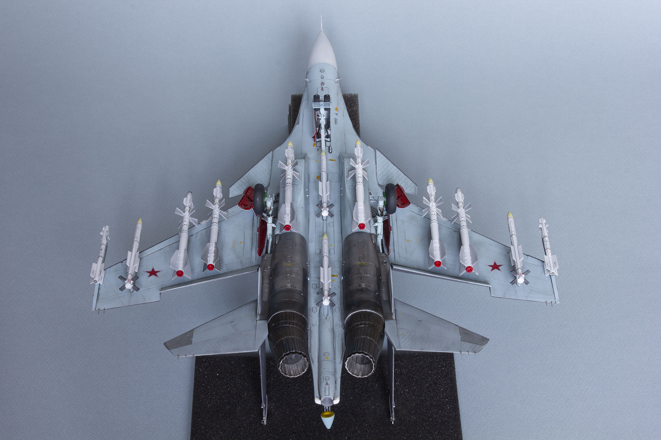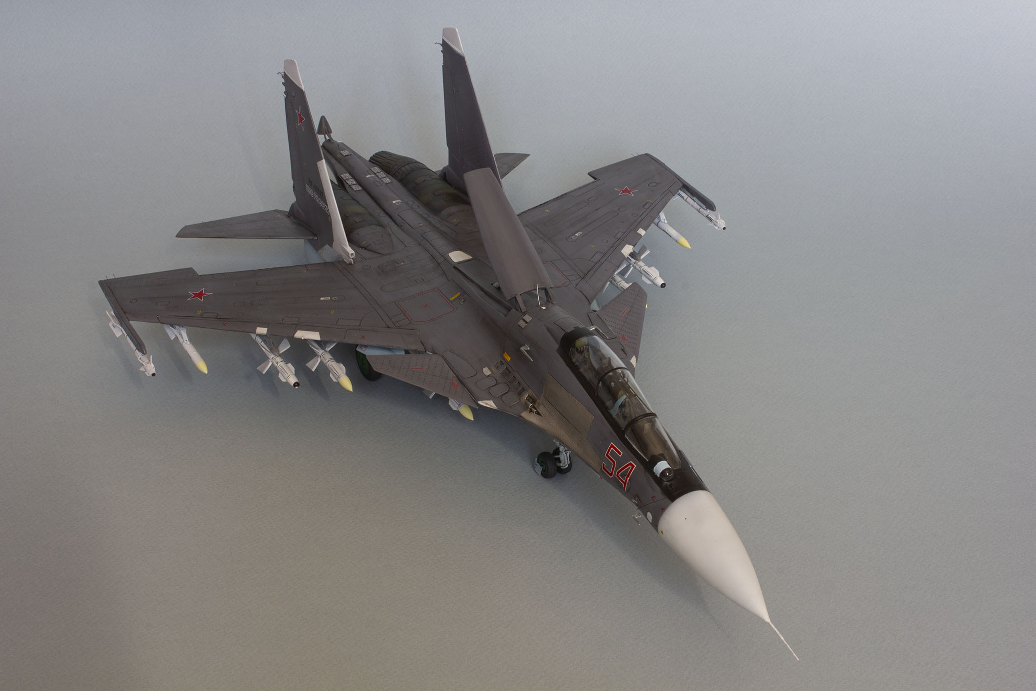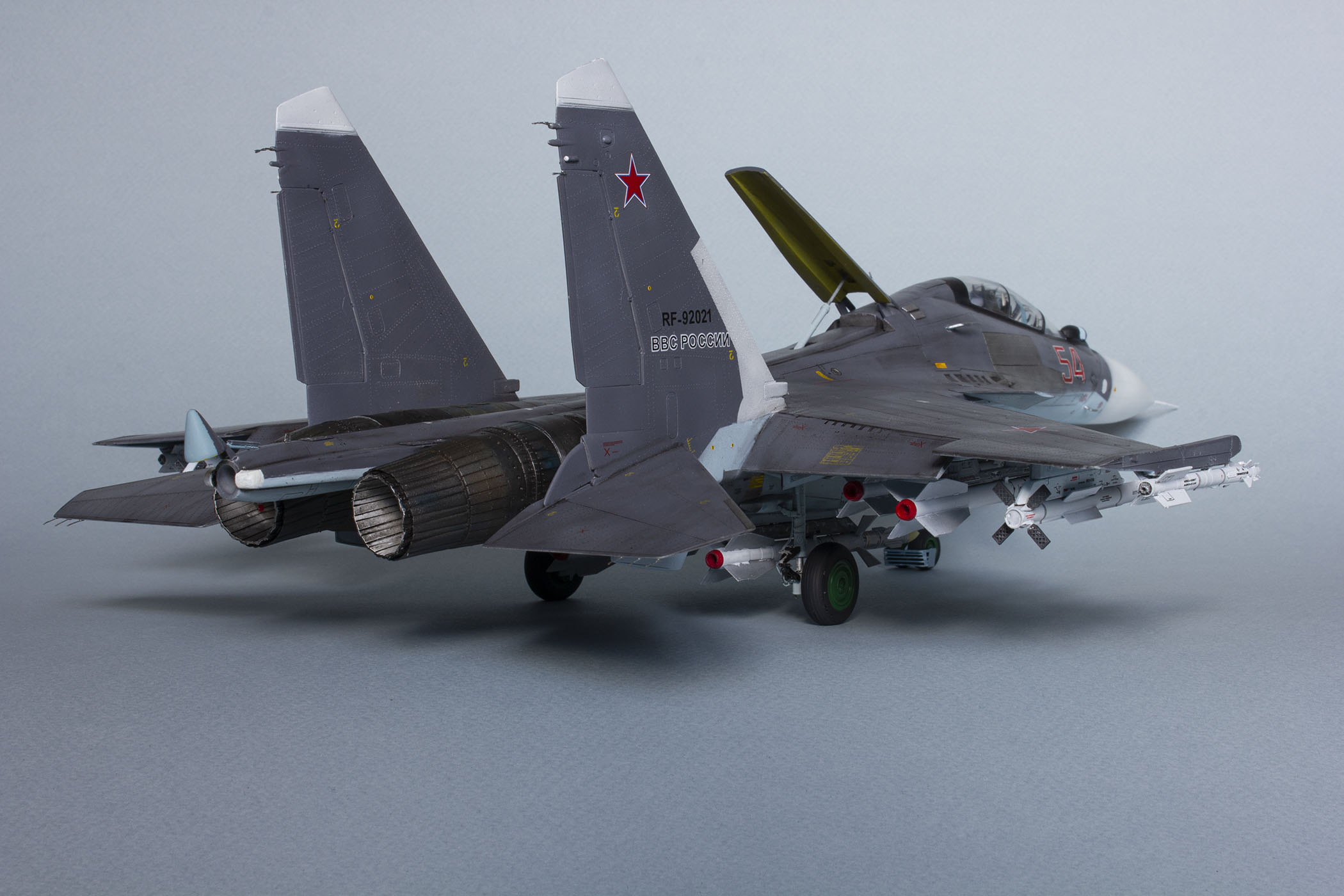 Убрал лишнюю расшивку и клёпку, характерную для академовских сушек и нанёс новую. Клёпку на килях наносил полностью новую, поскольку старая кардинально не соответствовала модификации см. На килях нарастил рули направления, доработал антенны. Перепилил воздушный тормоз и нишу под него. Из пластика изготовил пго и площадку под него. Проработал отсек парашюта. Укоротил корпус двигателей и собрал на основе сопел Aires для СУ-27 сопла версии СМ с отклоняемым вектором тяги. Добавил различные патрубки. Проработал ниши в корпусах воздухозаборников. Удалил в нишах шасси так называемый "банан" и поставил "солнышко". Исправил посадочное место под пилон в хвостовой части самолёта. Переделал блоки тепловых ловушек.
