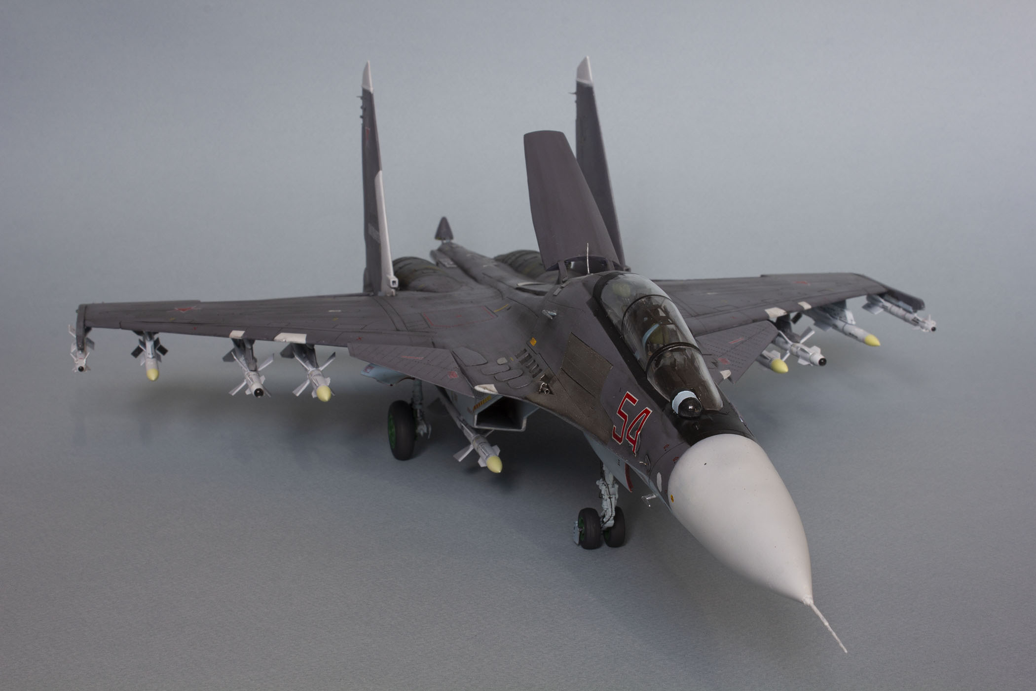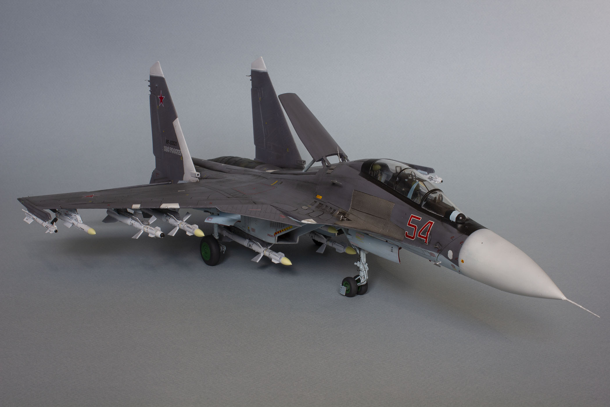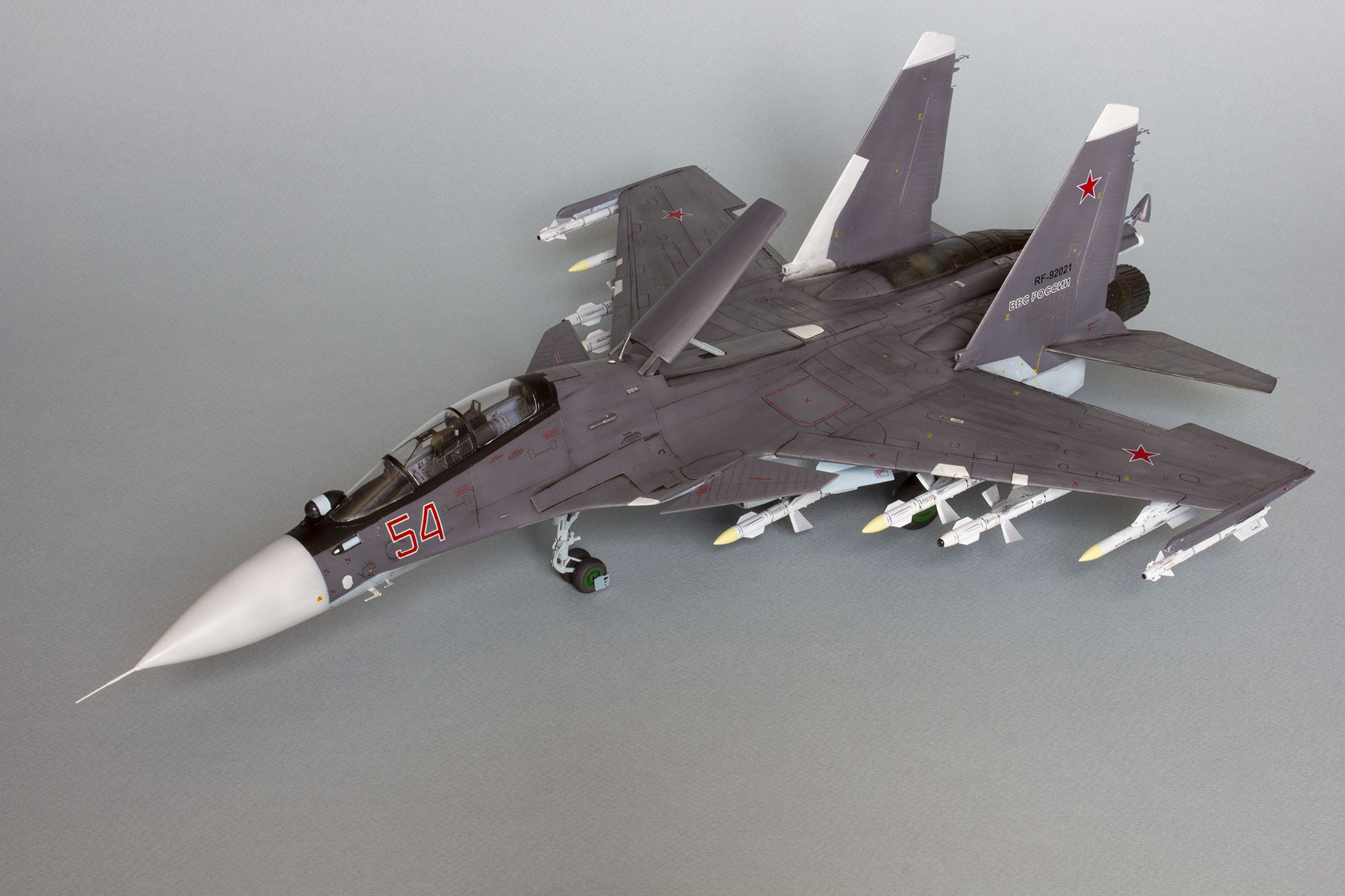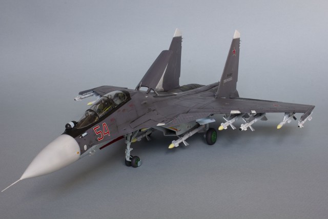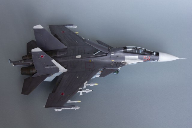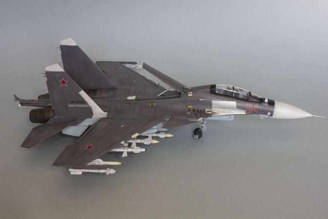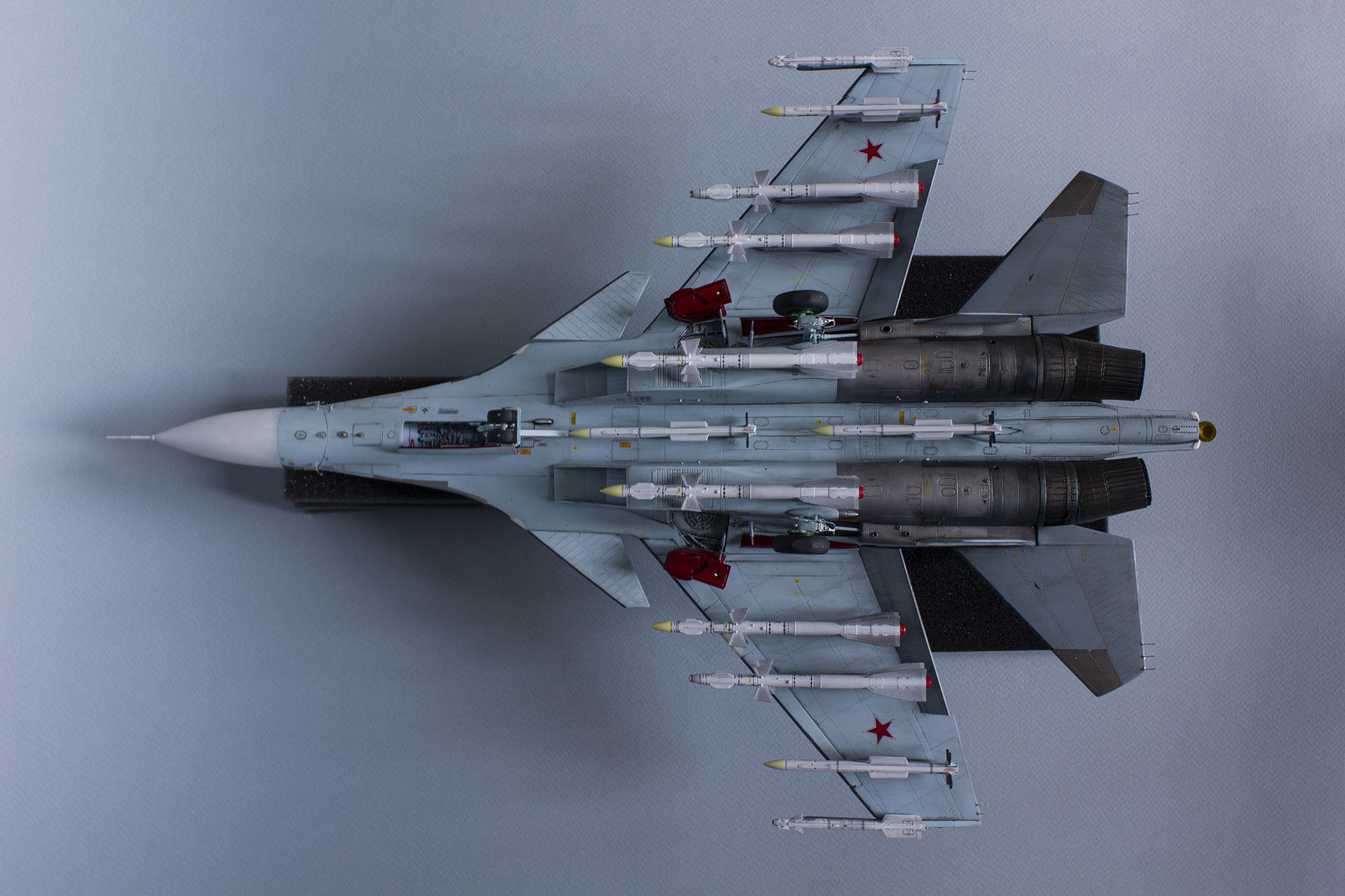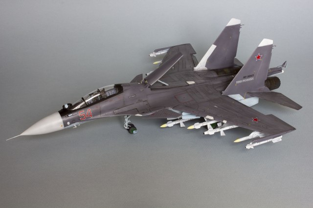 Убрал лишнюю расшивку и клёпку, характерную для академовских сушек и нанёс новую. Клёпку на килях наносил полностью новую, поскольку старая кардинально не соответствовала модификации см. На килях нарастил рули направления, доработал антенны. Перепилил воздушный тормоз и нишу под него. Из пластика изготовил пго и площадку под него. Проработал отсек парашюта. Укоротил корпус двигателей и собрал на основе сопел Aires для СУ-27 сопла версии СМ с отклоняемым вектором тяги. Добавил различные патрубки. Проработал ниши в корпусах воздухозаборников. Удалил в нишах шасси так называемый "банан" и поставил "солнышко". Исправил посадочное место под пилон в хвостовой части самолёта. Переделал блоки тепловых ловушек.
