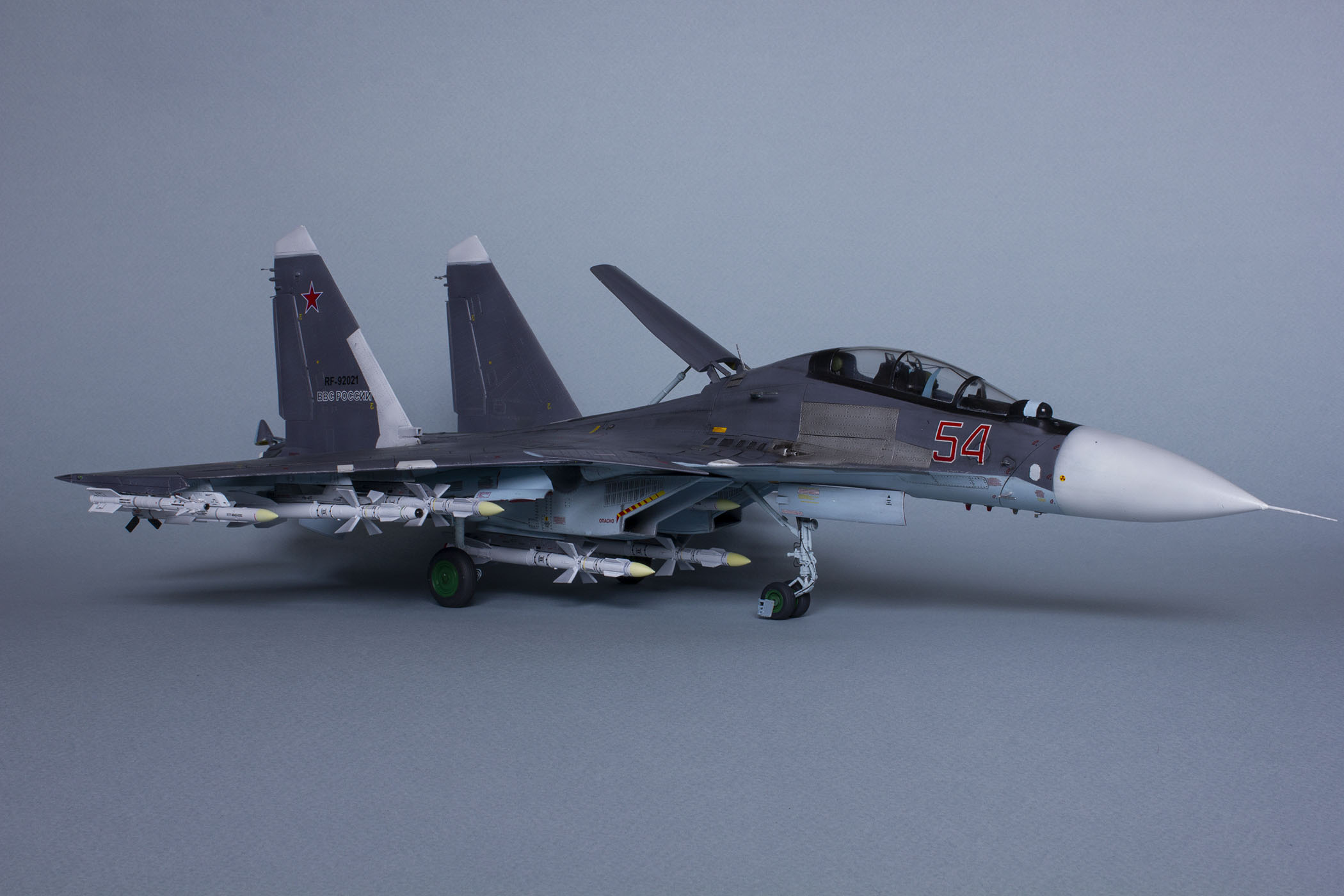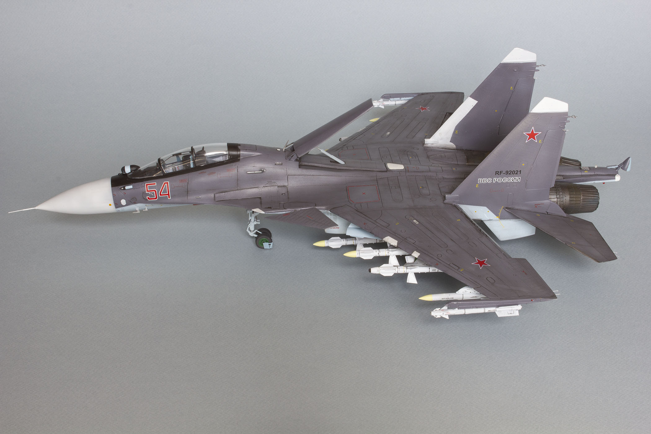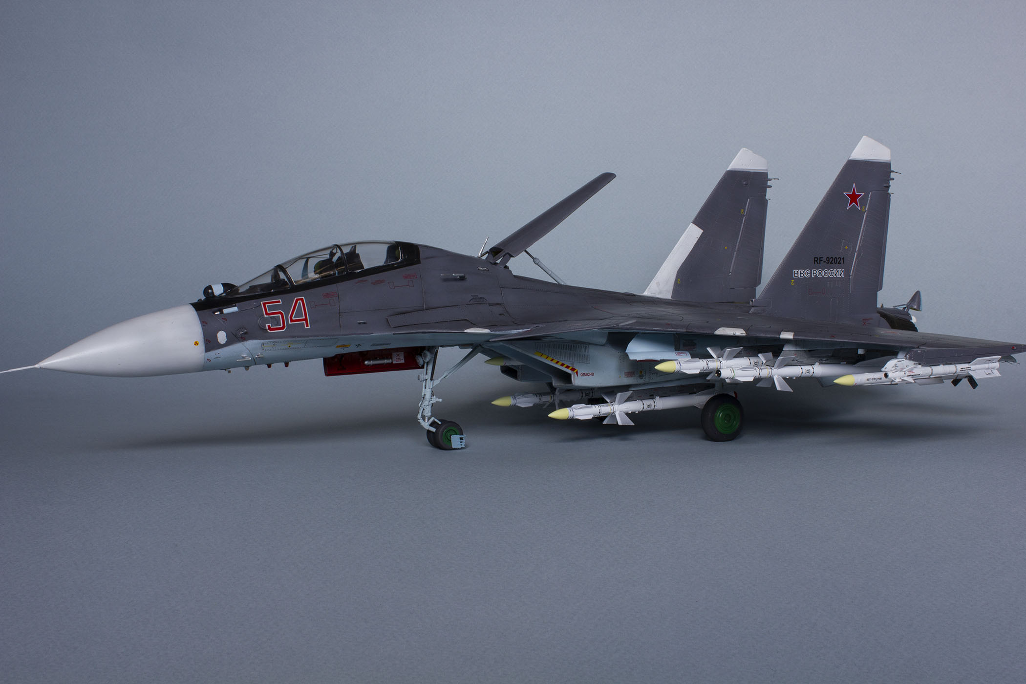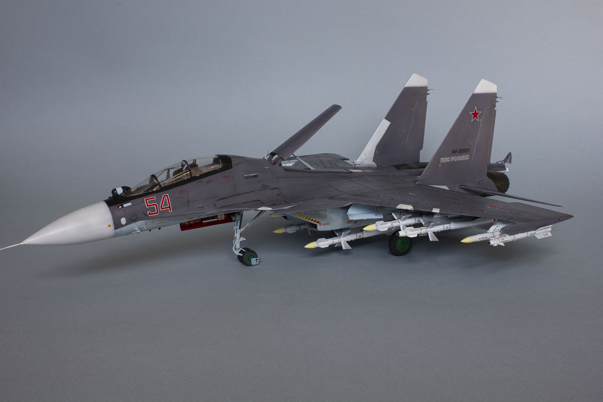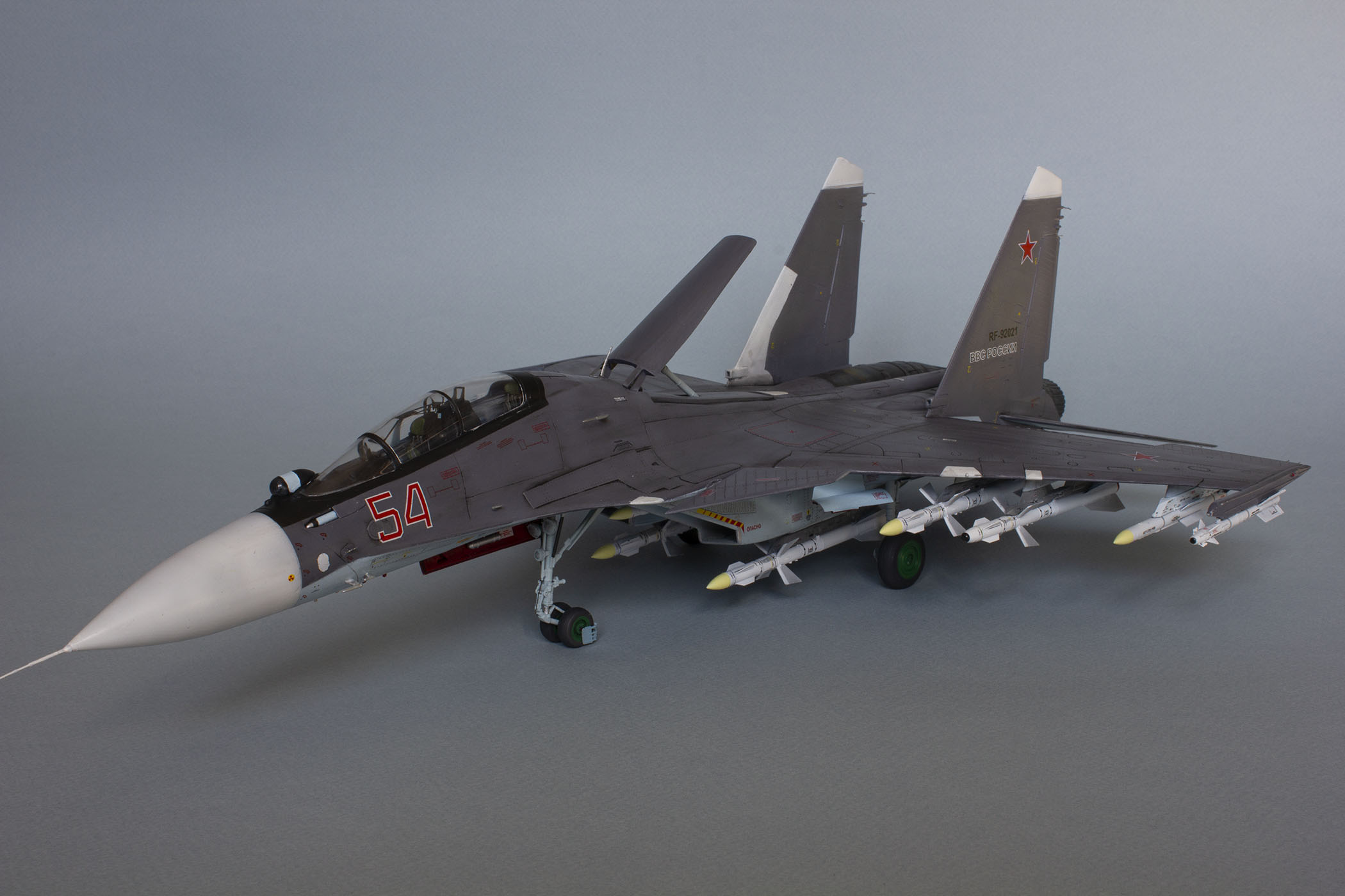 Убрал лишнюю расшивку и клёпку, характерную для академовских сушек и нанёс новую. Клёпку на килях наносил полностью новую, поскольку старая кардинально не соответствовала модификации см. На килях нарастил рули направления, доработал антенны. Перепилил воздушный тормоз и нишу под него. Из пластика изготовил пго и площадку под него. Проработал отсек парашюта. Укоротил корпус двигателей и собрал на основе сопел Aires для СУ-27 сопла версии СМ с отклоняемым вектором тяги. Добавил различные патрубки. Проработал ниши в корпусах воздухозаборников. Удалил в нишах шасси так называемый "банан" и поставил "солнышко". Исправил посадочное место под пилон в хвостовой части самолёта. Переделал блоки тепловых ловушек.
