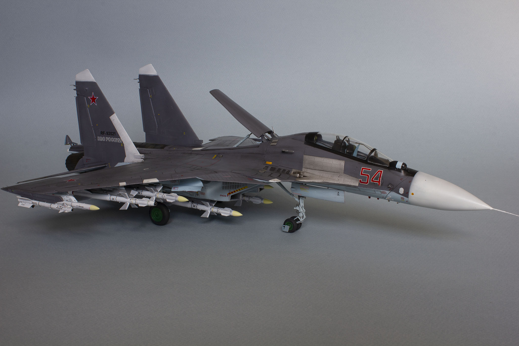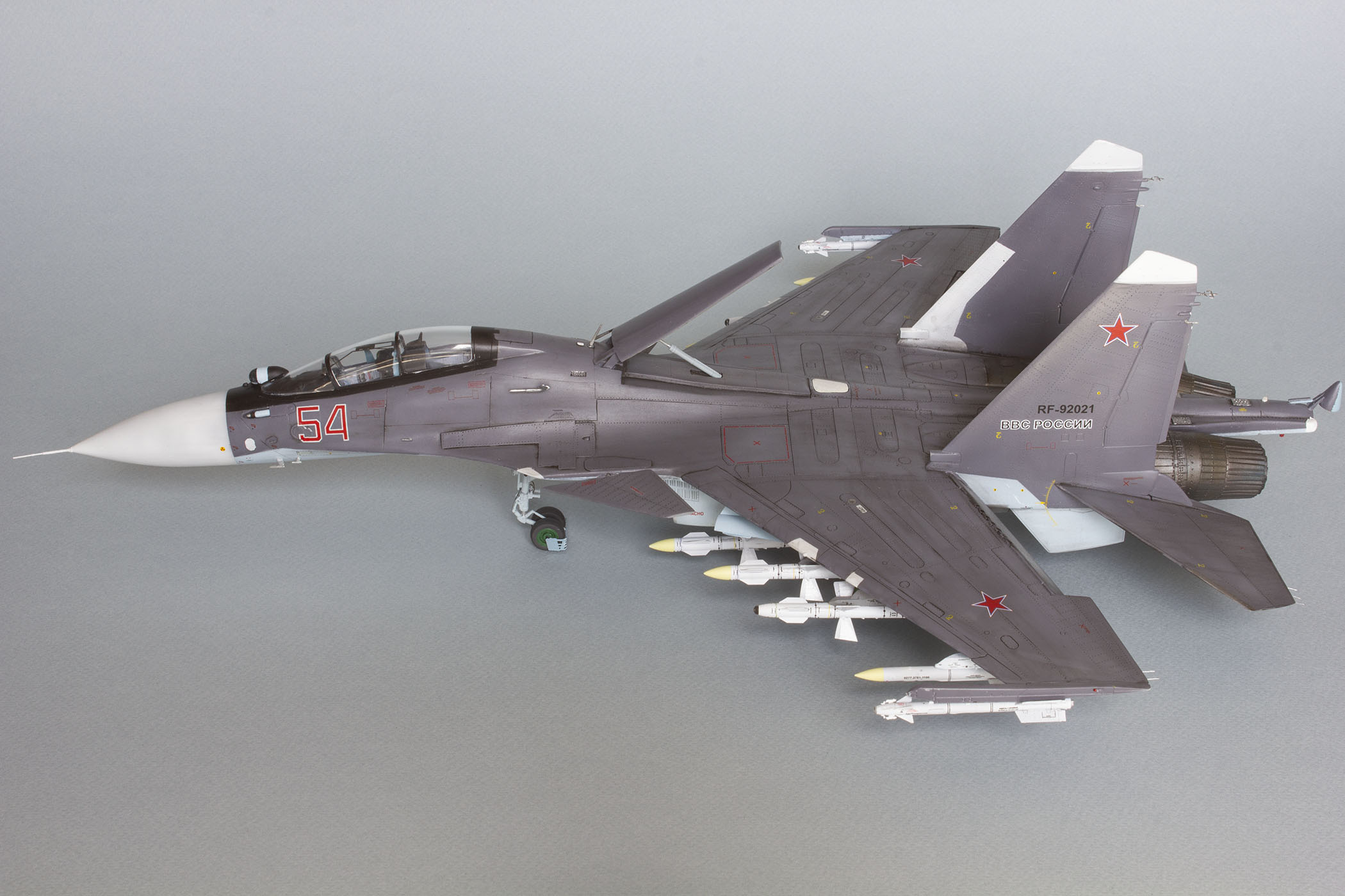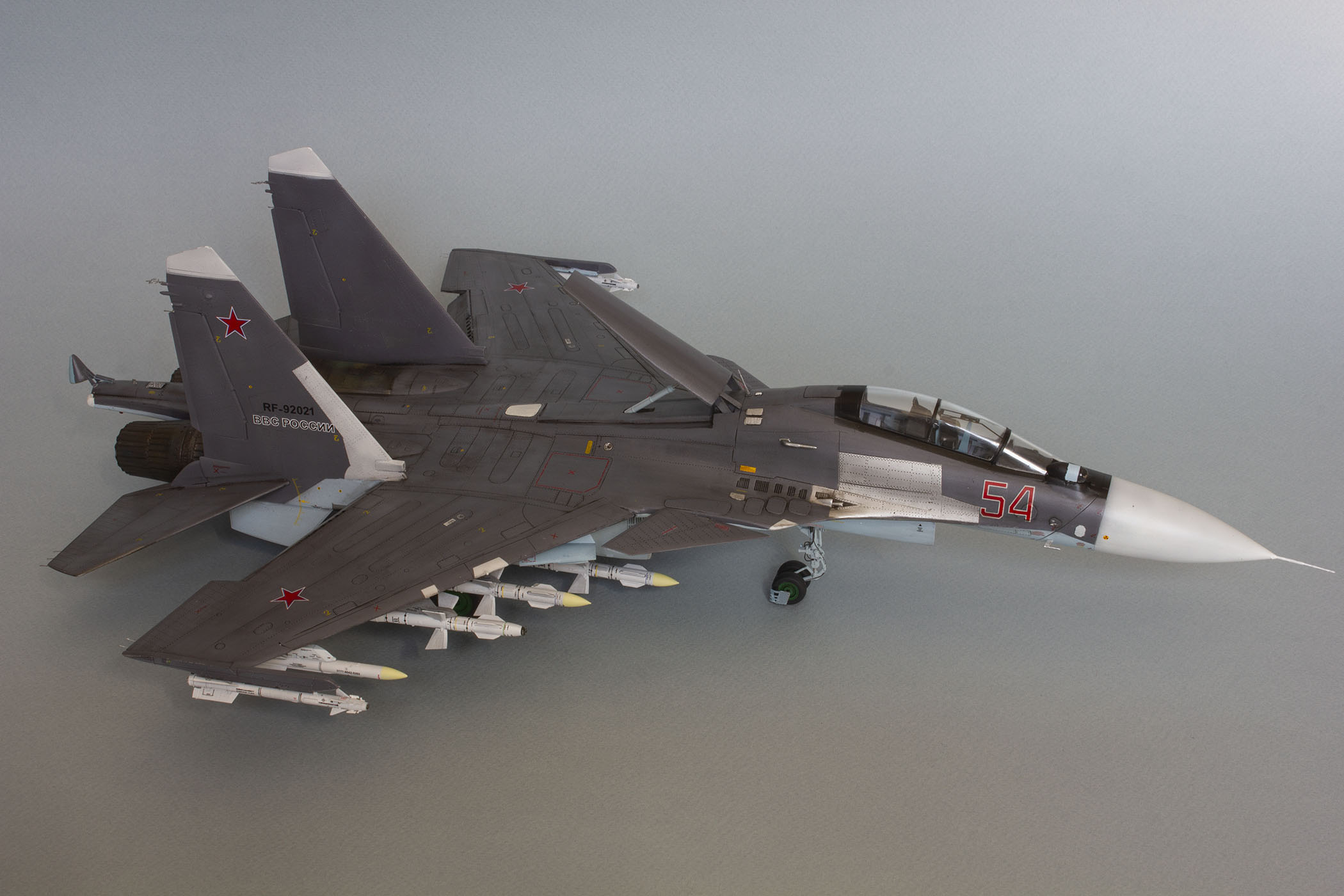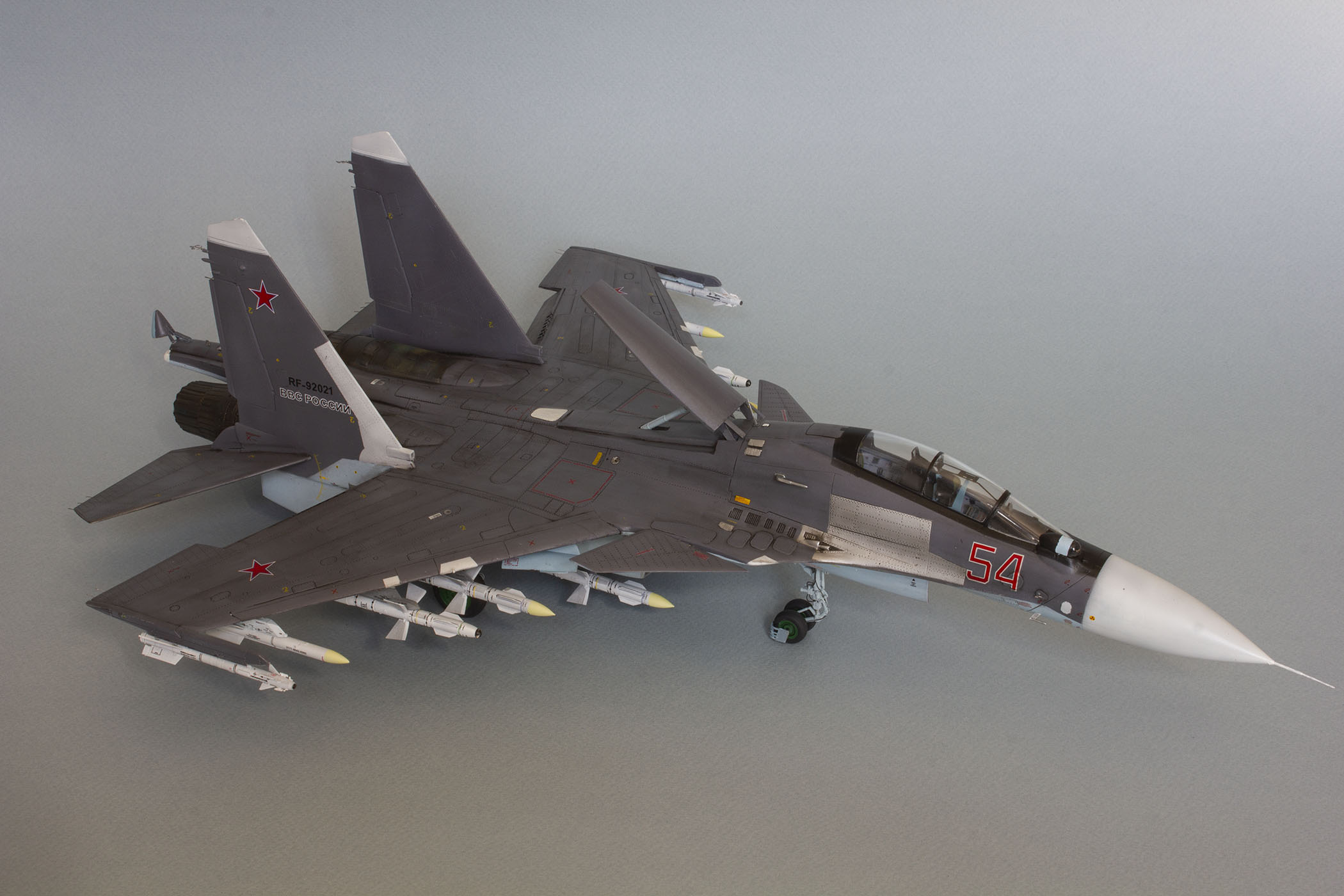 Доброго дня! Представляю Вашему вниманию модель российского тяжелого многоцелевого истребителя поколения 4++ СУ-30СМ. Данную модель собирал на основе академовского набора СУ-30М2. Приобрёл я его ещё в 2016 году и на протяжении трёх лет неспешно собирал, периодически закидывая на полку, так как перепил требует вложения и сил, и времени, и терпения. Это мой первый перепил такого масштаба и моя первая модель на каропке.