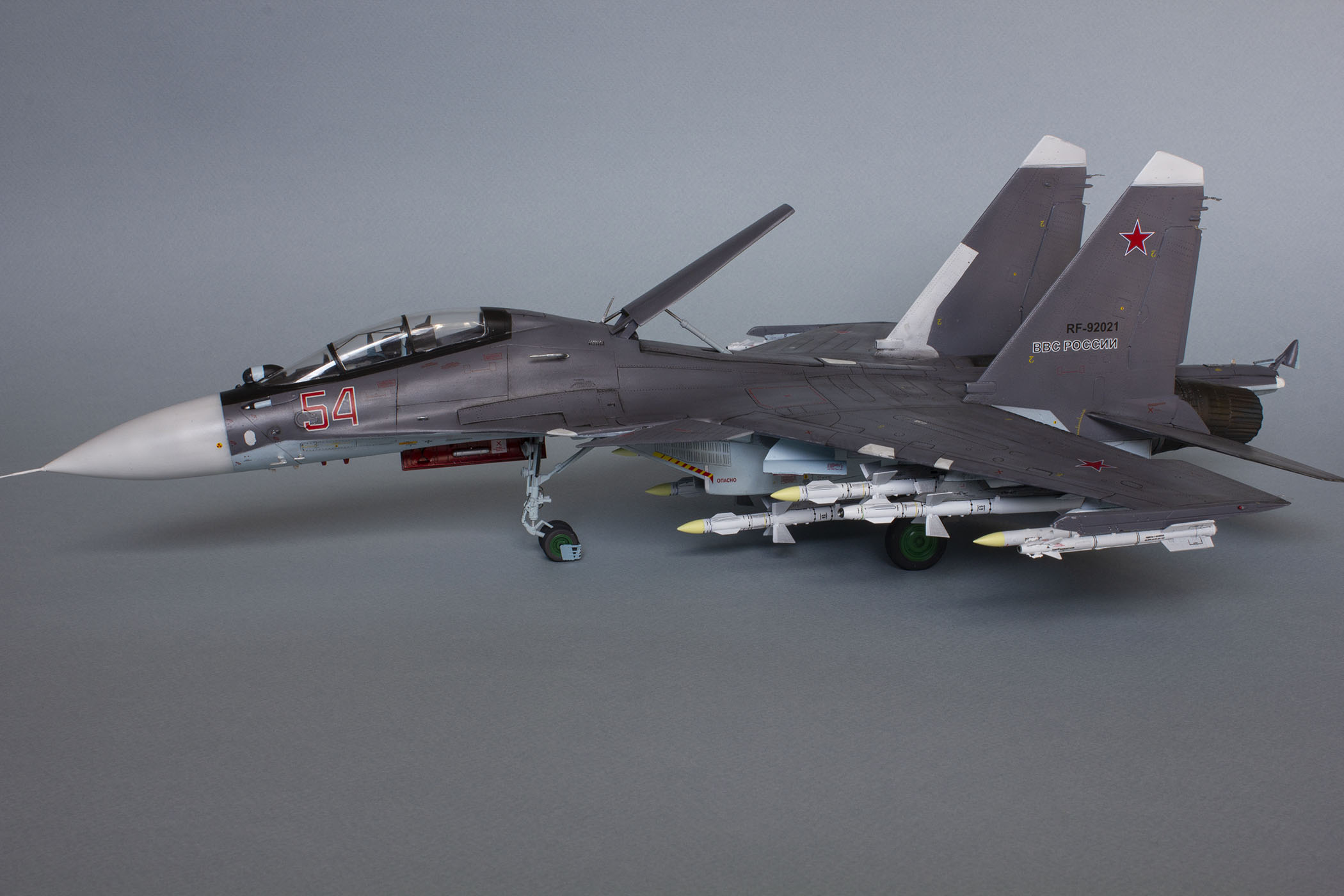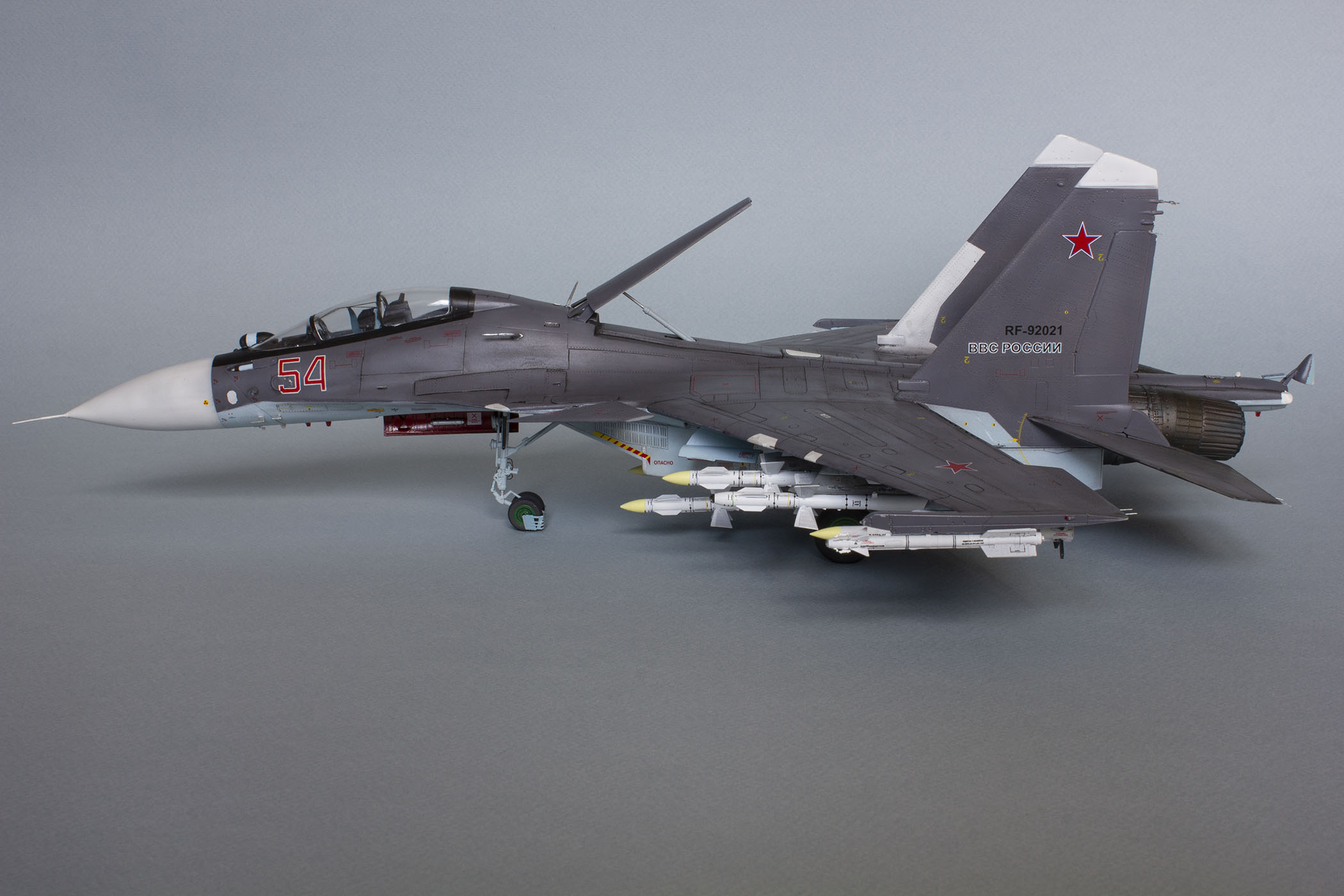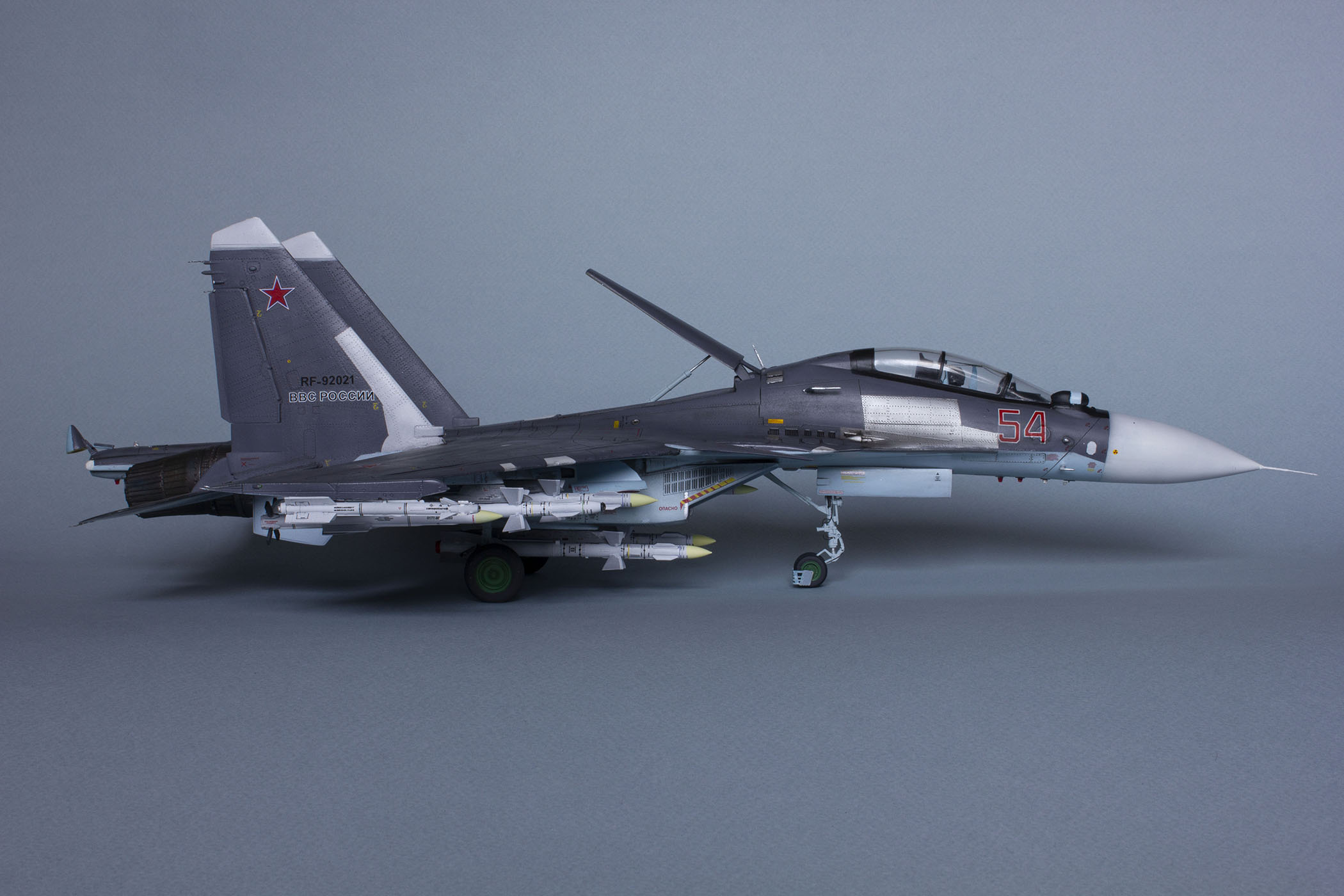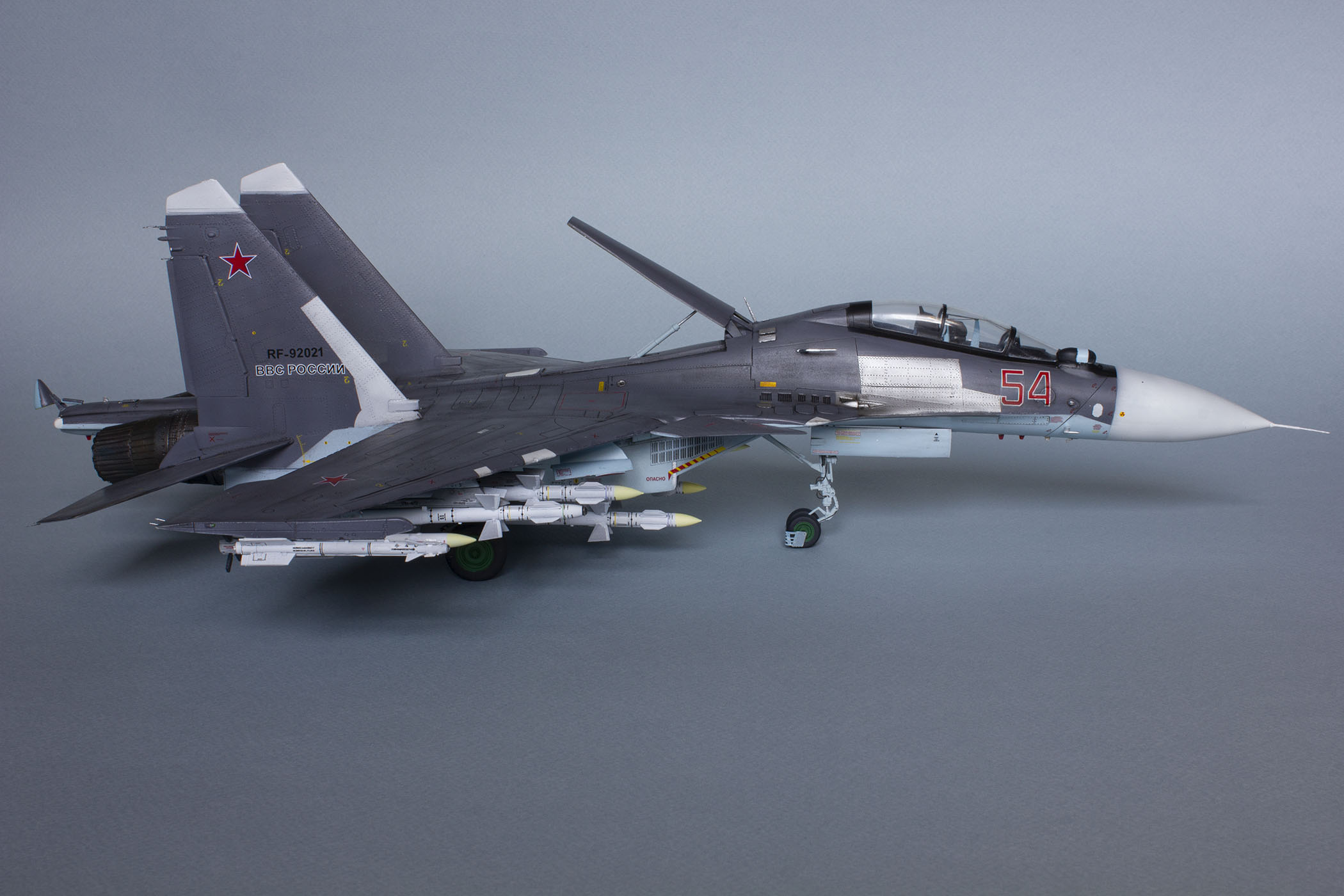 Доброго дня! Представляю Вашему вниманию модель российского тяжелого многоцелевого истребителя поколения 4++ СУ-30СМ. Данную модель собирал на основе академовского набора СУ-30М2. Приобрёл я его ещё в 2016 году и на протяжении трёх лет неспешно собирал, периодически закидывая на полку, так как перепил требует вложения и сил, и времени, и терпения. Это мой первый перепил такого масштаба и моя первая модель на каропке.