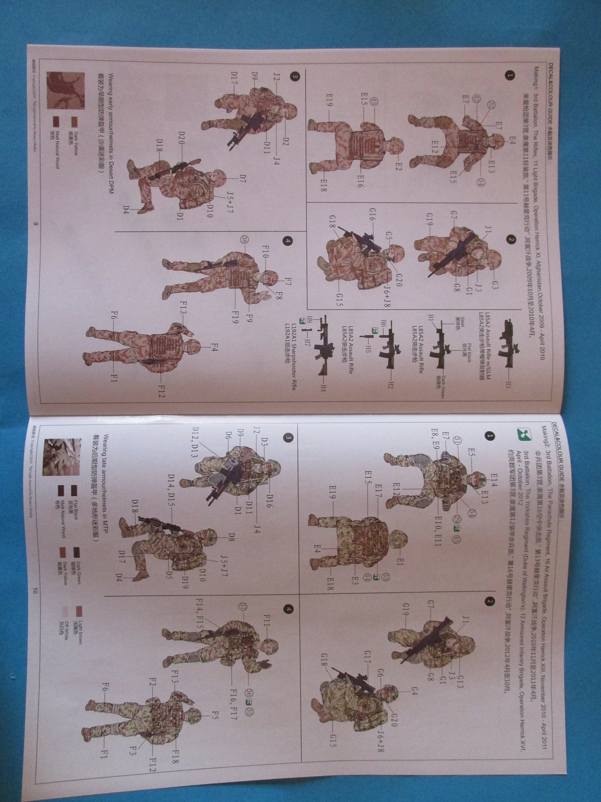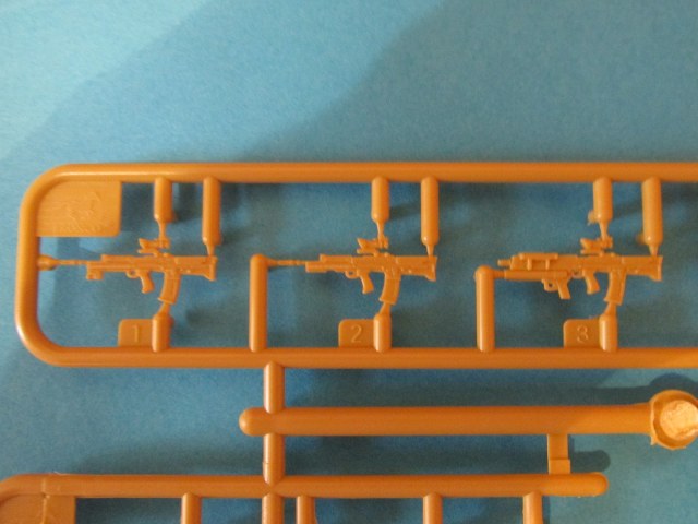 На крайнем литнике пара рюкзаков, ремни к ним, винтовки и сошки к ним. Вооружение солдат представлена тремя L85A2 под патрон 223 rem. (5,56х45NATO) и L192A1 (британское обозначение немецкой винтовки HK417) под патрон 308win.