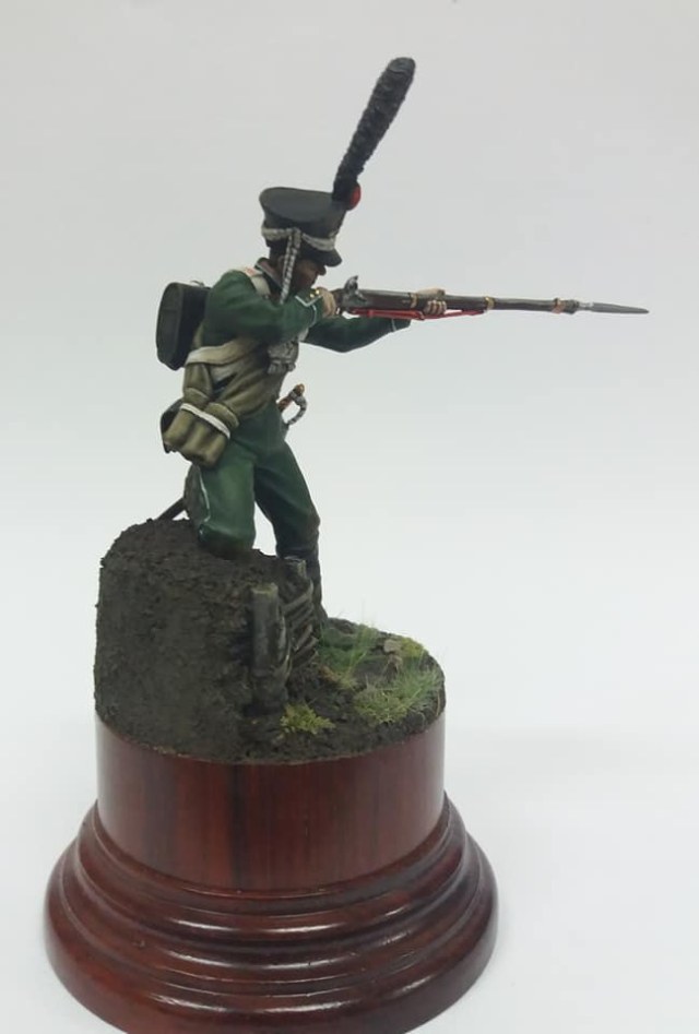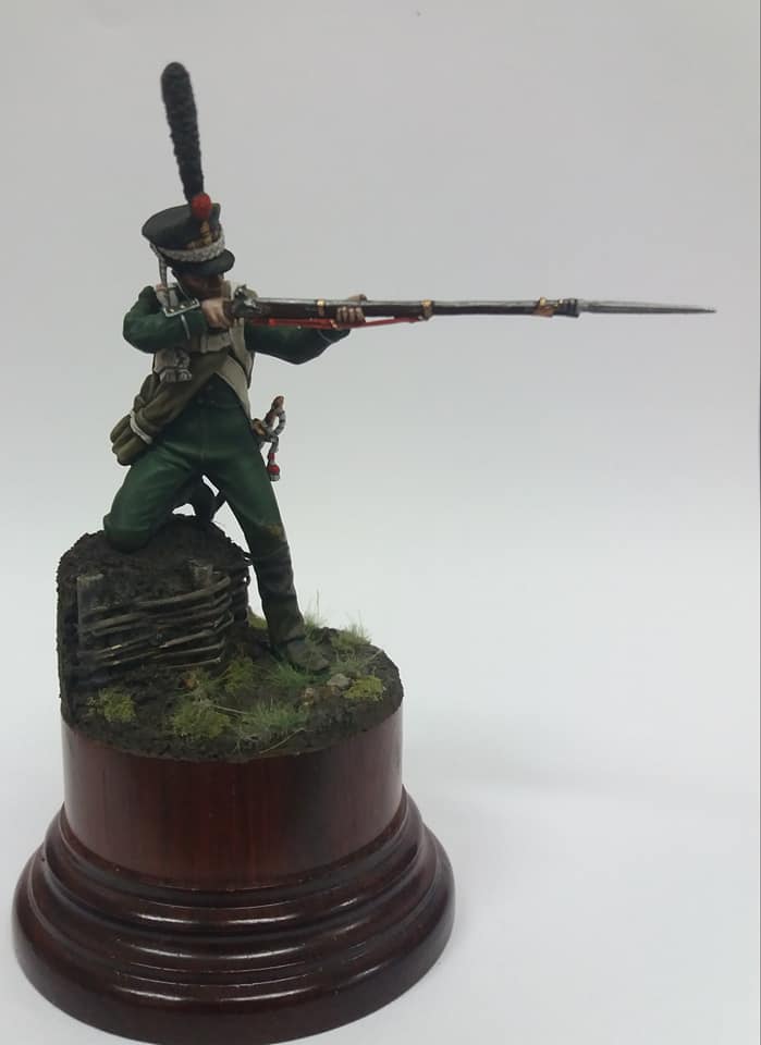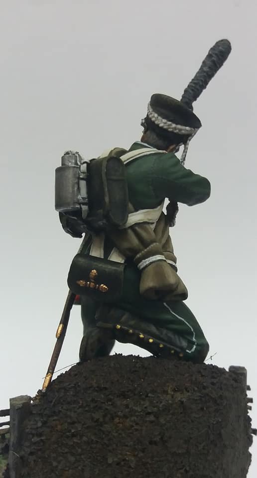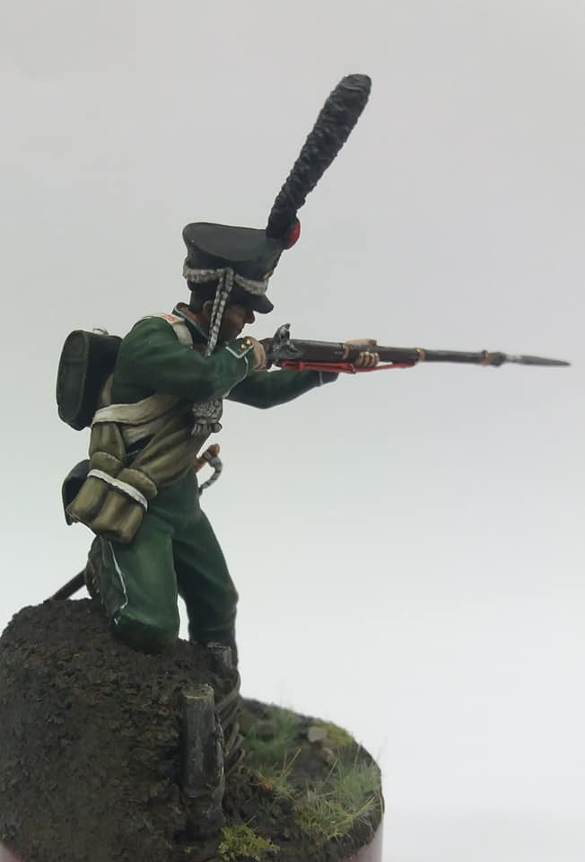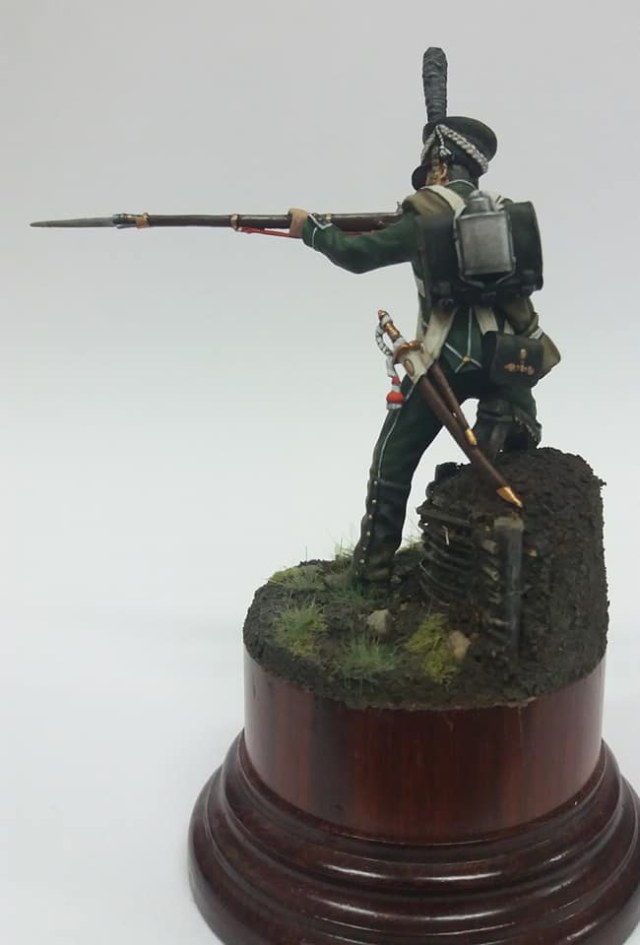 Рядовой гренадерской роты 2-го Морского полка. 1812 год, Россия. Олово, 54 мм. Роспись: акрил, темпера, масло. Основание самодельное из различных материалов.