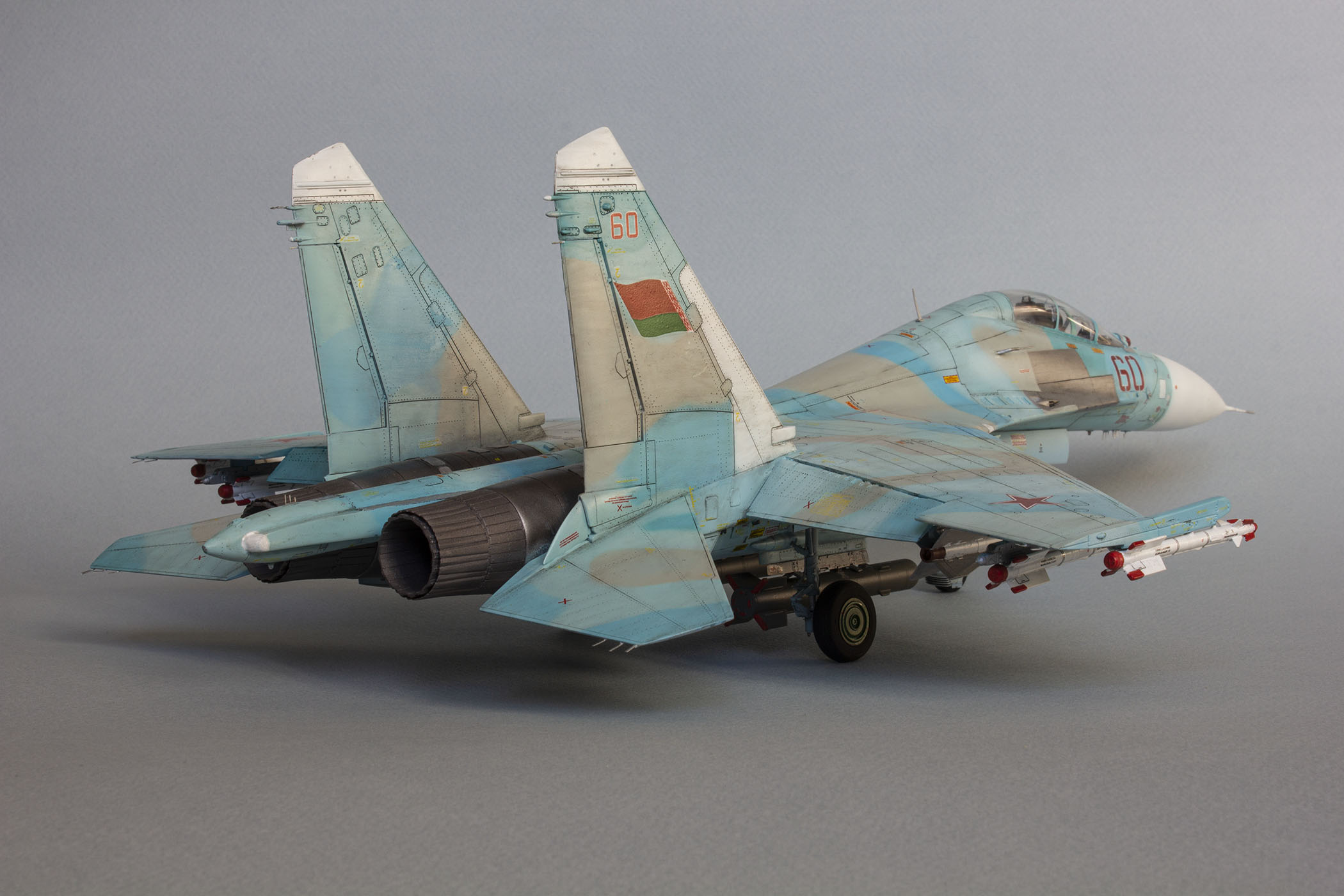 Убрал лишнюю расшивку, характерную для академовских сушек и нанёс новую расшивку и клёпку. Удлинил воздушный тормоз. Добавил различные патрубки. Проработал ниши в корпусах воздухозаборников. Исправил посадочное место под пилон в хвостовой части самолёта. Сделал разрядники статического электричества, а также чехол и переплёт на визир олс. Исправил точку крепления передней стойки шасси, т.к. в наборе она идёт по центру. Сделал чехлы на ракеты р-73 и бомбы каб-500. На левом киле переделал воздухозаборник. Доработал антенны.