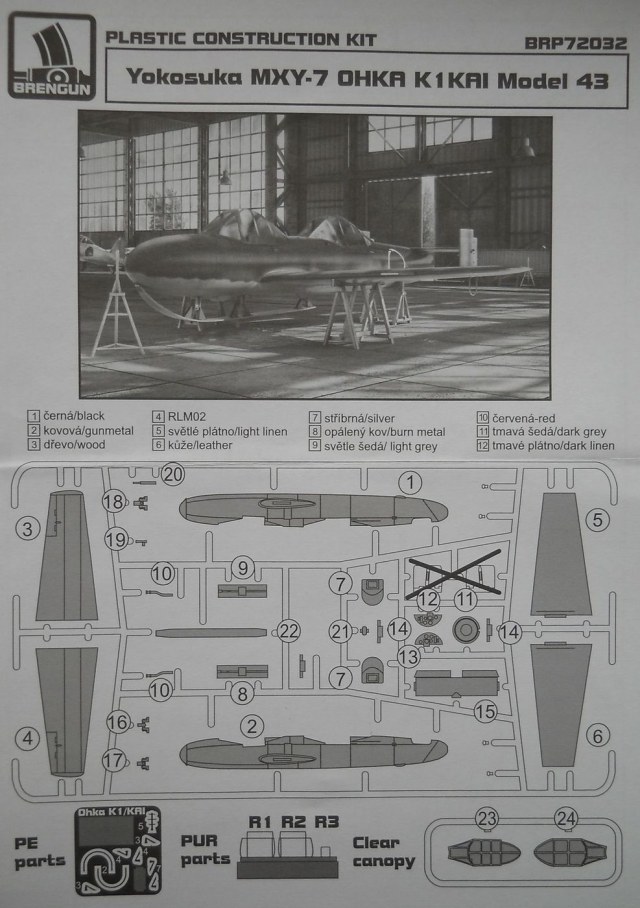 Модель от Brengun из пластика в масштабе 1/72 (номер по каталогу 72032) упакована в картонную коробку с боковым открытием. Литьё ЛНД неплохого качества: тонкая расшивка, интерьер довольно подробен. Имеется небольшая плата фототравления и несколько деталей из смолы. Пластиковый фонарь смотрится хорошо. Декаль даётся "универсальная", она идёт у Brengun на несколько вариантов Ohka. Вариант окраски предлагается один. Инструкция по сборке подробна и информативна.