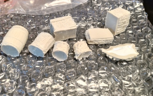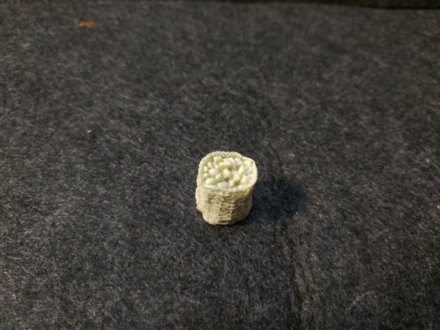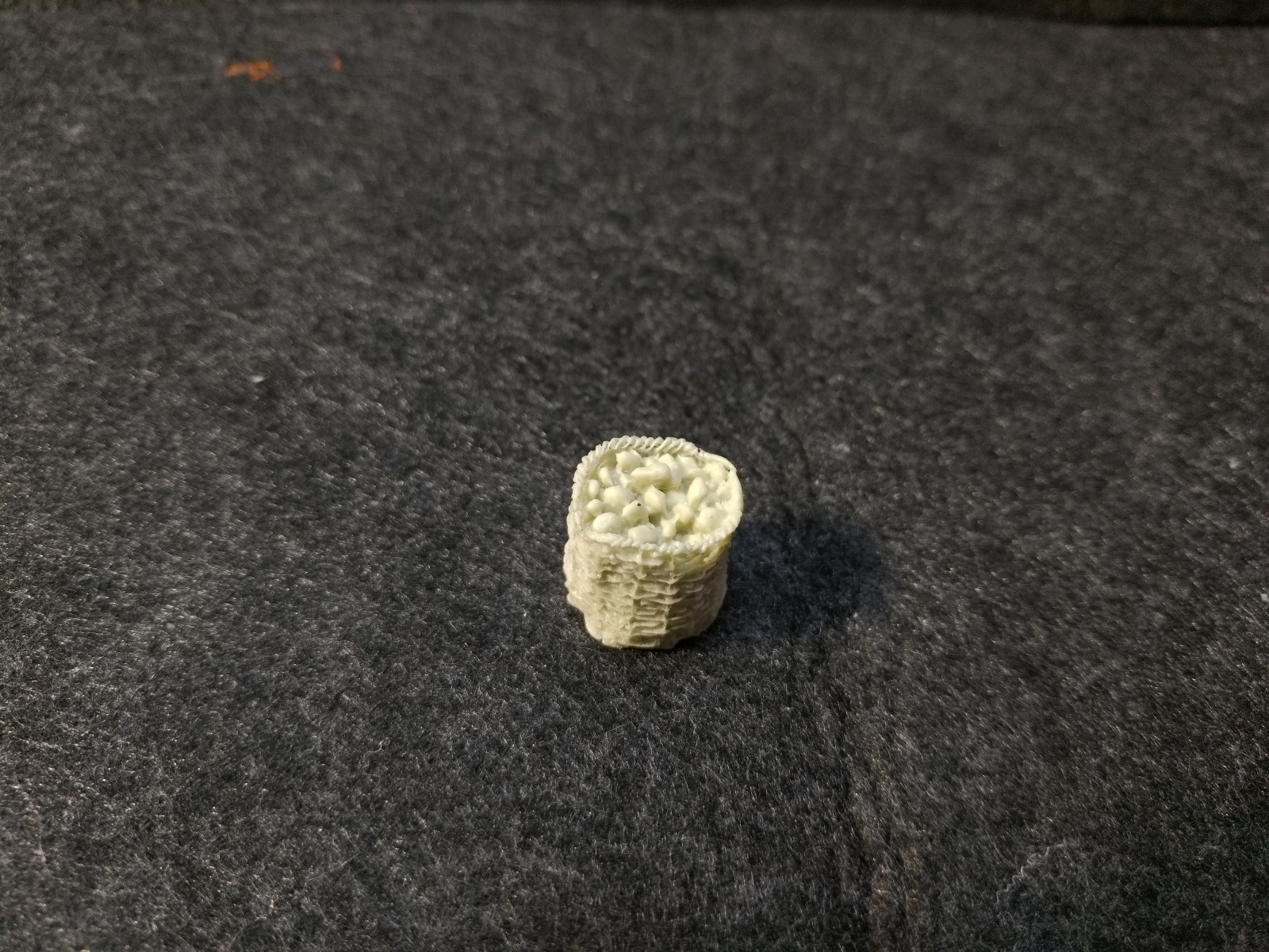 Личные впечателения от содержимого - набор в целом добротный: явных перекосов или косяков влияющих на внешний вид почти нет. Имитация плетения на корзинах правда сделана довольно топорно, как будто чем-то острым в форме делали борозды из которых потом получилось плетение. В целом, если покрасить и не рассматривать под лупой должно получиться похоже. На одном из мешков есть небольшой облой, который будет легко убрать. В бочке внутри есть какой-то мусор, прилипший к стенке. И еще обруч самый верхний получился каким-то ломаным, нужно будет допиливать. В остальном потребуется только стесать с днища примерно 2мм чтобы фигуры нормально и выглядели и лежали на земле. Хотя все-равно у днища контур не очень ровный как и граница плетения. По этому лучше конечно низ будет прикрывать.