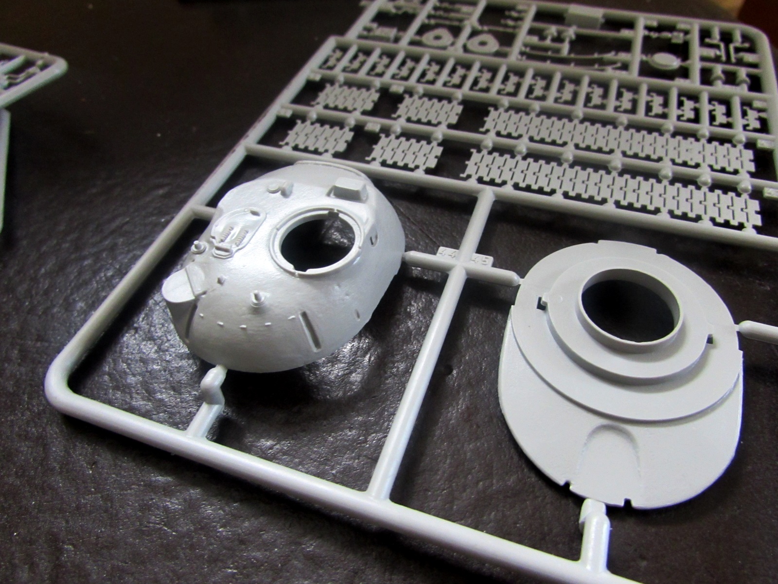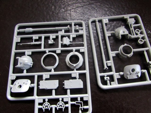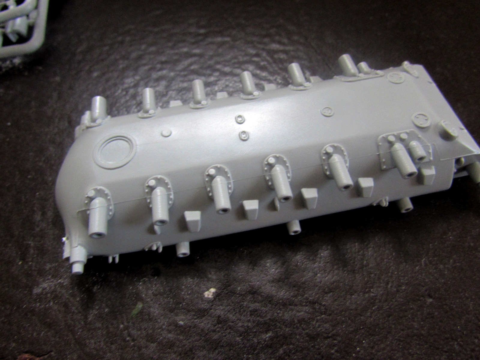 1. Корпус отлит очень неплохо - за исключением крыши МТО: утяжины и переливы превращают ровно-наклонную поверхность крыши в лунный ландшафт. Если на сером пластике, как в этом наборе, это еще не сильно заметно, то на оливковом (в другом и у Revell) эта часть корпуса выглядит просто позорно.