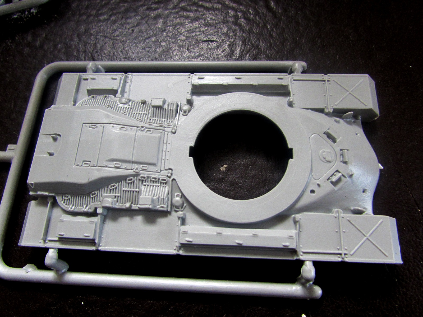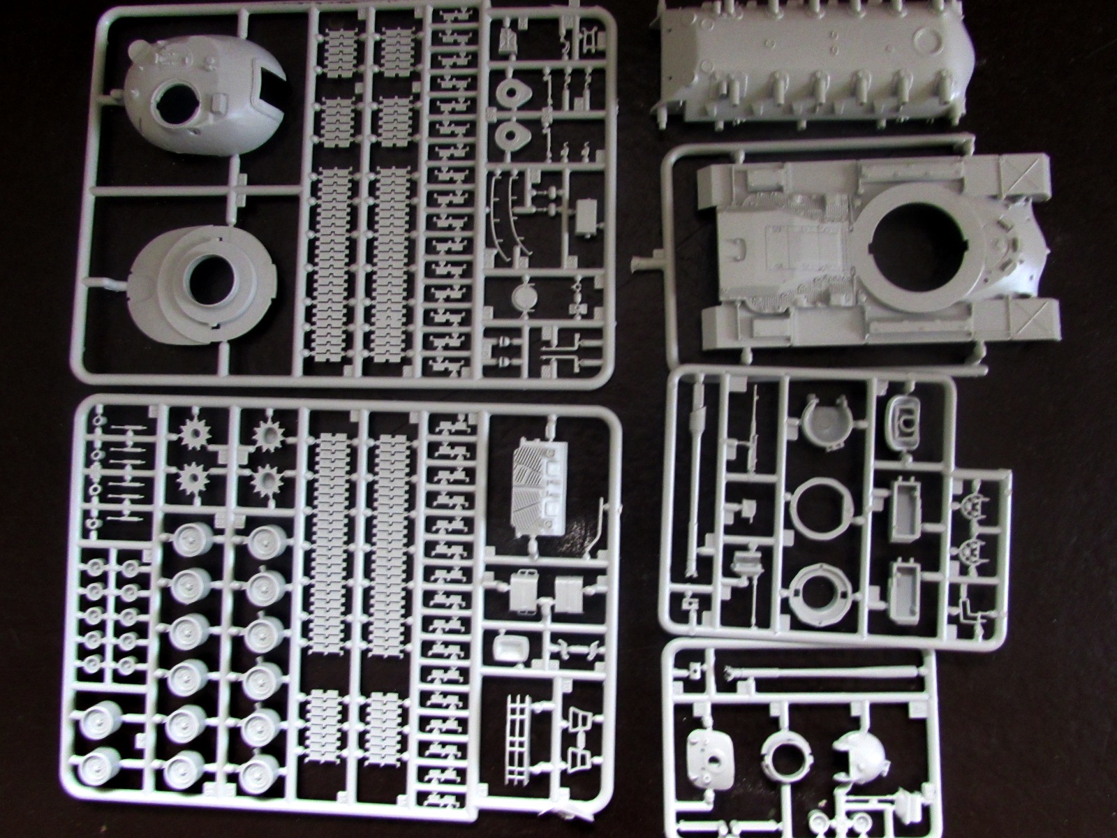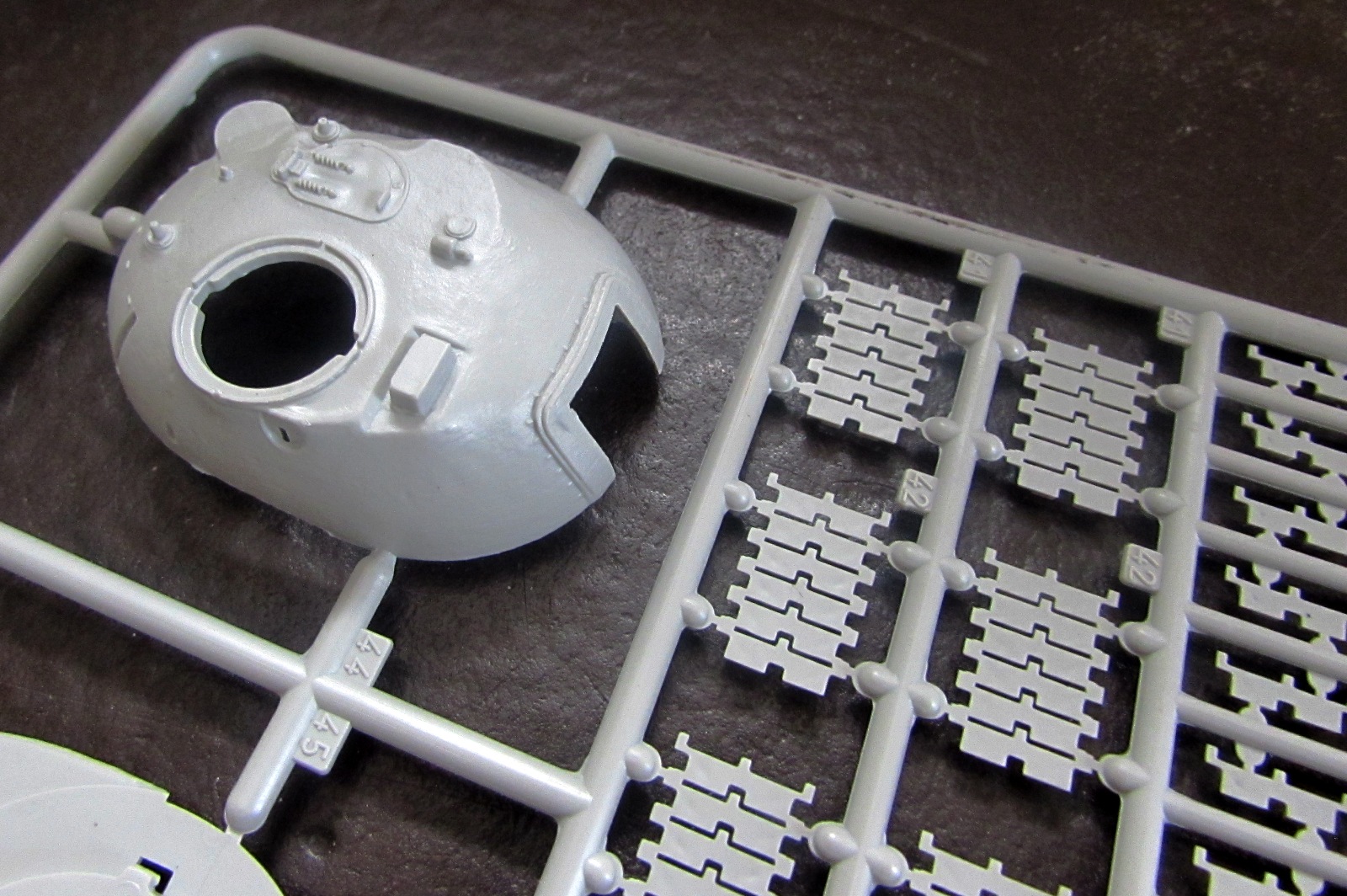 1. Корпус отлит очень неплохо - за исключением крыши МТО: утяжины и переливы превращают ровно-наклонную поверхность крыши в лунный ландшафт. Если на сером пластике, как в этом наборе, это еще не сильно заметно, то на оливковом (в другом и у Revell) эта часть корпуса выглядит просто позорно.