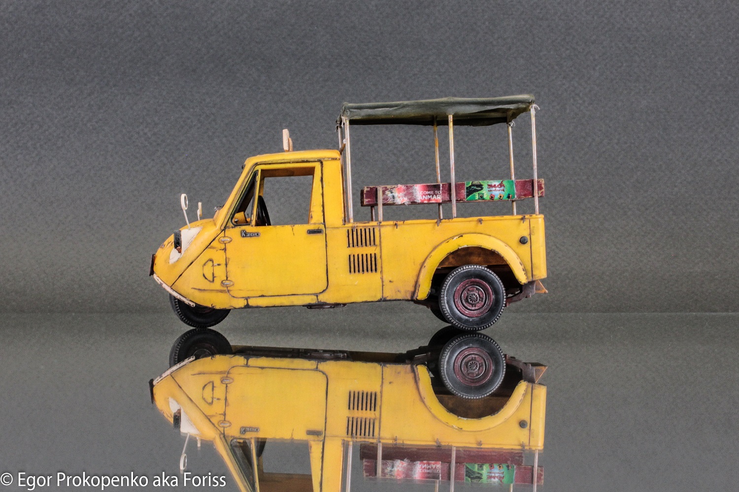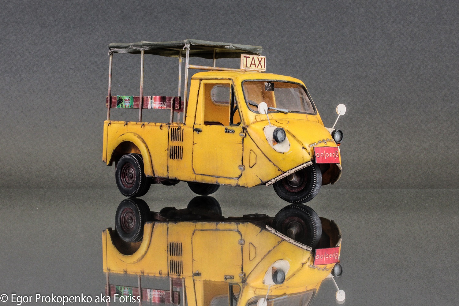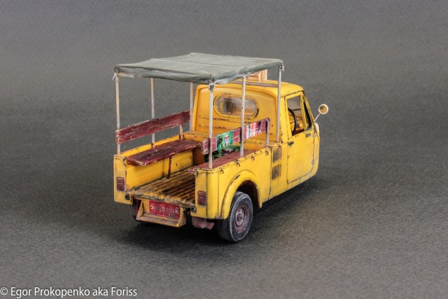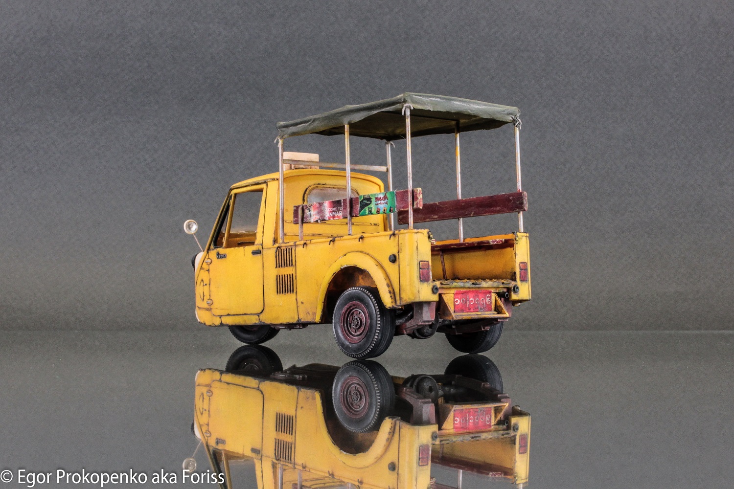 Сам набор не предусматривает какого-то интересного прототипа, поэтому на помощь пришел интернет, и как результат – такси в Мьянме. Я так понимаю, туда ввозились японские варианты, а позже там было налажено местное производство этих автомобилей с незначительными отличиями, но как показывает интернет они там эксплуатируются до сих пор, в качестве маршрутки!