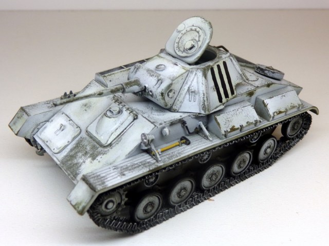 Давно хотел поставить на полочку модель маленького горьковского танчика. А заодно попытался применить так называемый метод окраски зимнего камо с использованием лака для волос. Сто раз читал про это, но что-то всё ленился это попробовать. В общем это гораздо лучше нежели просто красить в белый цвет. Хотя надо сказать, что в некоторых местах, там где хотелось, "белила" не стали слезать, а в других отвалились большими кусками. В общем, посмотрите, товарищи коллеги, может что подскажите. В остальном просто склейка из коробки, легко и без проблем.
