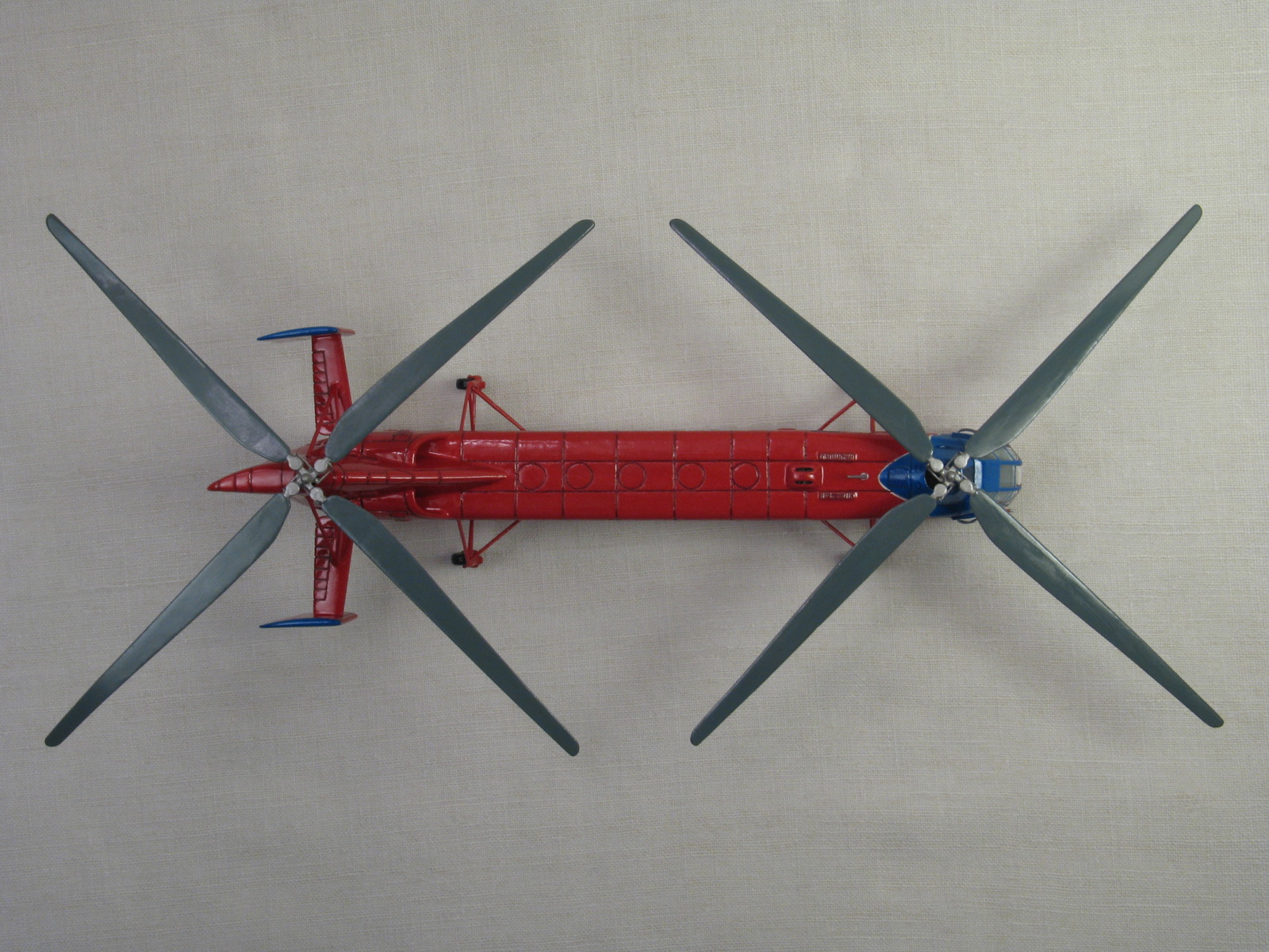 5. У одного из несущих винтов понадобилось (не без проблем) развернуть лопасти на 180 градусов, поскольку в комплекте оба НВ даются идентичными. Кроме того, пластик очень слабый, пришлось пару раз заниматься ремонтом, армируя места переломов тонкой стальной проволокой.