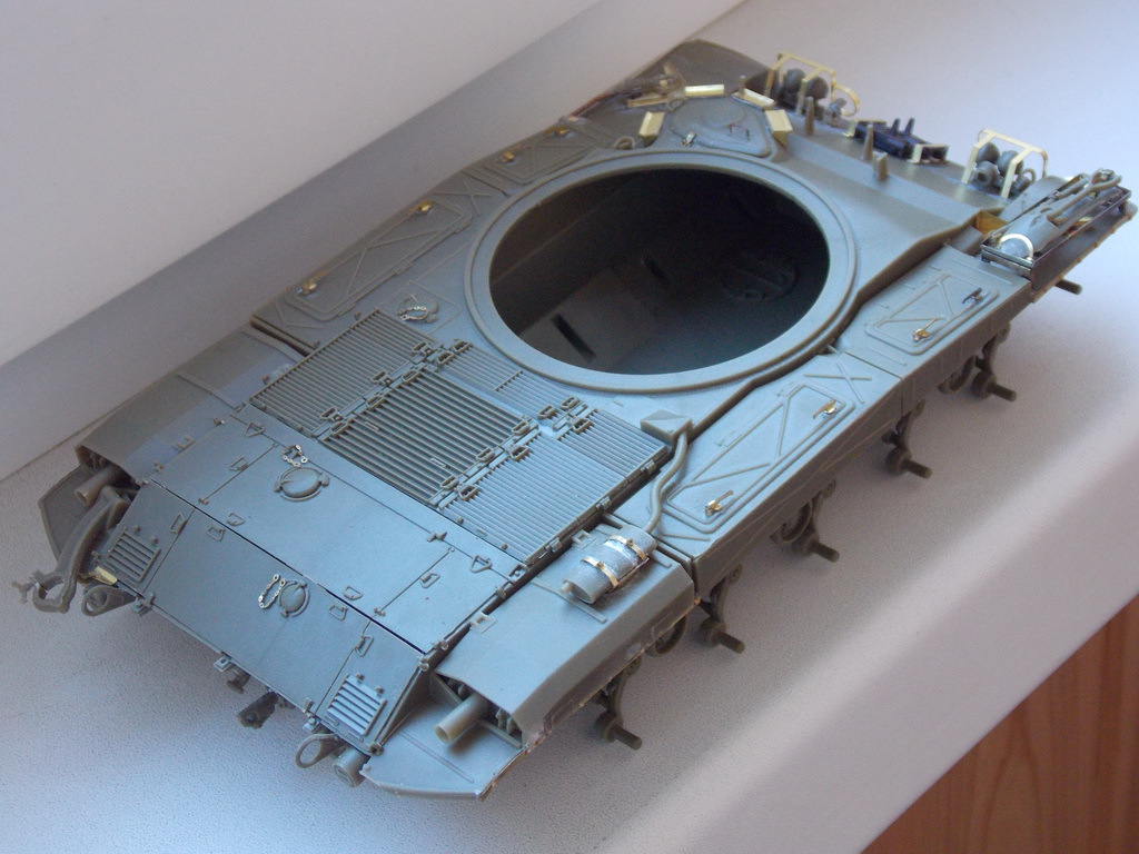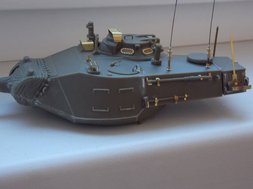 Сборка совсем почти "изкаропка", AFVшное всё,кроме травления,оно Эдиковское, и антенн "Voyager". А ещё скатки и канистры от Тамии. Подсказка-родные канистры в травлёные кронштейны не лезут совсем,даже обточенные,как рекомендует инструкция по сборке. Стыковка проблем не доставляла,от слова совсем. Малярка Тамией.
