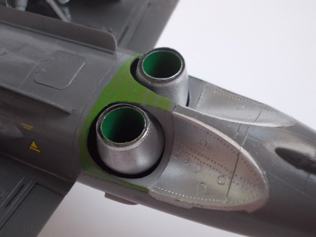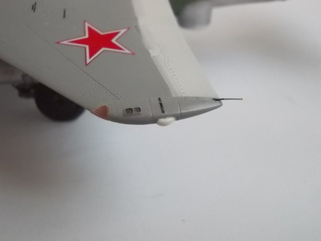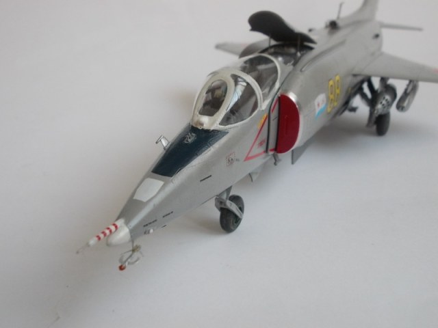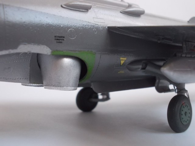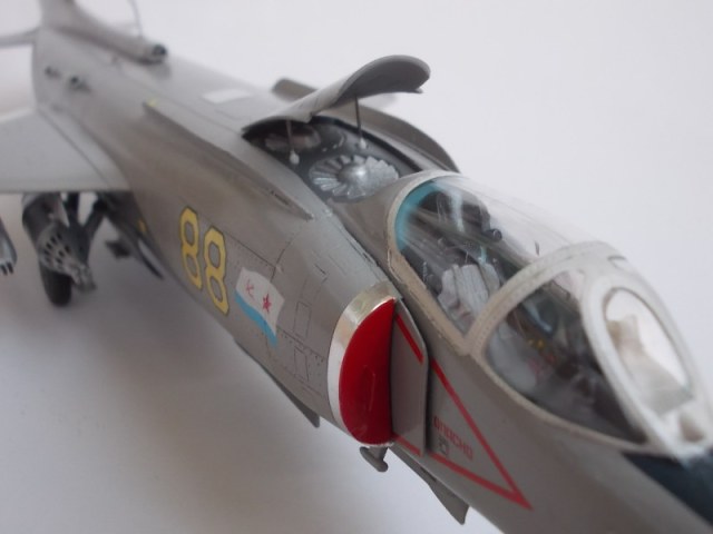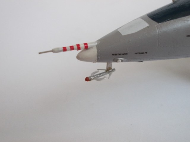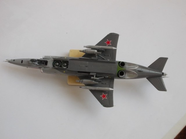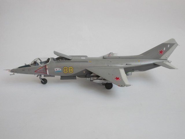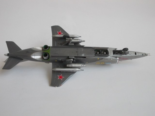 Еще раз - работа с масками на данной модели не удалась, разводы кисточкой зеленым по жопе рядом с соплами просто режет глаз, оно даже на металл затекло, механизация крыла белым - вкривь и вкось с недодувами, на руле направления снизу подтеки вверху недодувы наперекосяк, антиблик на носу чуть не на стекло заполз, окраска серповидной антенны (Ваш термин, я в Яках не силен) не удалась - клей проступил, металлик по-над соплами жахнут как будто на отъедись.