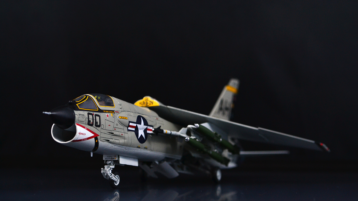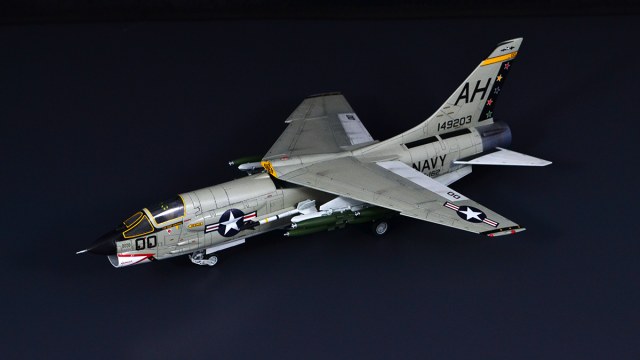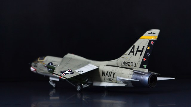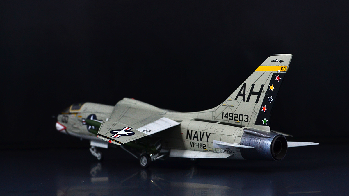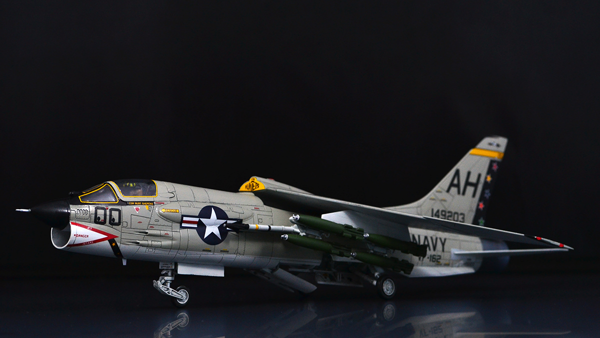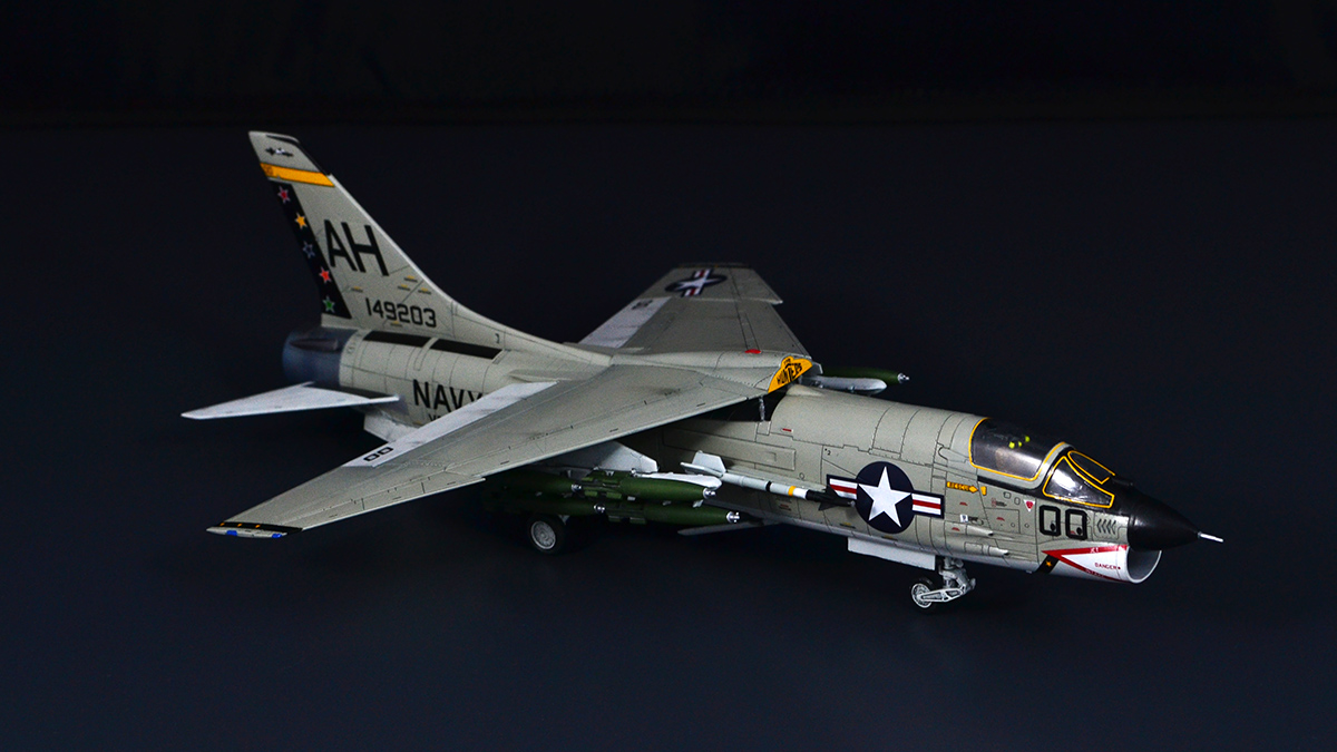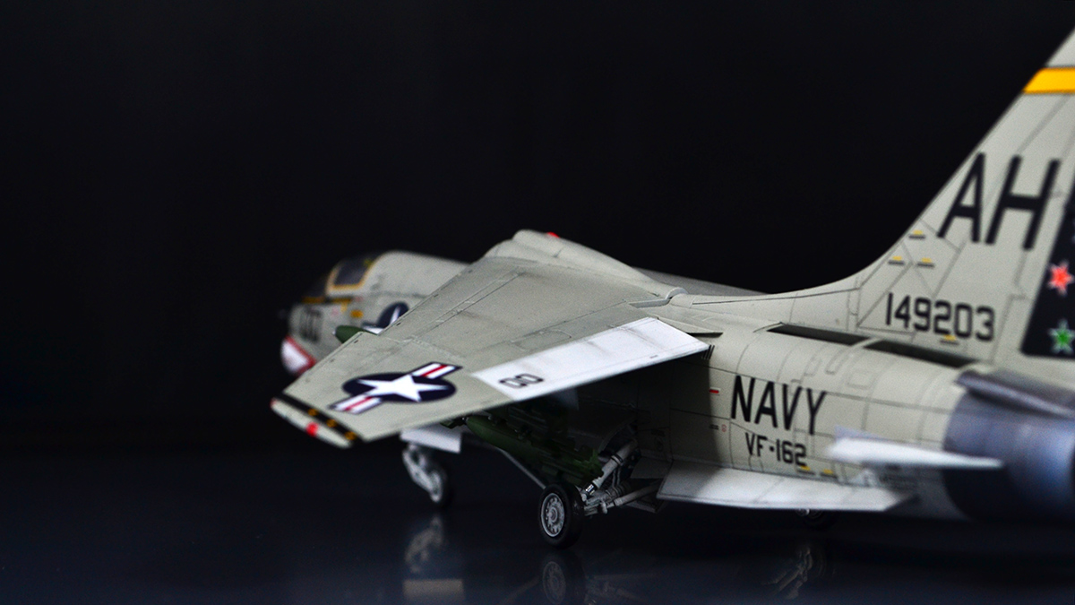 Собрался набор просто замечательно, без шпатлёвки и какой-либо подгонки, как лего. Очень понравилась расшивка, ровная, глубокая и чёткая: проливать её смывкой было сплошным удовольствием. Покрасил Ганзой (у них есть тематические цвета для американских палубников как раз), немного зачумазил тенями и залил в финале полуматовым лаком TS-79. За матчасть ничего не скажу, потому что не разбираюсь. Просто сборка-окраска из коробки. Амортстойки из фольги-самоклейки, БАНО из прозрачной эпоксидки.