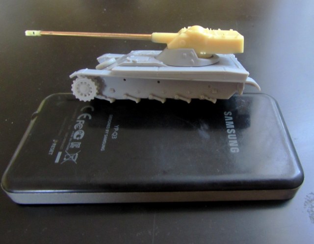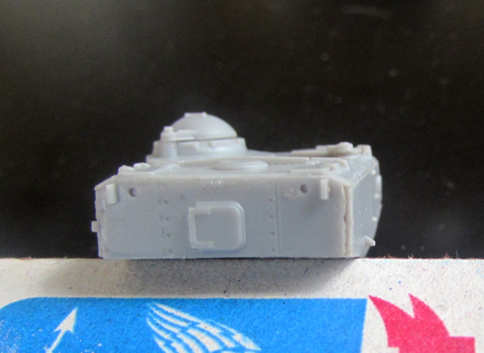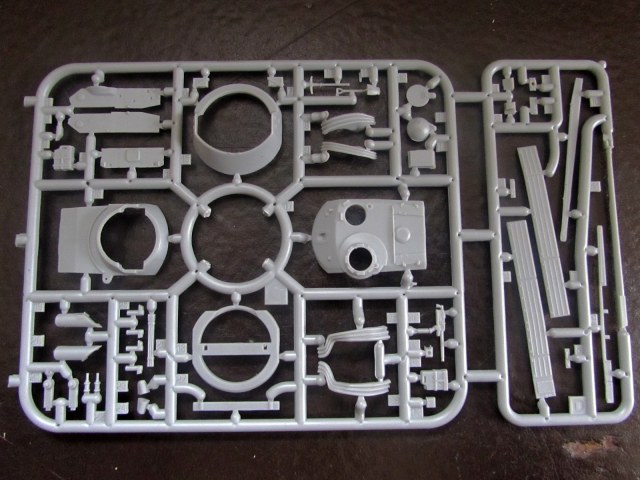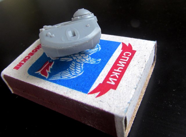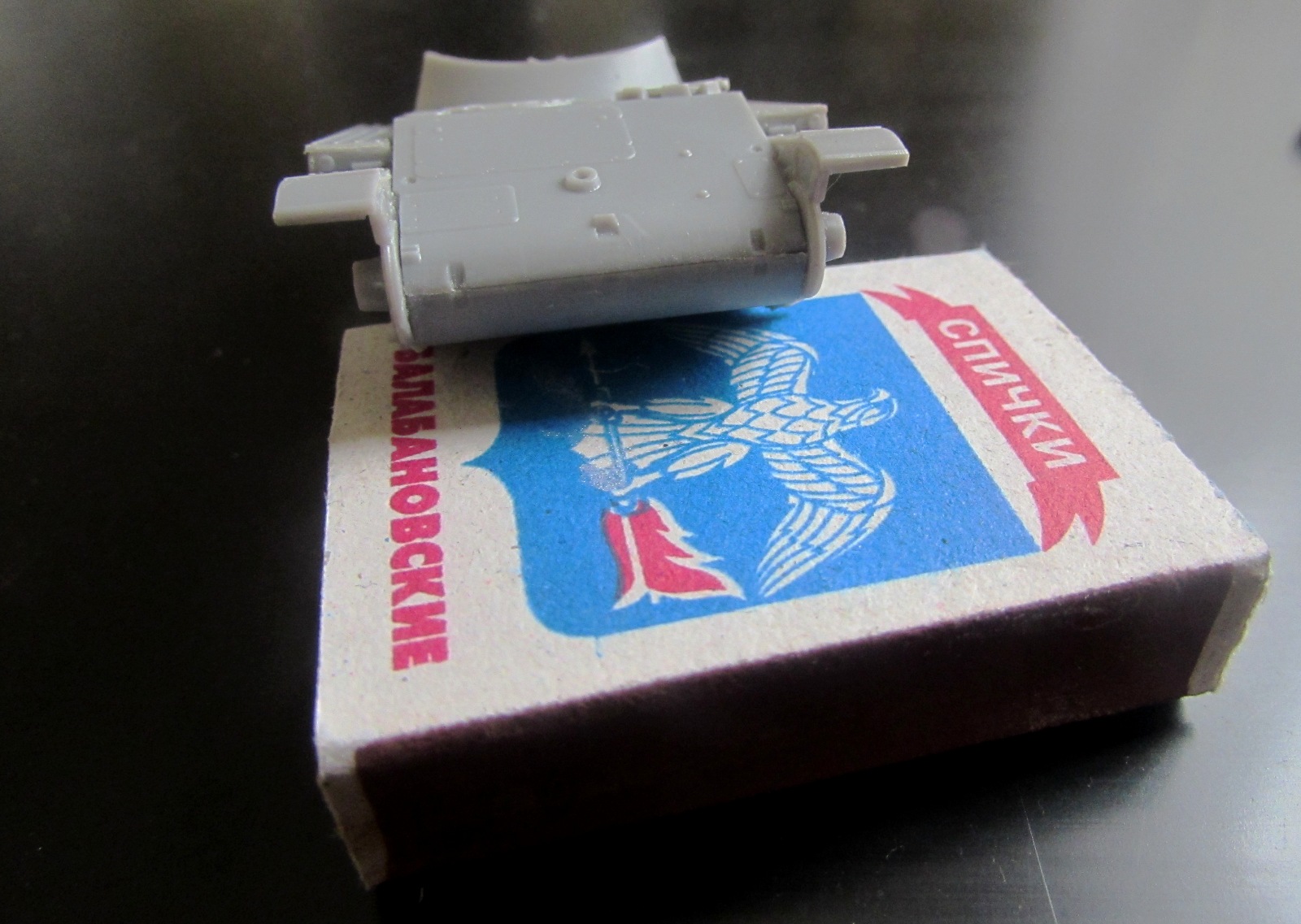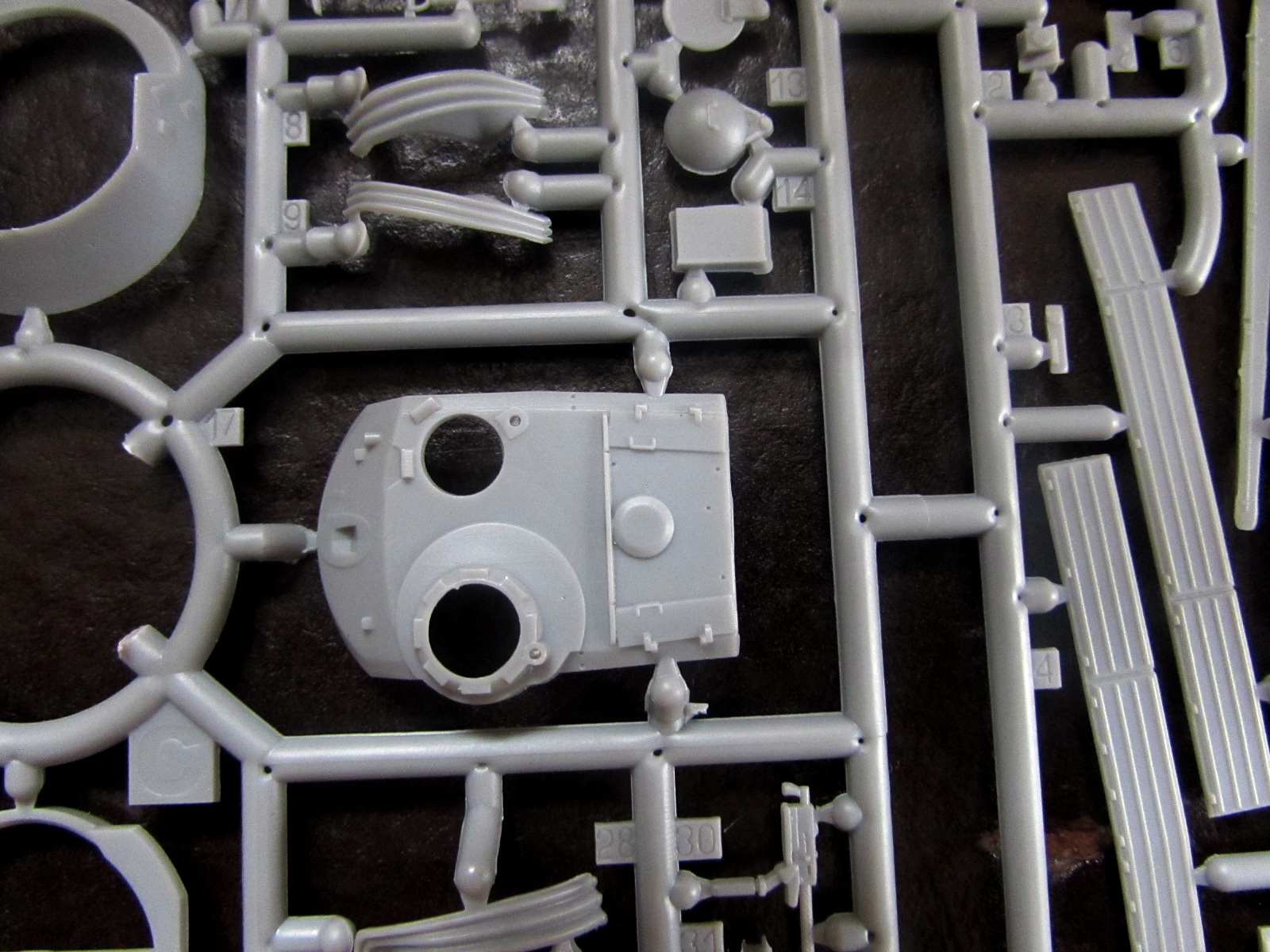 Вот тут все плохо. Главная беда АСЕ - переразмеренность/недоразмеренность мелких деталей - перешла и на обновленный дизайн. Т.Е. многие мелкие детали либо длиннее на 0,5-1,5 мм, чем надо (что не так страшно), либо короче на эти же самые доли миллиметра. ример этого можете видеть на фото кормы башни - деталька оказалась короче, чем надо. Деталь же В05 наоборот, длиннее и шире, да еще и с поплывшей нижней гранью. Тут модель очень напоминает вышедший парой лет раньше Т-60: корпус собирается не без проблем, но терпимо, башня и мелочевка - выноси святых. Ствол неплох, с облоем, но терим. При сравнении с аналогом от УМ ствол оказывается чуть короче.
