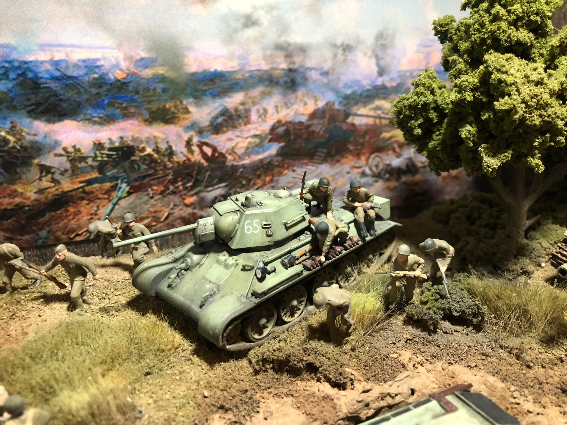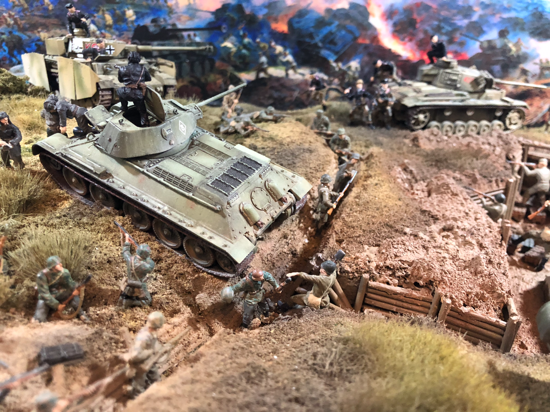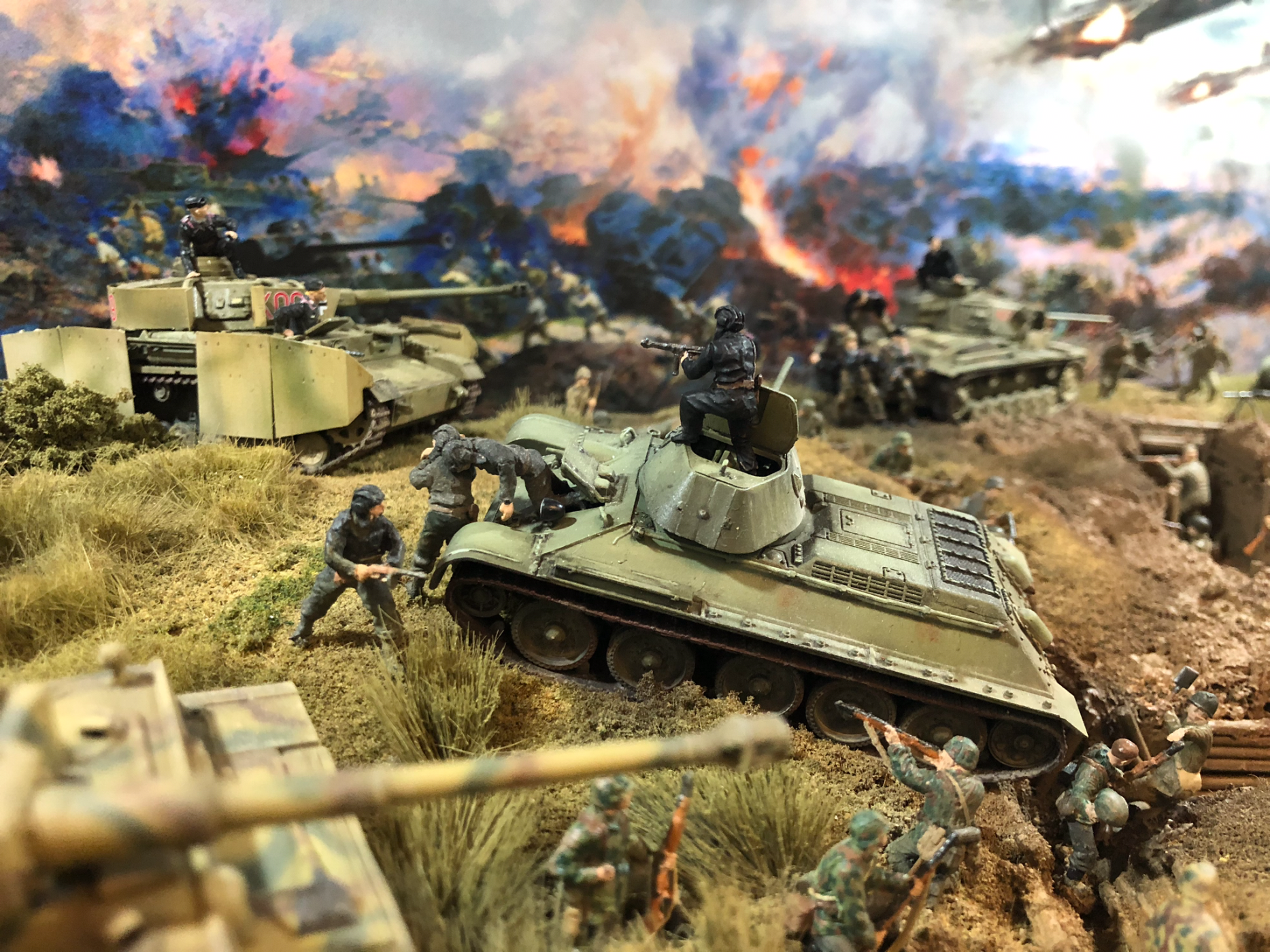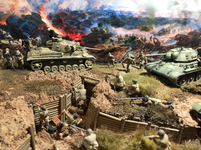 На первый взгляд диорама внушает.... А вот на второй и третий появляются вопросы... В Курской битве кто оборонялся и кто наступал? На диораме немцы в траншеях, наши атакуют... В первой линии идут самоходные гаубицы, а пехота спешивается с БТР позади артиллерии... Легкие танки, средние, тяжелые, САУ - все в одном ряду. Какая-то битва народов непонятная... При этом основание, природа, трава, окопы и траншеи - очень неплохо. Но обилие абсолютно разной техники, отсутствие логики в построениях сторон и понимания простейшей тактики боя, ненужное нагромождение деталей - полный набор типичных ошибок начинающих диорамщиков)))) Им хочется всего и много, сразу с замахом на Бородинскую диораму и картины Верещагина да еще и в стиле кинофильмов Ю.Озерова.....