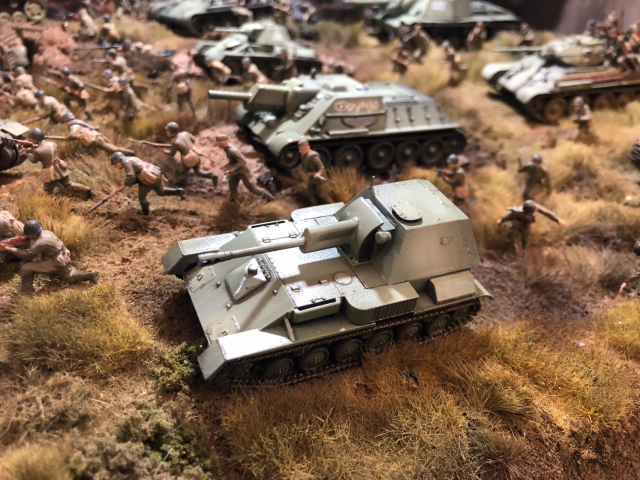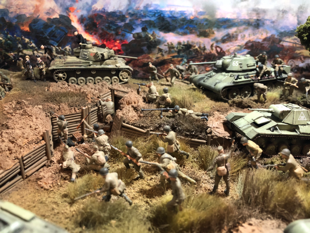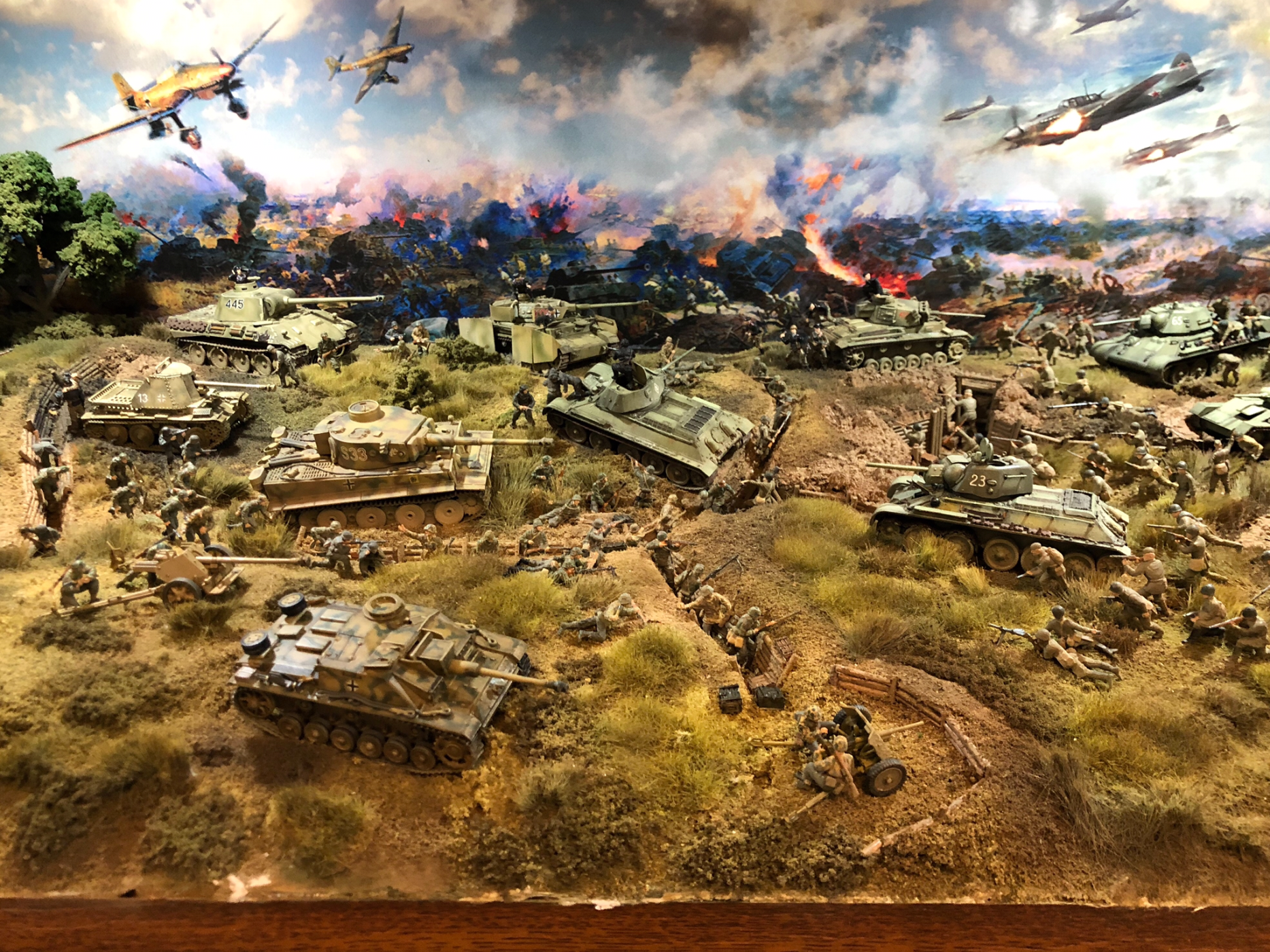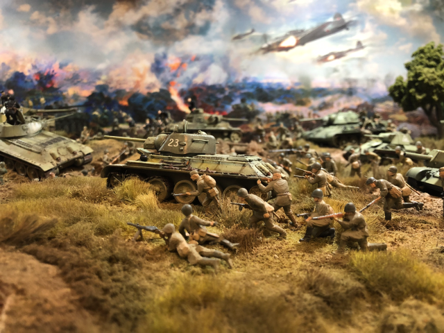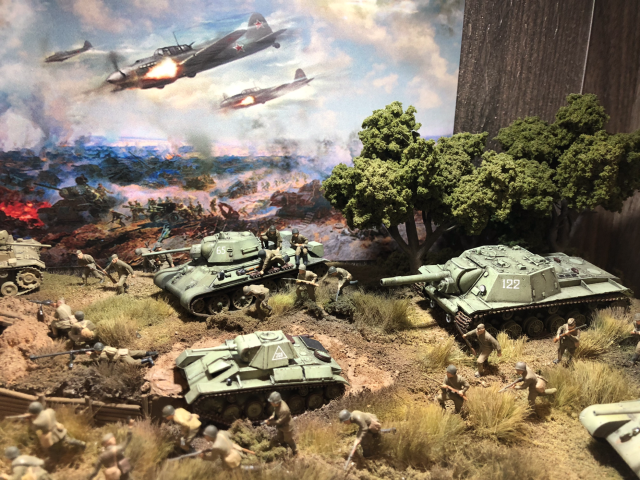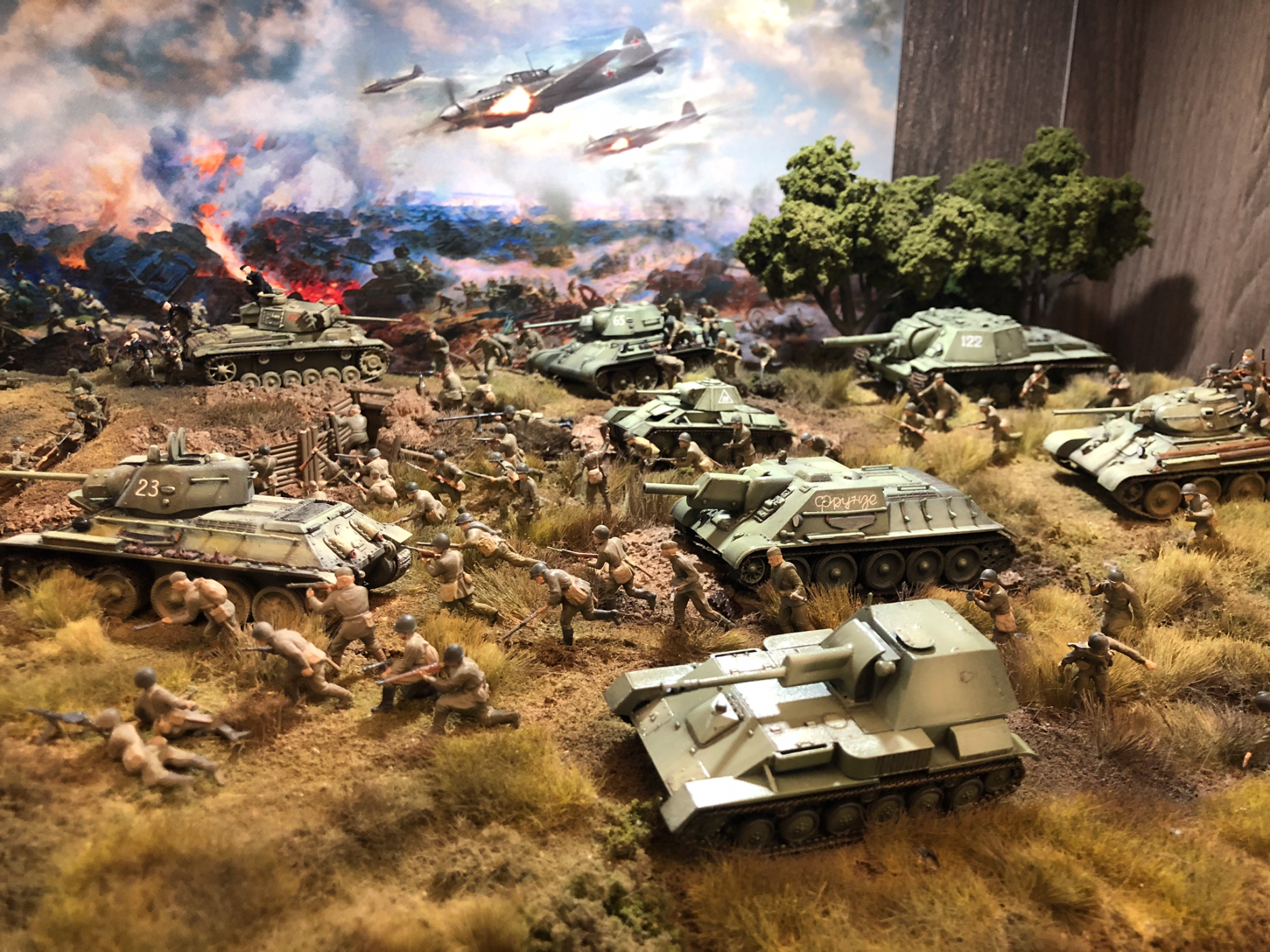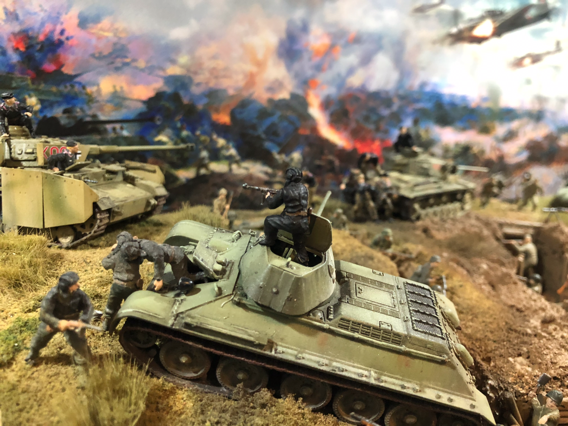 На первый взгляд диорама внушает.... А вот на второй и третий появляются вопросы... В Курской битве кто оборонялся и кто наступал? На диораме немцы в траншеях, наши атакуют... В первой линии идут самоходные гаубицы, а пехота спешивается с БТР позади артиллерии... Легкие танки, средние, тяжелые, САУ - все в одном ряду. Какая-то битва народов непонятная... При этом основание, природа, трава, окопы и траншеи - очень неплохо. Но обилие абсолютно разной техники, отсутствие логики в построениях сторон и понимания простейшей тактики боя, ненужное нагромождение деталей - полный набор типичных ошибок начинающих диорамщиков)))) Им хочется всего и много, сразу с замахом на Бородинскую диораму и картины Верещагина да еще и в стиле кинофильмов Ю.Озерова.....