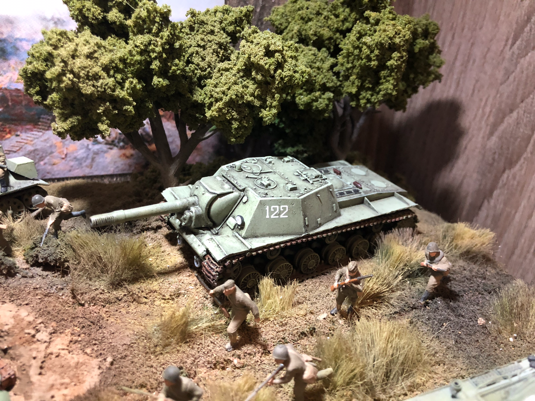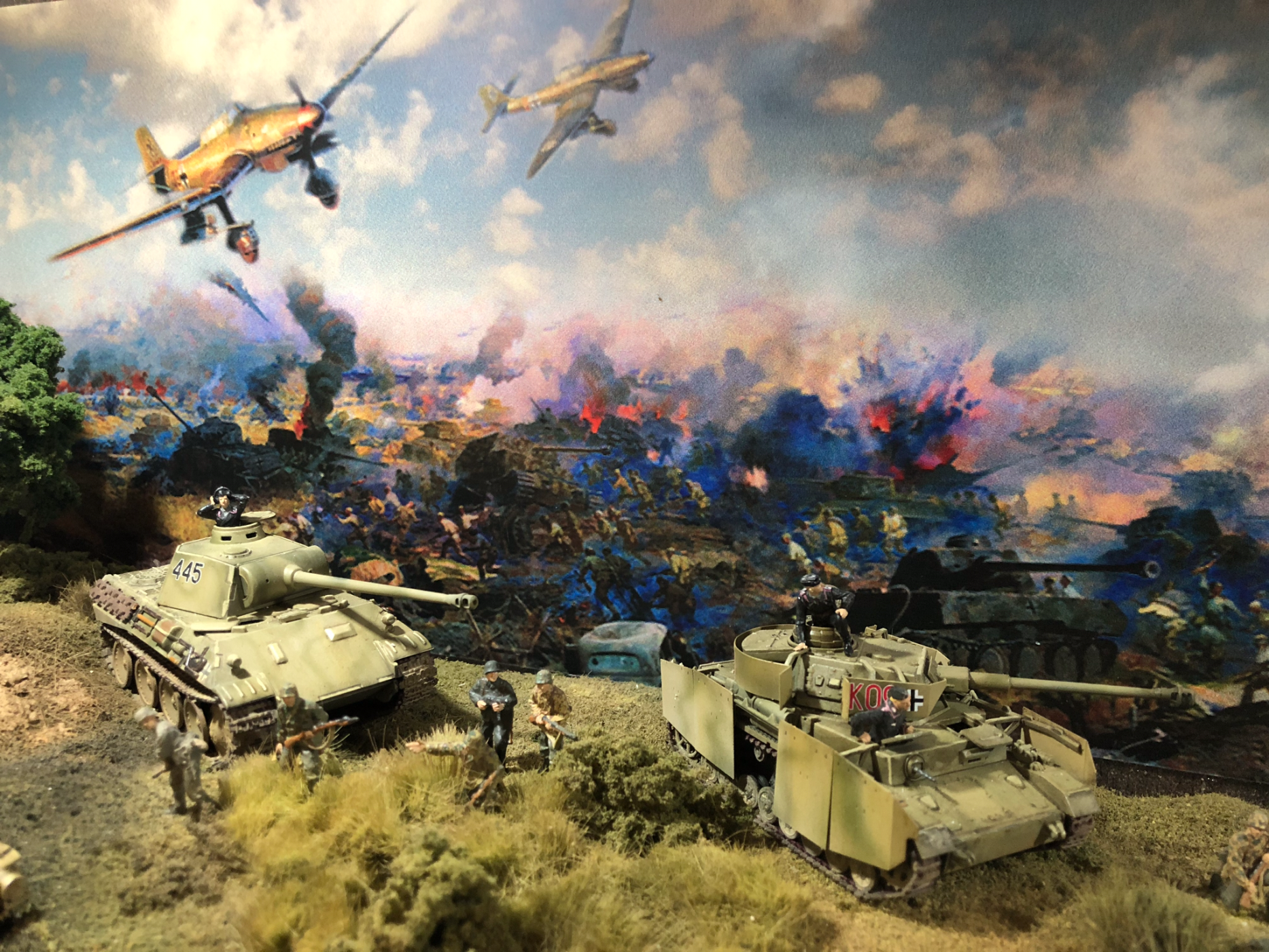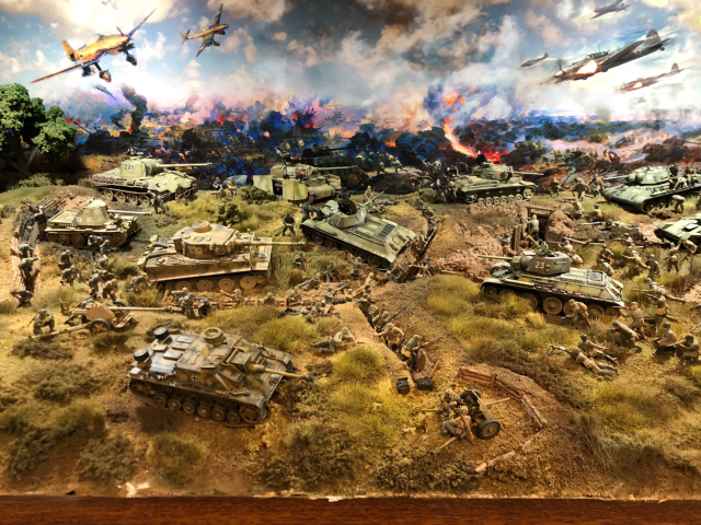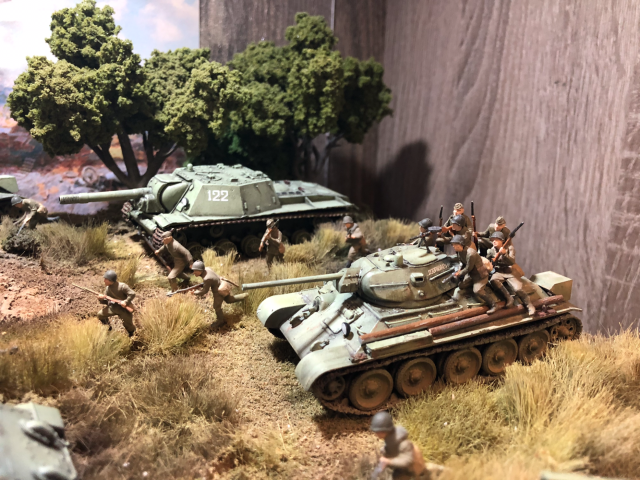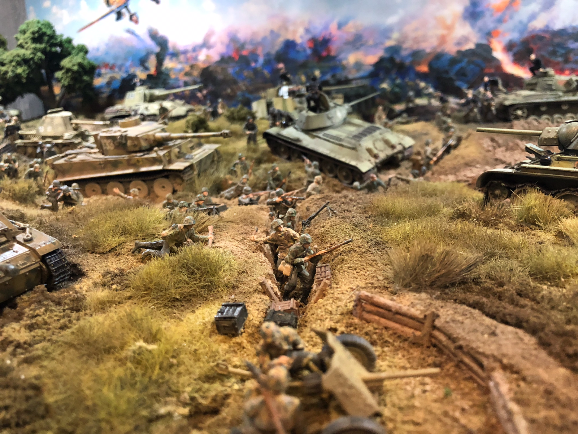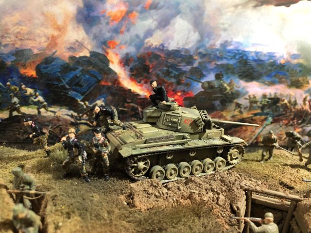 на мой взгляд в диораме не хватает сюжета. больше похоже на военный музей техники которая принимала участие в боях. я так понимаю взрывать и ломать технику автор не хотел. а без этого, без взрывов, без дыма, без гари увы ...... на заднем плане на картинке все показано. если я бы такое делал то попытался бы сделать как на картинке. или развел бы войска и сюжет был бы за минуту до начала.