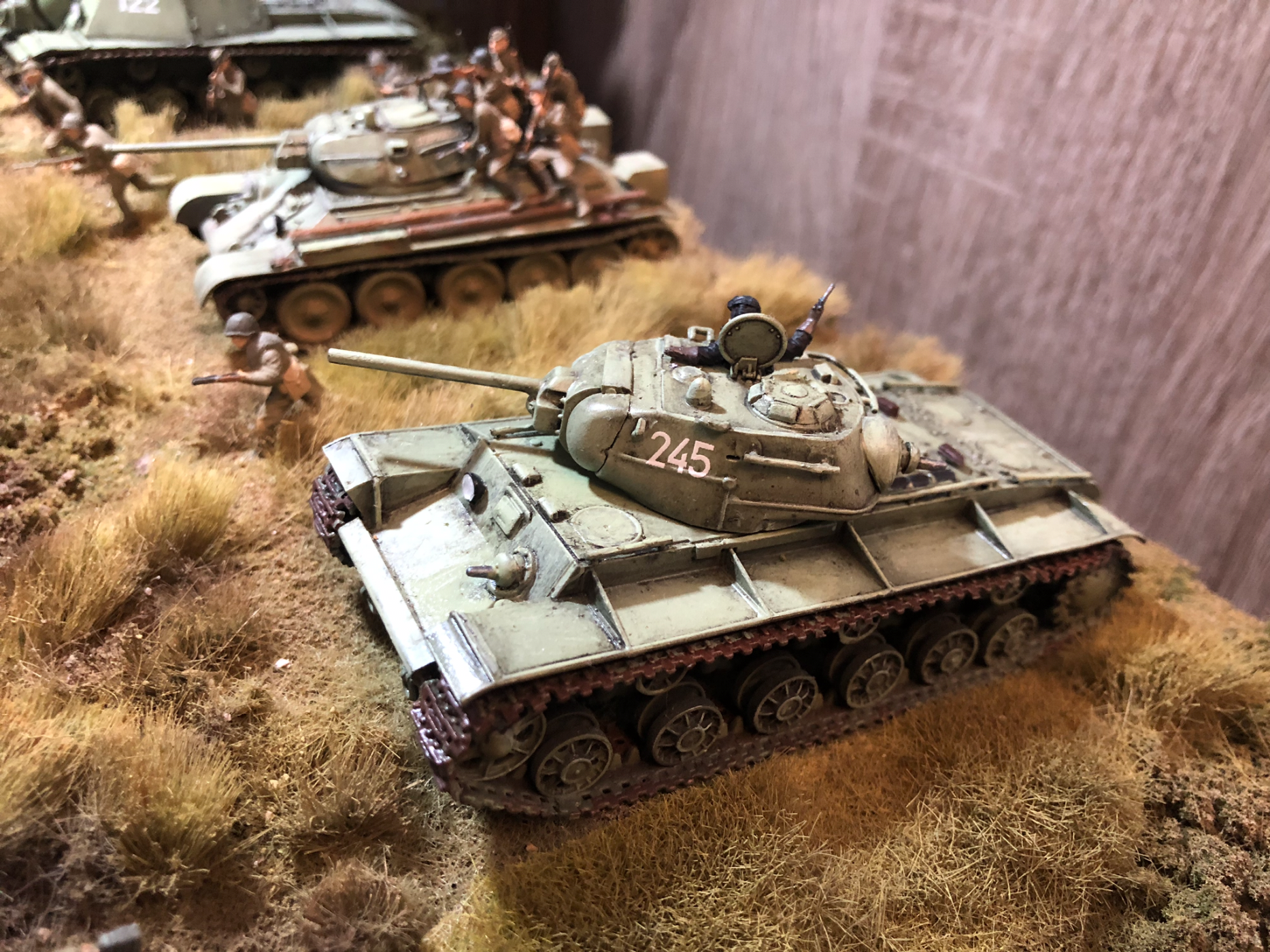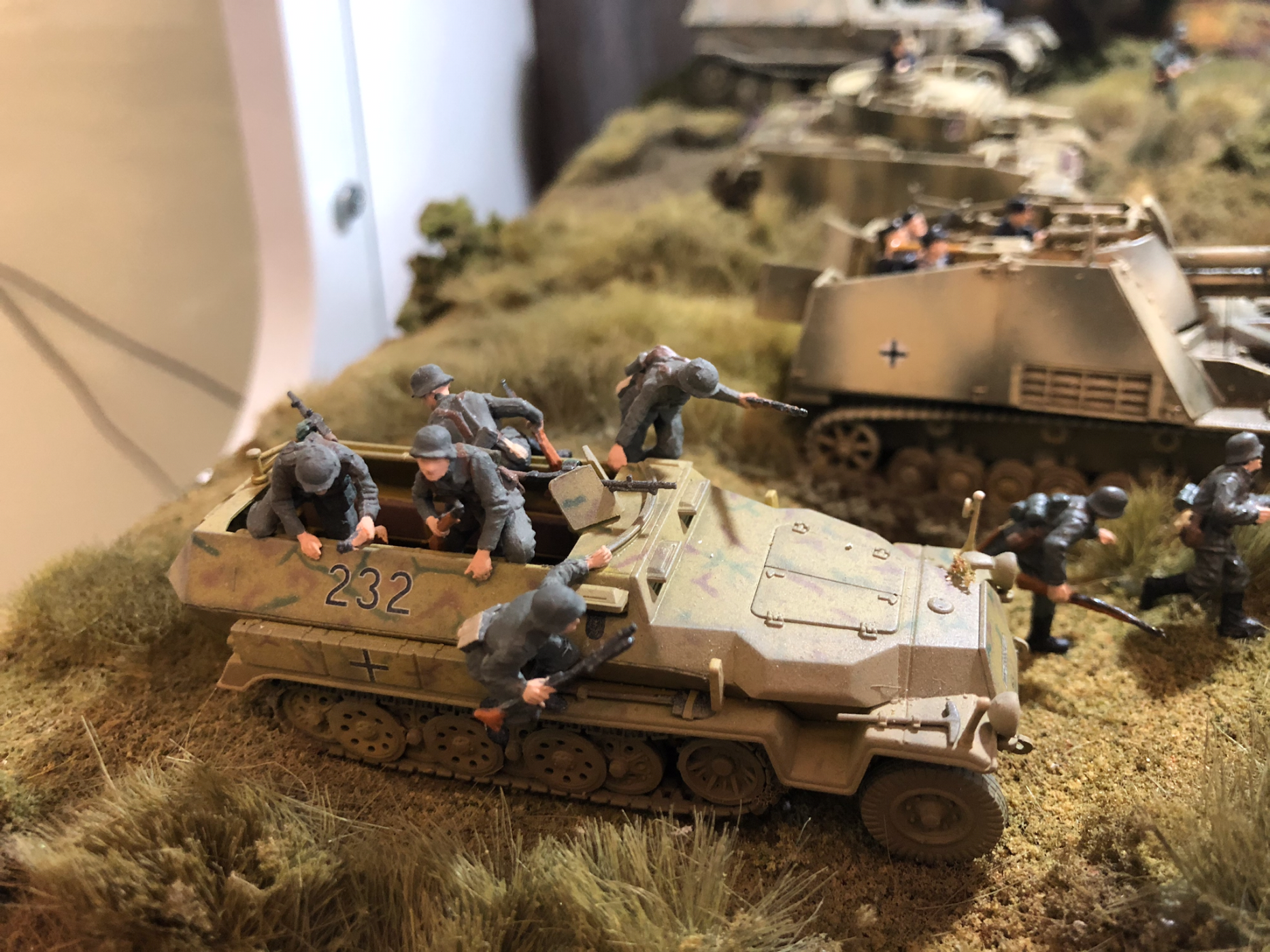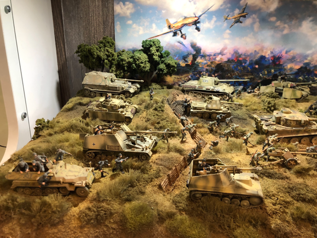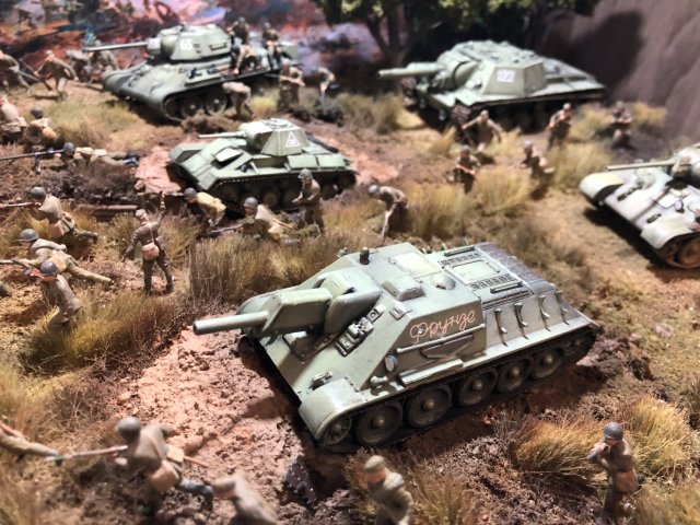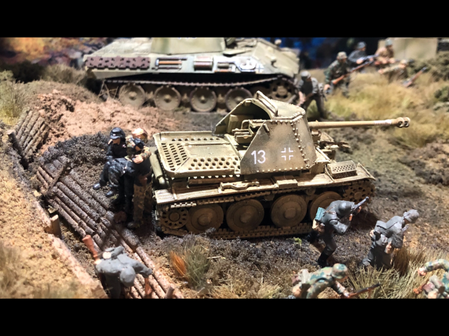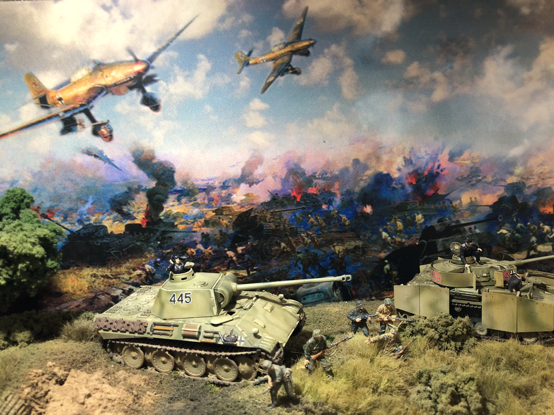 на мой взгляд в диораме не хватает сюжета. больше похоже на военный музей техники которая принимала участие в боях. я так понимаю взрывать и ломать технику автор не хотел. а без этого, без взрывов, без дыма, без гари увы ...... на заднем плане на картинке все показано. если я бы такое делал то попытался бы сделать как на картинке. или развел бы войска и сюжет был бы за минуту до начала.