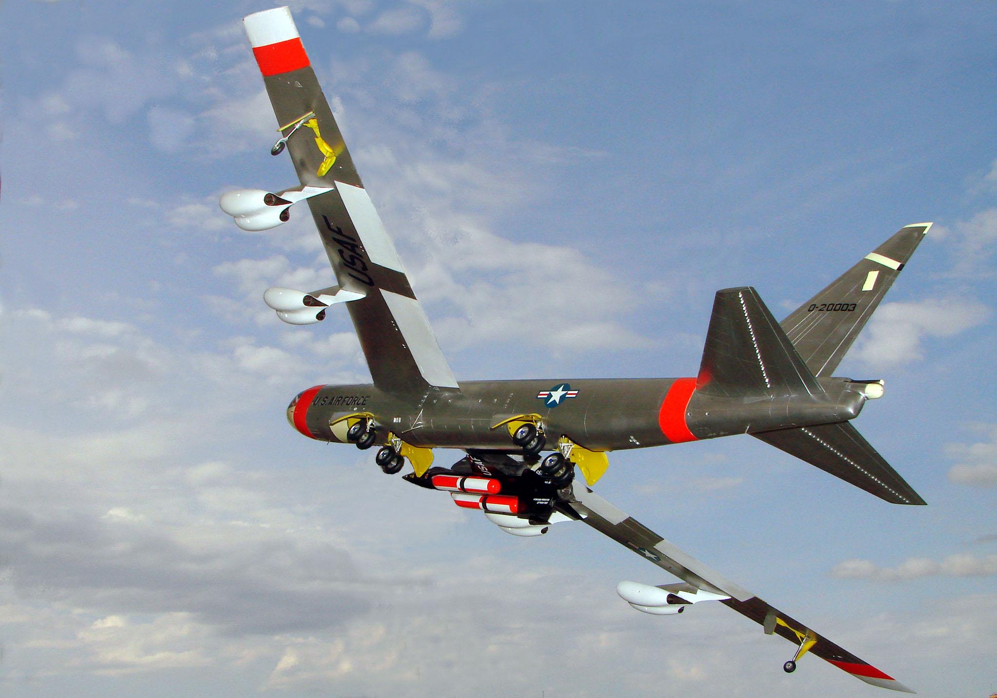 В процессе проведения испытаний ракетоплана Х-15носители NВ-52А (борт 20003) и NВ-52В (борт 20008) несколько раз меняли свою окраску. Первоначально (конец 1959 г.) у них помимо контрастных красно-оранжевых полос на крыле и фюзеляже в такой же цвет были окрашены носовые части мотогондол и целиком кили. К середине 1964 г. красно-оранжевых полосы остались только на фюзеляже и крыле. В таком варианте окраски носителей начались испытания модификации Х-15А-2 с подвесными топливными баками. А к концу 1967 г. контрастные полосы совсем исчезли, поскольку самолёты перекрасили в тусклый серебристо-серый цвет. Именно в этом варианте раскраски Monogram выпустил в 1987 г. ограниченным тиражом набор под названием «B-52 with X-15», докомплектованный моделью ракетоплана Х-15А-2 и литником с пилоном для его установки под крылом. Лет десять назад я видел такой набор в магазине «Техника-молодёжи» в Олимпийском. История программы Х-15 подробно описана в книге Dennis Jenkins & Tony Landis. HYPERSONIC. The story of North American X-15. Speciality press. USA, 2003, которой я руководствовался при выборе варианта окраски модели. В настоящее время NВ-52А и NВ-52В хранятся в музеях и в Интернете можно найти их детальные фотосессии.
