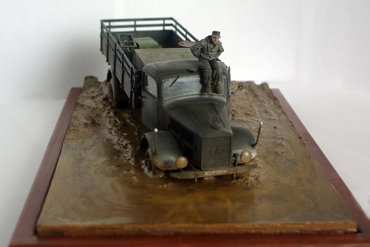Основная идея - попробовать сделать грязь, впервые поработать с брезентом и мелким инвентарем. И как нельзя лучше для этого подошла задумка с застрявшем в нашей родимой немецкой технике. Поиск фото привел к нескольким версиям - выше фото выложил по грузовику, были еще немецкая тройка и мотоцикл. Уж очень руки чесались, в наличии под рукой был мерс, поэтому в его пользу это сыграло. Далее просто - ехал Ганс по нашей дороге, не рассчитал вязкость жижи, а может привод задний сломан был - увяз бедняга. Вылез, забрался повыше и ждет попутку, может кто дёрнет.