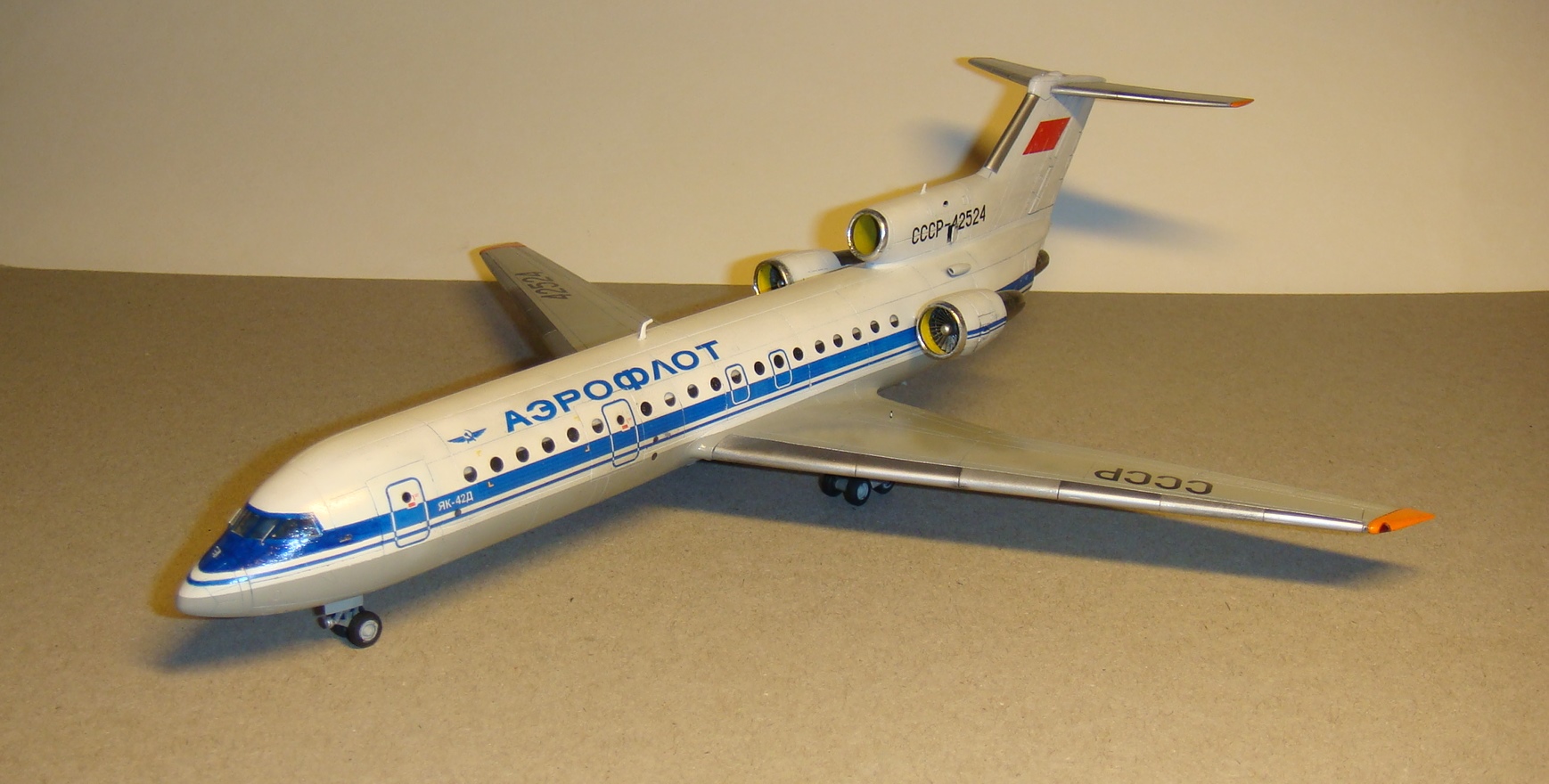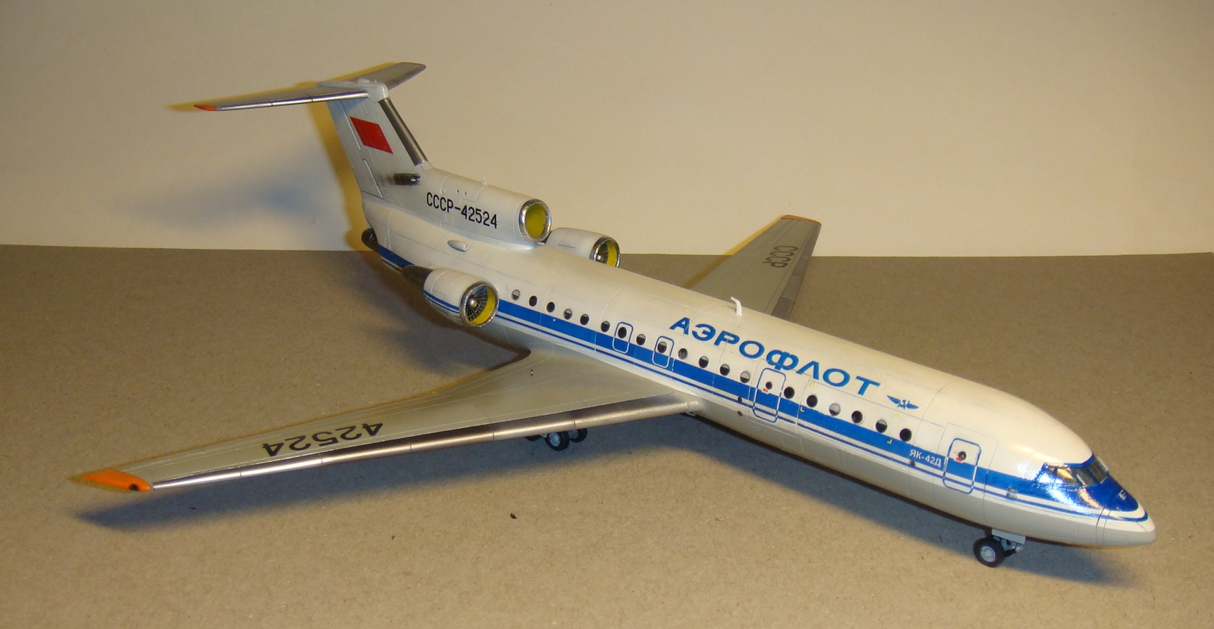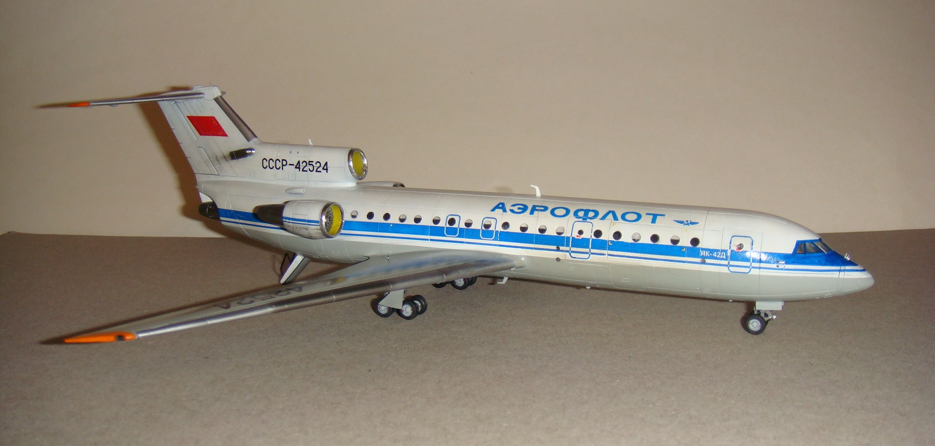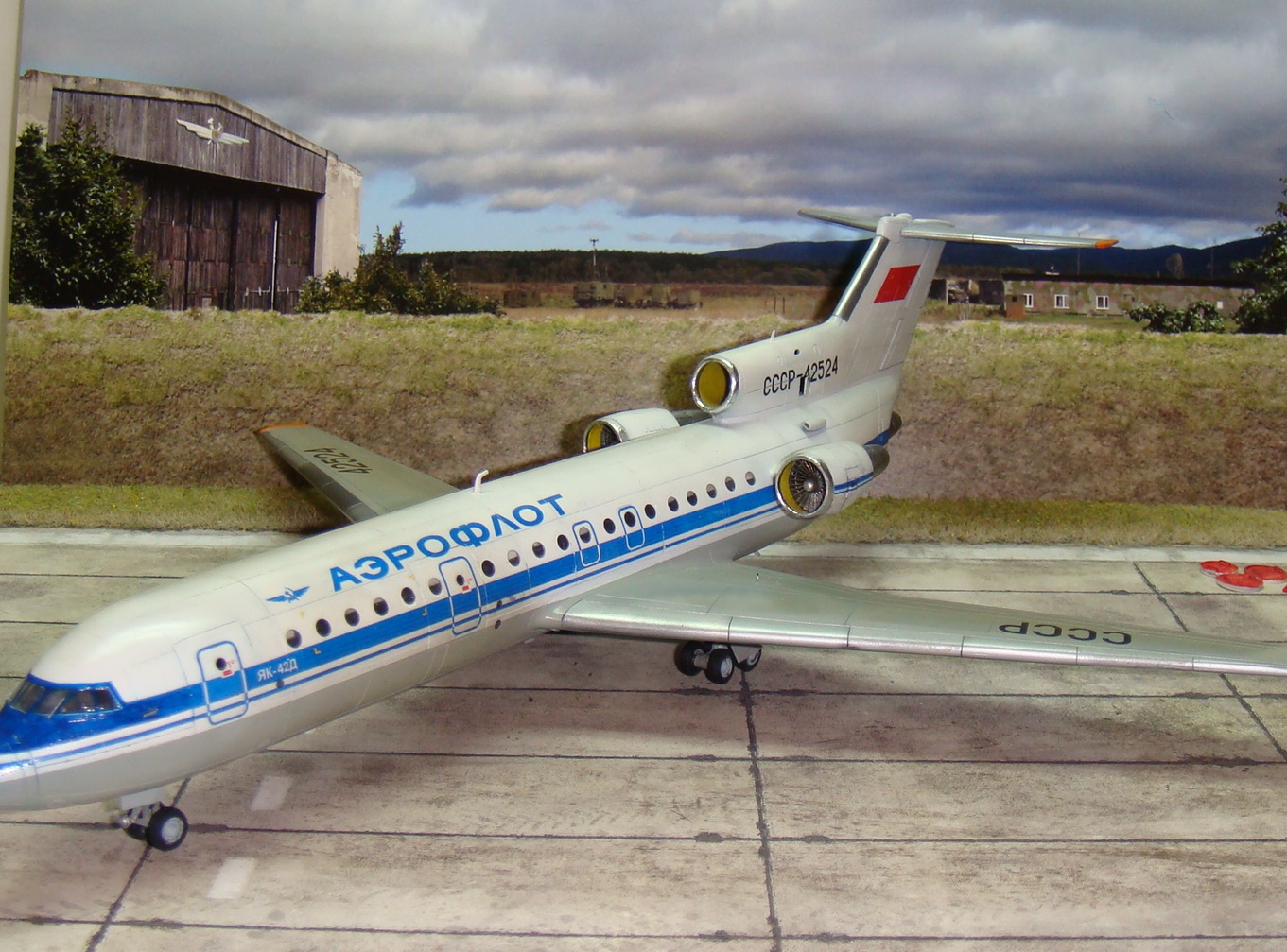 Доброго времени суток, уважаемые коллеги. Разрешите представить на всеобщее обозрение свою, модель известного самолёта Як-42Д СССР- 42524 в 144-ом масштабе от производителя Восточный Экспресс. Для тех, кому интересно, небольшая справка по самолету. Завод изготовитель: САЗ г. Саратов. Бортовой номер 42524, заводской номер: 11030603, дата выпуска: 23 сентября 1980 г .С самого начала эксплуатации находился в МГА Аэрофлот СССР, Быковского УГА . На 2010 год - самый старый из летающих Як-42. С июня 2012 года находится на хранении в ЛИИ. Решил сделать его так как стройка начиналась одновременно с Як-42 АЛК. Ну и конечно нужно было доделать эту модель. Сам процесс стройки не очень приятный. Все прекрасно знают наборы от Восточного Экспресса. "Геморрой " - еще тот. Подробно всю стройку описывать не вижу надобности из-за того, что абсолютно все детали данного набора надо точить, пилить, шпаклевать, обрабатывать и приводить в приличный вид. Обработке подверглось ВСЁ. Остекление пилотов делал из набора дополнения AWM для Як-42. Остекления иллюминаторов залил изнутри жидкой прозрачной смолой, которая хорошо обрабатывается и полируется и самое главное не меняет свою прозрачность. Родное остекление иллюминаторов были отправлены в помойку. На этой модели, решил в первый раз, сделать открываемый задний входной трап, вроде получилось. БАНО,Фары и Проблесковые от Эльф. грунтовал Мистер Хобби 1200. Красил Тамией акрил матовый. Глянцевый лак. Декаль самодельная. Фото, как всегда, не получились. Выкладываю фото которые посчитал более удачными. Переснимал модель раза четыре, поэтому разные фоны. В заключении немного фото готовой окрашенной модели. Сразу прошу прощения и не судите строго за качество фото, я не фотограф, да и фотоаппарата хорошего нет, только "мыльница". Приятного просмотра. С уважением. Андрей