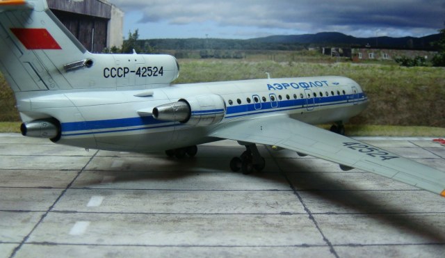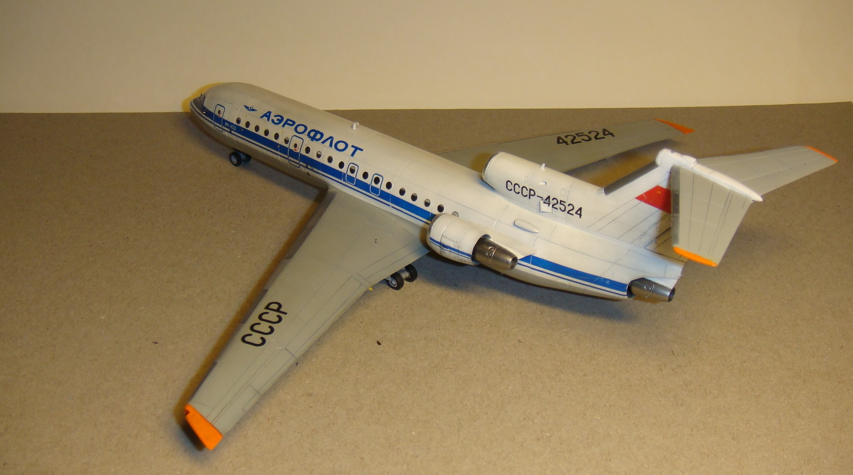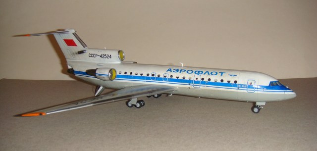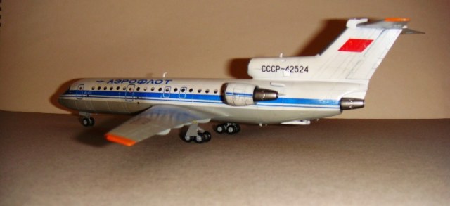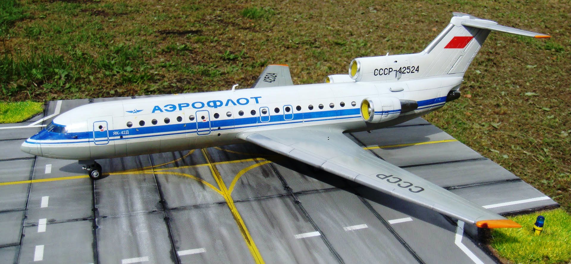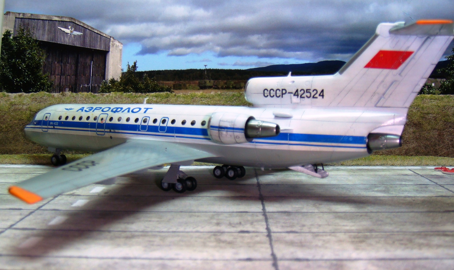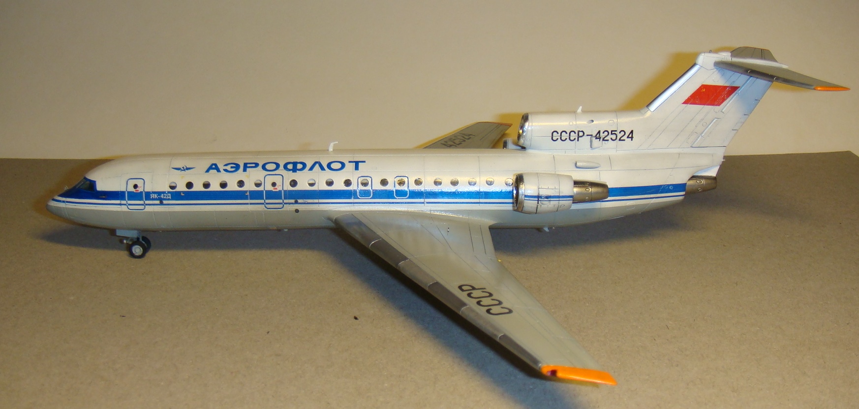 Доброго времени суток, уважаемые коллеги. Разрешите представить на всеобщее обозрение свою, модель известного самолёта Як-42Д СССР- 42524 в 144-ом масштабе от производителя Восточный Экспресс. Для тех, кому интересно, небольшая справка по самолету. Завод изготовитель: САЗ г. Саратов. Бортовой номер 42524, заводской номер: 11030603, дата выпуска: 23 сентября 1980 г .С самого начала эксплуатации находился в МГА Аэрофлот СССР, Быковского УГА . На 2010 год - самый старый из летающих Як-42. С июня 2012 года находится на хранении в ЛИИ. Решил сделать его так как стройка начиналась одновременно с Як-42 АЛК. Ну и конечно нужно было доделать эту модель. Сам процесс стройки не очень приятный. Все прекрасно знают наборы от Восточного Экспресса. "Геморрой " - еще тот. Подробно всю стройку описывать не вижу надобности из-за того, что абсолютно все детали данного набора надо точить, пилить, шпаклевать, обрабатывать и приводить в приличный вид. Обработке подверглось ВСЁ. Остекление пилотов делал из набора дополнения AWM для Як-42. Остекления иллюминаторов залил изнутри жидкой прозрачной смолой, которая хорошо обрабатывается и полируется и самое главное не меняет свою прозрачность. Родное остекление иллюминаторов были отправлены в помойку. На этой модели, решил в первый раз, сделать открываемый задний входной трап, вроде получилось. БАНО,Фары и Проблесковые от Эльф. грунтовал Мистер Хобби 1200. Красил Тамией акрил матовый. Глянцевый лак. Декаль самодельная. Фото, как всегда, не получились. Выкладываю фото которые посчитал более удачными. Переснимал модель раза четыре, поэтому разные фоны. В заключении немного фото готовой окрашенной модели. Сразу прошу прощения и не судите строго за качество фото, я не фотограф, да и фотоаппарата хорошего нет, только "мыльница". Приятного просмотра. С уважением. Андрей