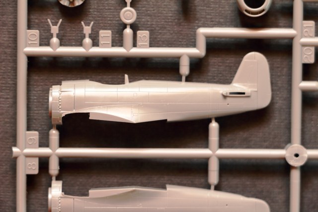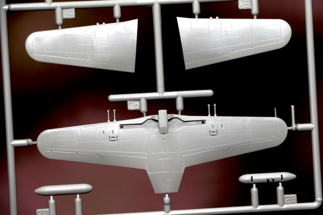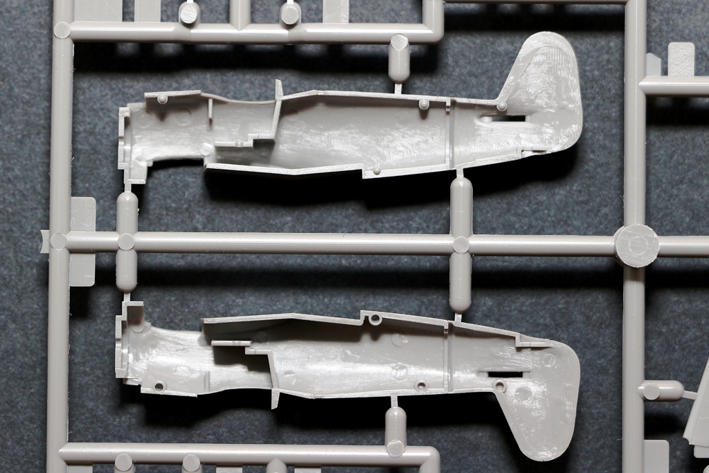 Итак, стандартная для Platz коробочка с боковым клапаном (размер точь-в-точь как у моделей SWEET). На лицевой стороне бокс-арт с мирно летящим истребителем, на оборотной схема окраски на пять вариантов, в цветах Mr.Colorи Model Master. Вроде все как обычно для 144-го масштаба: два литника с деталями модели непосредственно самолета, два прозрачных с фонарем кабины. Инструкция и листок с декалями. Но рассмотрев литники внимательнее, говоришь себе: «офигеть». Остается только восхищаться умением японских мастеров сделать маленький шедевр в «слепом» масштабе. Фонарь кабины тончайший, некоторым производителям моделей самолетов в более крупных масштабах стоит поучиться. Очень понравилась расшивка — в меру тонкая и глубокая. На острых гранях винта присутствует небольшой облой, который убрать не составит труда. Декаль от «Cartograf” в представлении не нуждается, есть даже переплет фонаря кабины (прощайте, маски). Правда, если захочется сделать «оранжевый» вариант окраски, с масками все равно придется помучиться. Удивили совершенно пустые ниши шасси - для этого масштаба такое допускается, но для модели заданного высокого уровня можно было бы изобразить элементы механизации.