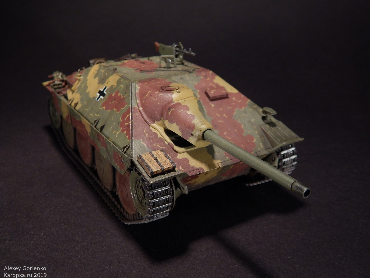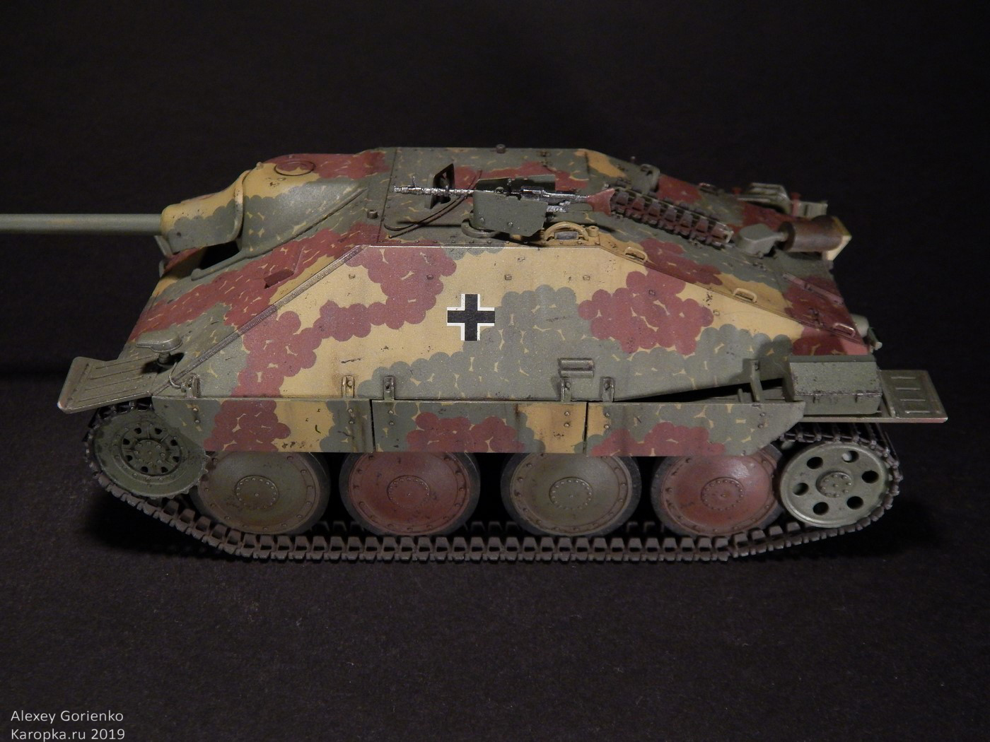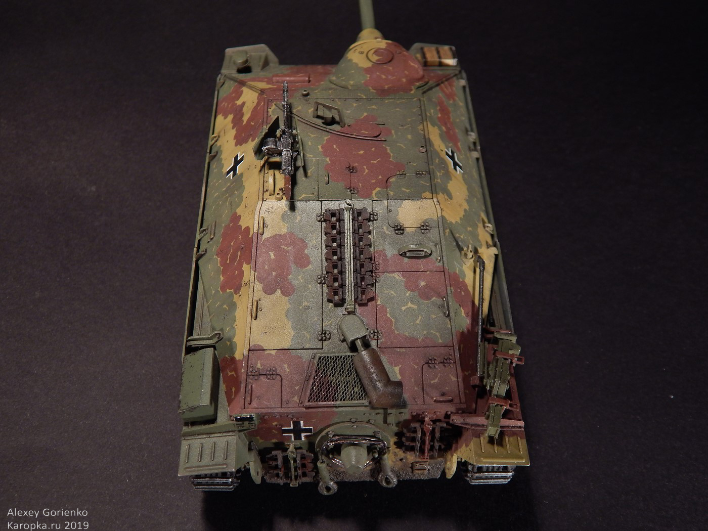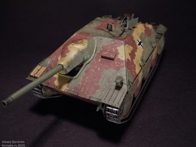 Так что, все это дело было смыто в кроте и, поскольку маски для камуфляжа были испорчены, я уже решил красить как захочется. Захотелось мне реализовать дисковый камуфляж. В основном, по той причине, что камуфляж оригинального прототипа, на который ссылается Академ, уж очень на него похож. Не точно он, но похож. Опять же - у этого камуфляжа одни плюсы - исторически существовал, делать его было интересно, модель с ним выглядит тоже интересно.