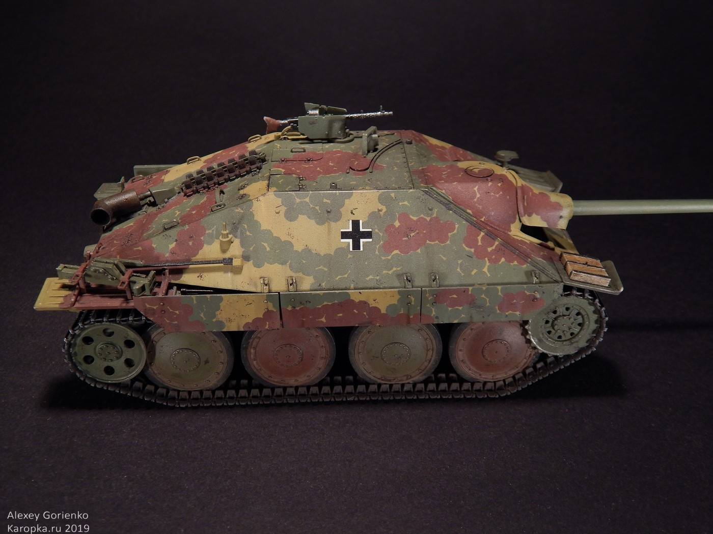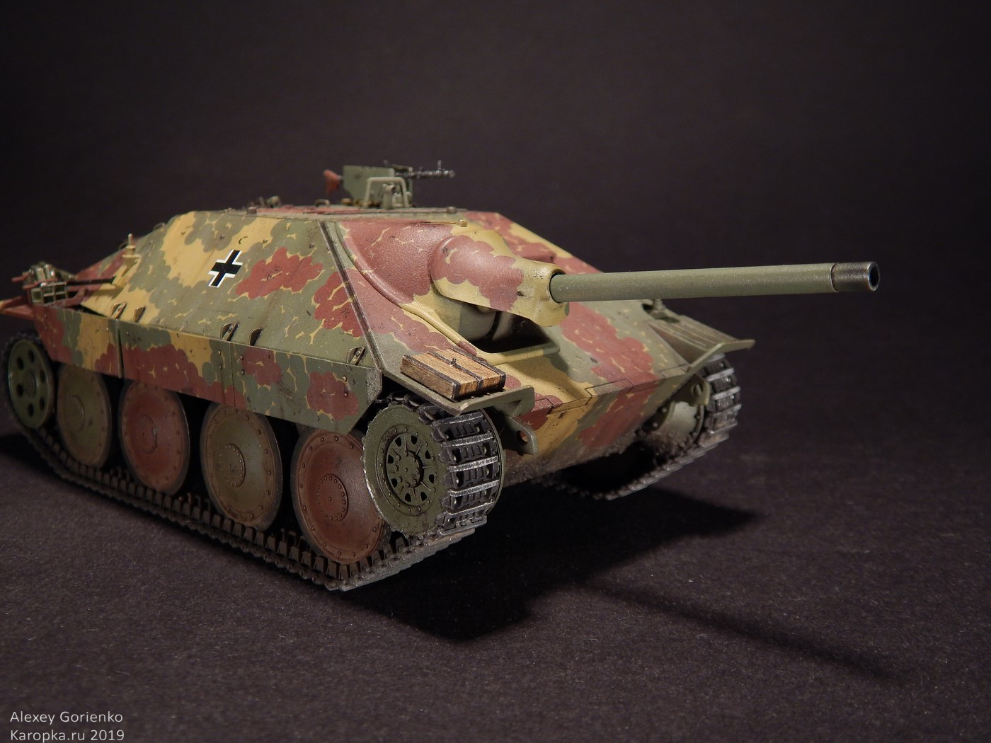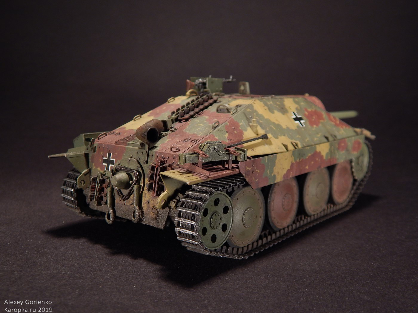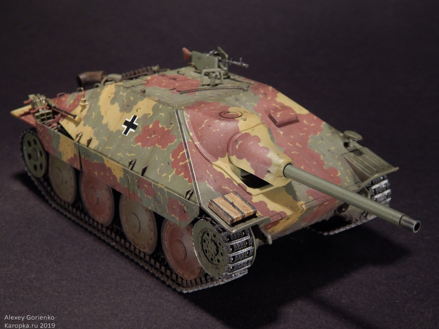 Так что, все это дело было смыто в кроте и, поскольку маски для камуфляжа были испорчены, я уже решил красить как захочется. Захотелось мне реализовать дисковый камуфляж. В основном, по той причине, что камуфляж оригинального прототипа, на который ссылается Академ, уж очень на него похож. Не точно он, но похож. Опять же - у этого камуфляжа одни плюсы - исторически существовал, делать его было интересно, модель с ним выглядит тоже интересно.