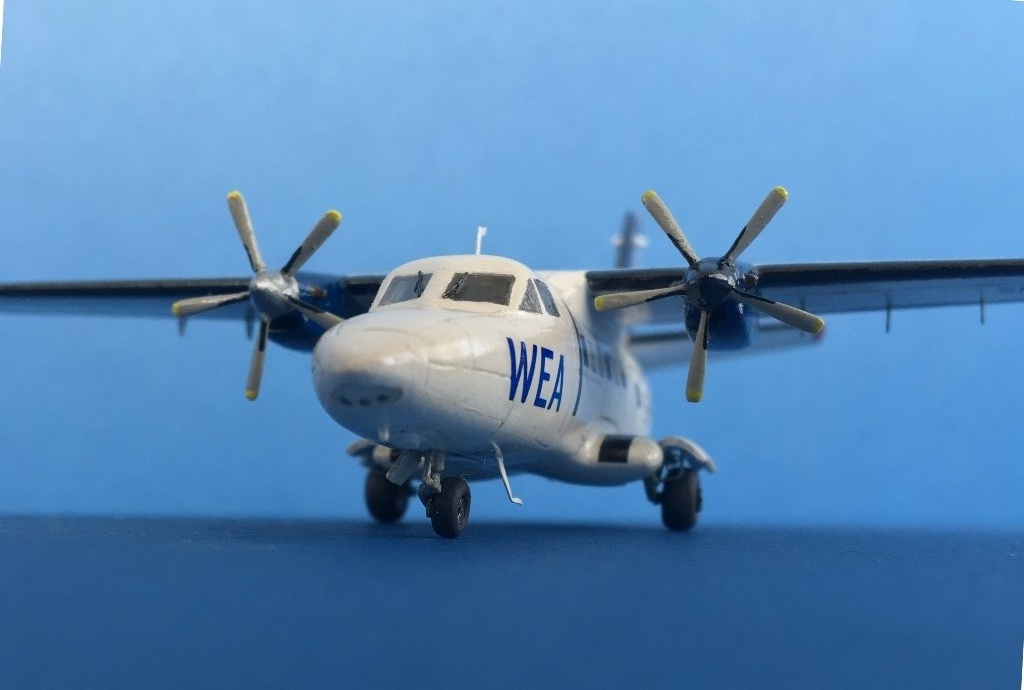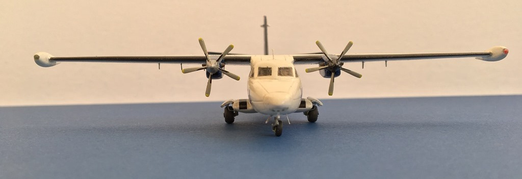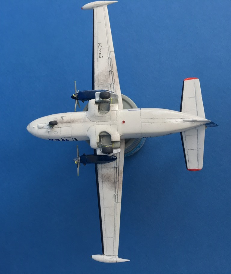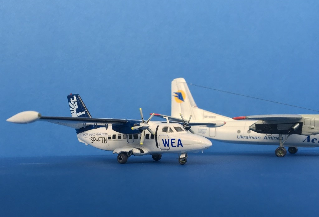 Модель традиционна для А Модела. В наборе -две "заготовки" для разных типов ельки. Конечно же, много неточностей, облоя, толстые кромки, слабенькая деталировка. Декальные иллюминаторы серого цвета - часть закрасил черным, типа опущенные шторки серые получились. От себя добавил антенны, БАНО, сточил немного кромки лопастей винтов, кромки стабилизаторов, добавил в шасси стойки-гидравлики, щетки лобового стекла, поменял выхлопные трубы на двигателях на квадратного сечения, добавил на плоскостях тяги, чуть удлинил коки винтов, вставив кусочек пластика.